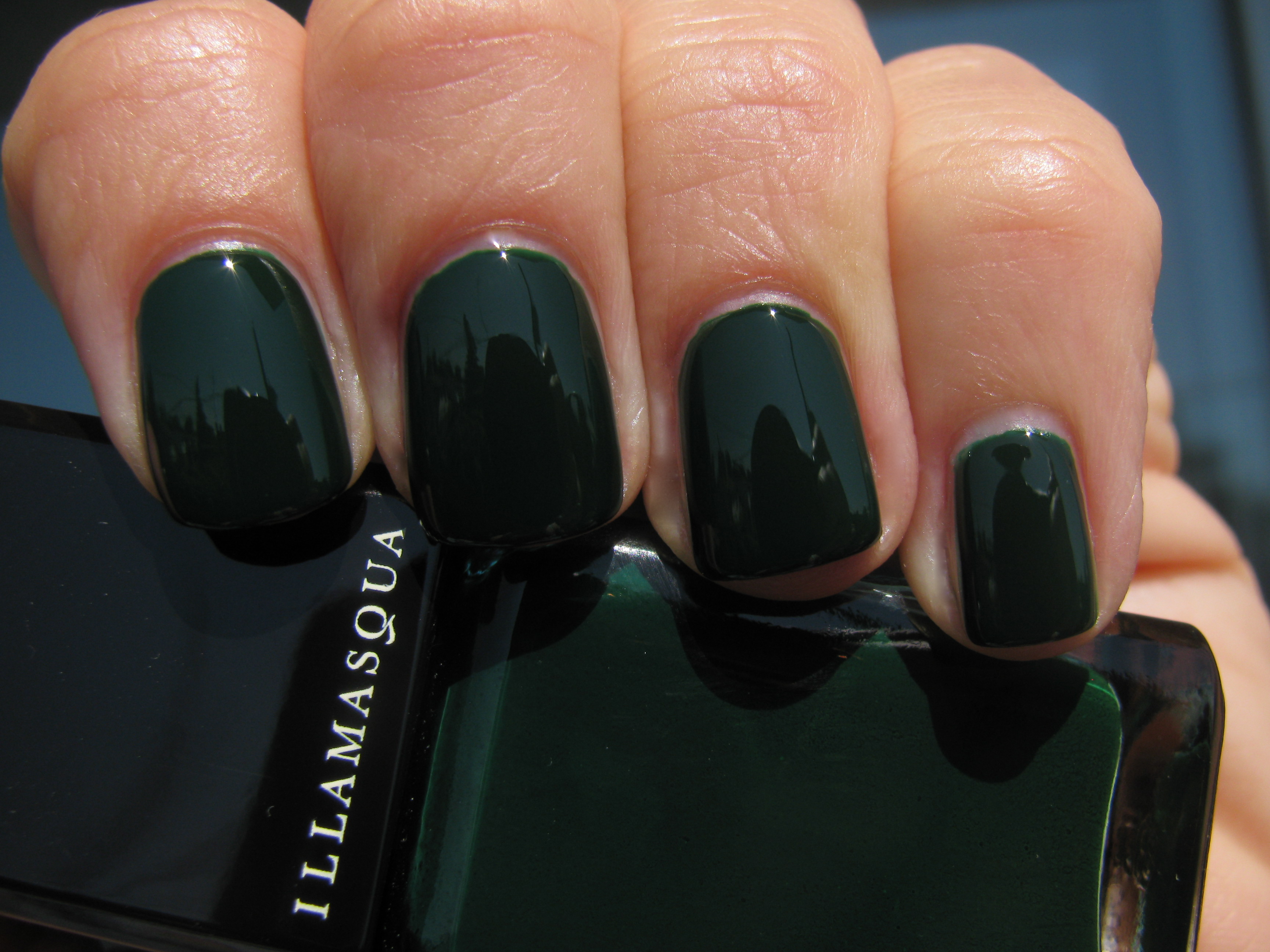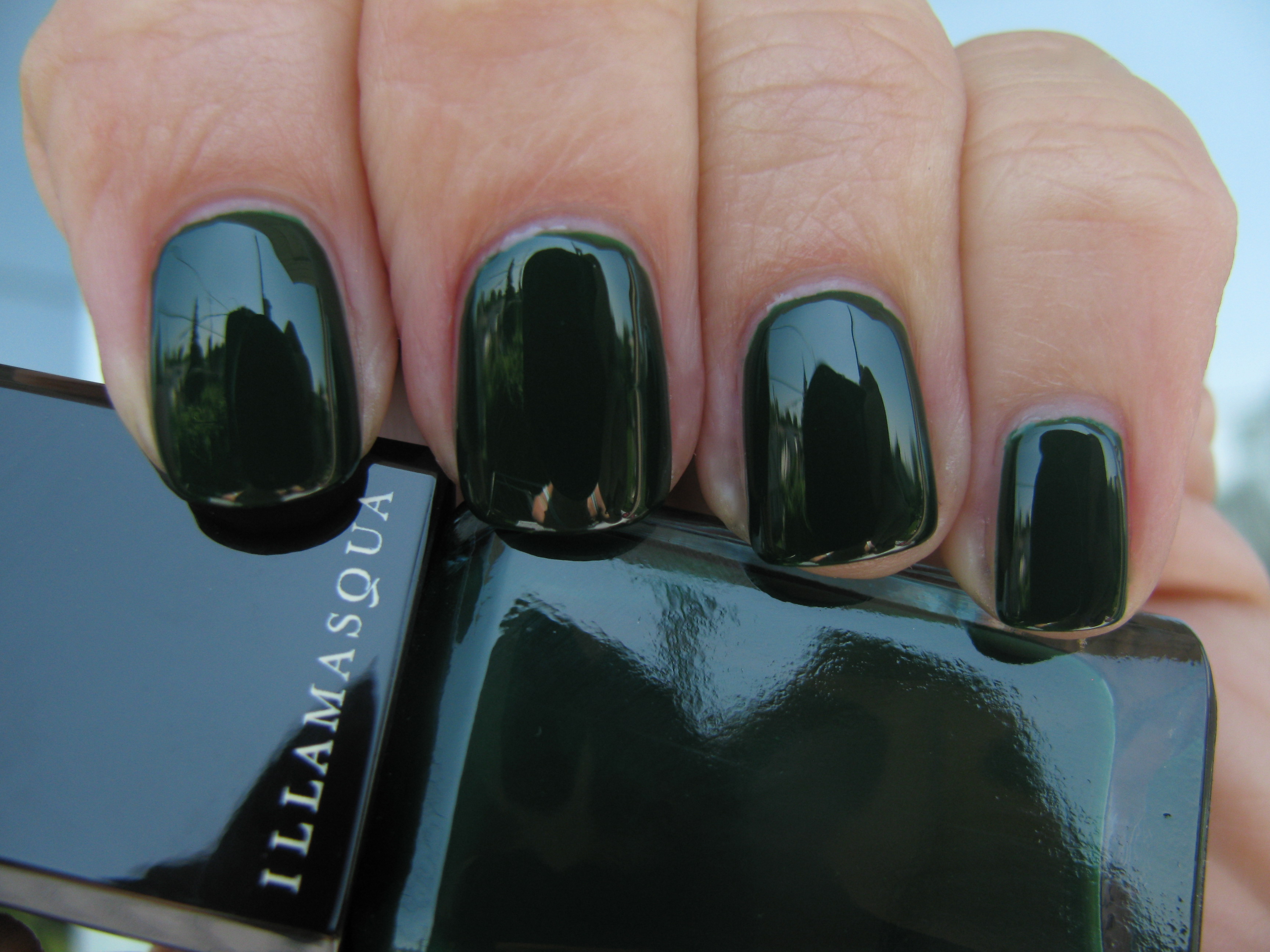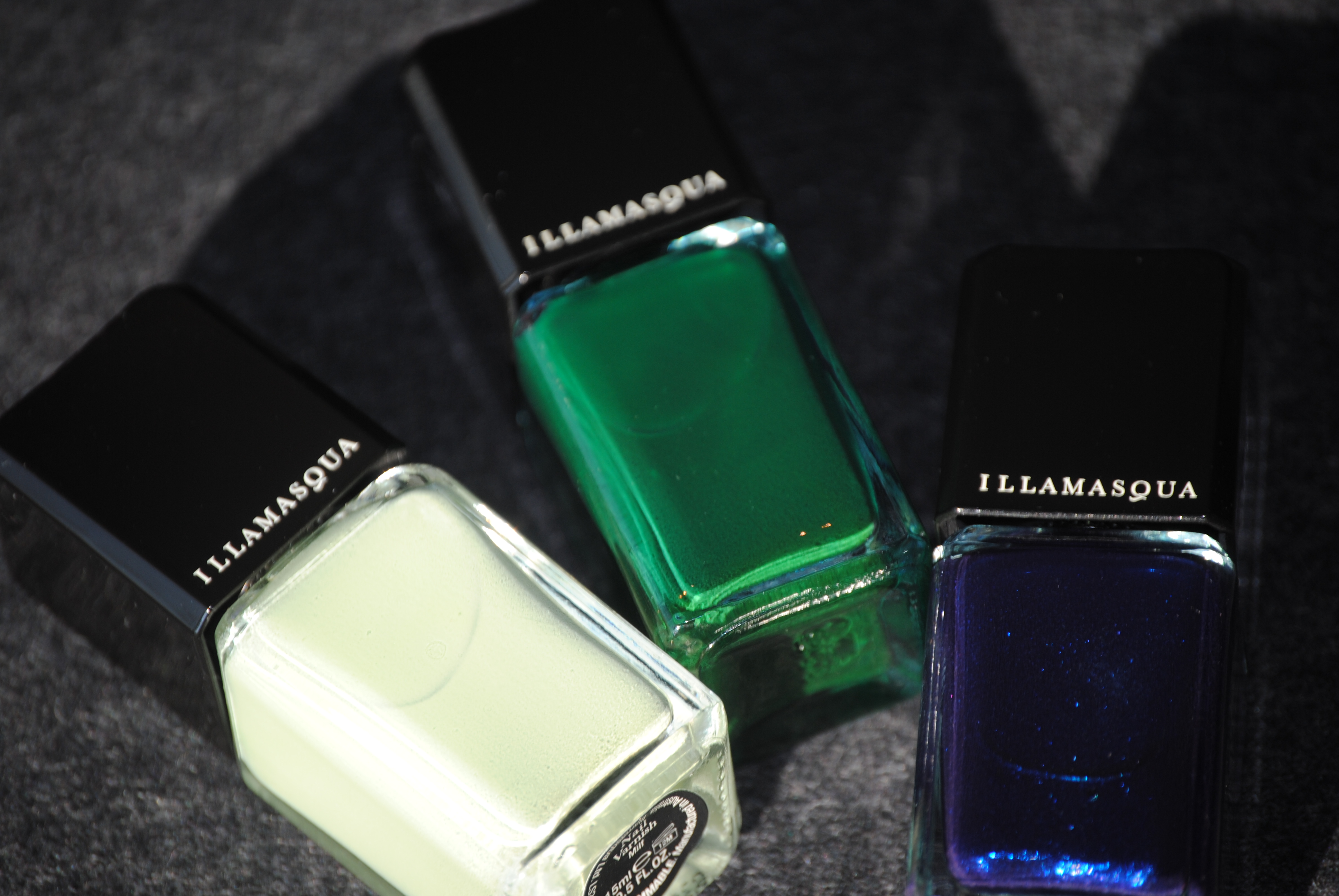 My first taste of Illamasqua came in the form of three of their cult nail varnishes: Rampage – a deep forest green, Phallic – a shimmery royal blue, and Milf – a milky mint green. I had heard so much about the brand and how amazing the formula was, but it wasn’t until I experienced it for myself that I felt truly “wowed”! There has been much said about the provocative names of their range, but in my opinion, it all goes hand in hand with the edgy image of the brand and I like to focus on the product itself, which is absolutely stellar. All swatches are with a-england ‘The Knight’ base coat & ‘The Shield’ top coat (reviewed here) and two coats of lacquer.