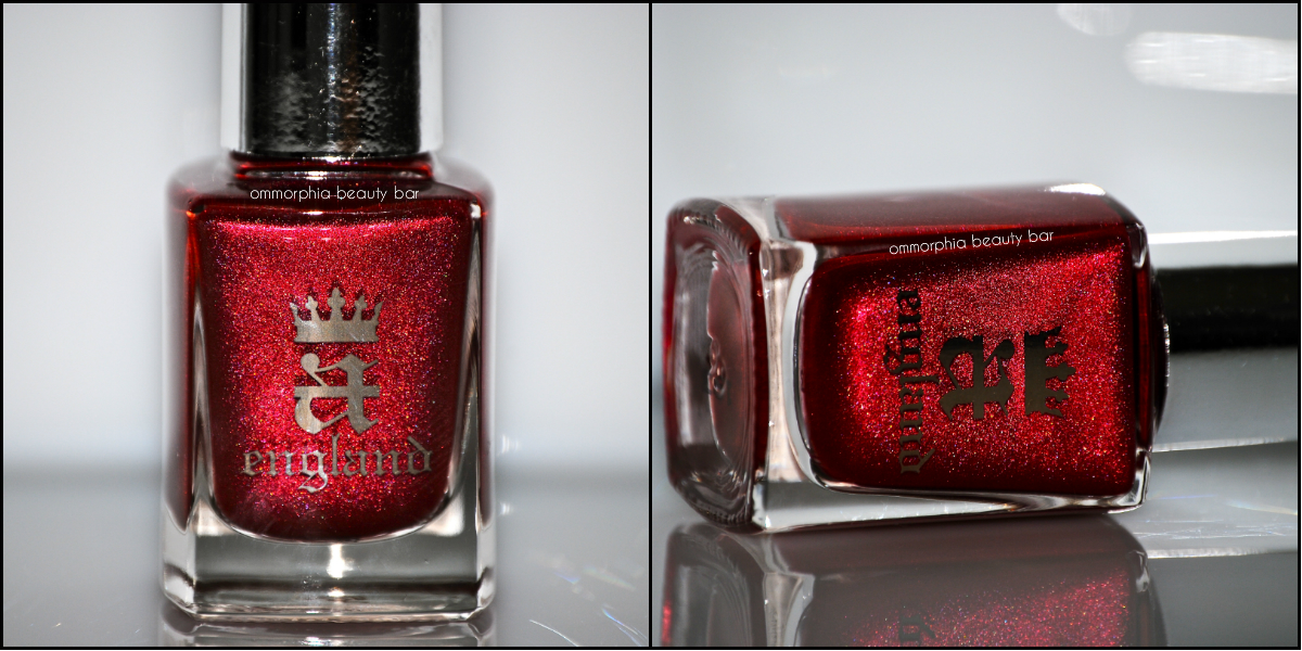 a-england – Rose Bower “Asleep in a bed of roses, her beauty still calls true” – a lustrous and true dark rose shade that holds an incredible luminosity albeit with the mildest prismatic effect of the four. The formula seemed the thickest of the group as well, but applies in a very easy manner and you barely need more than 1 coat for full coverage. Bonus: absolutely no staining left behind upon removal. Coats applied: 2, plus top coat