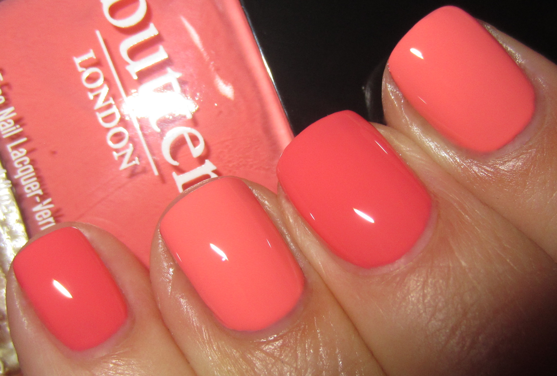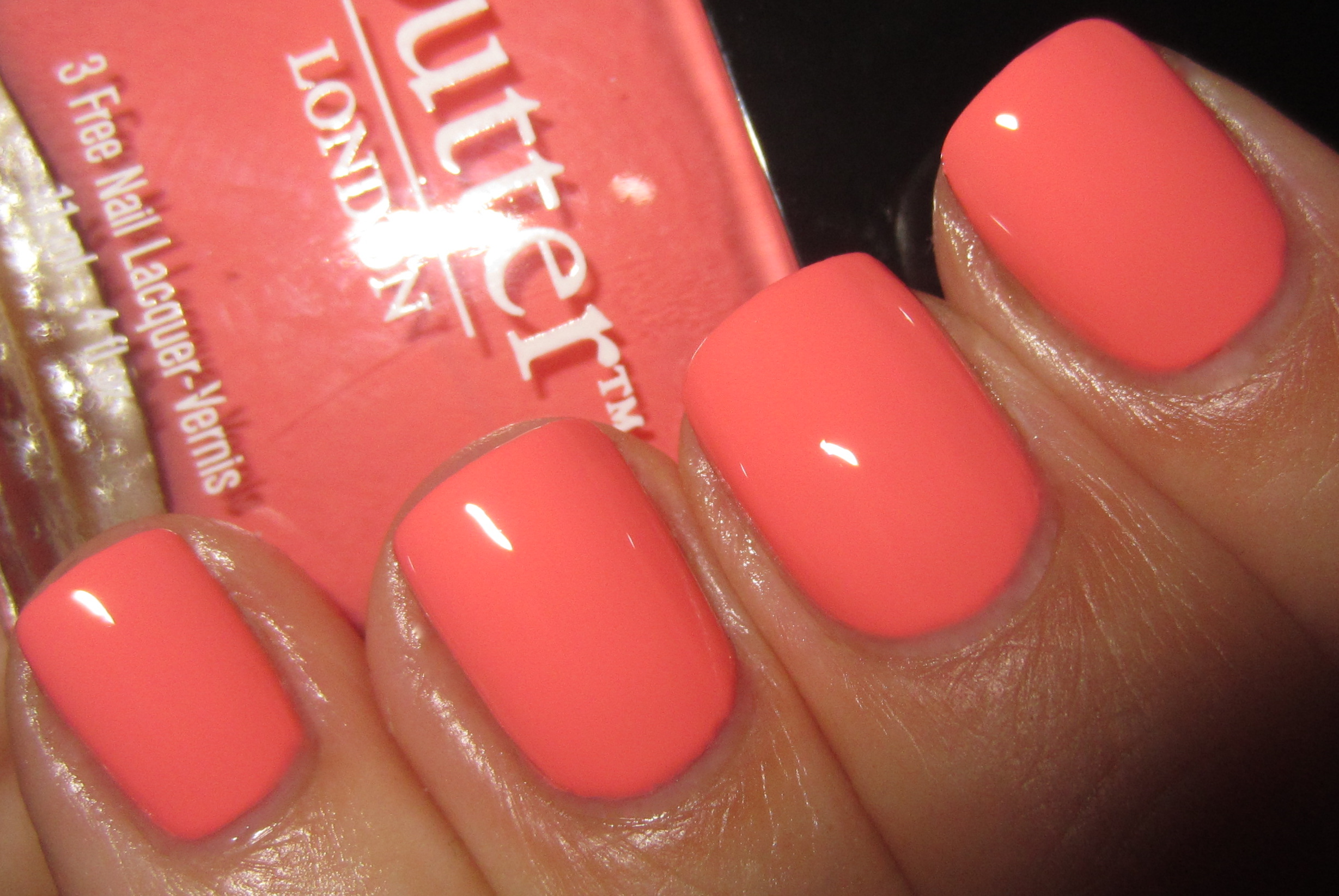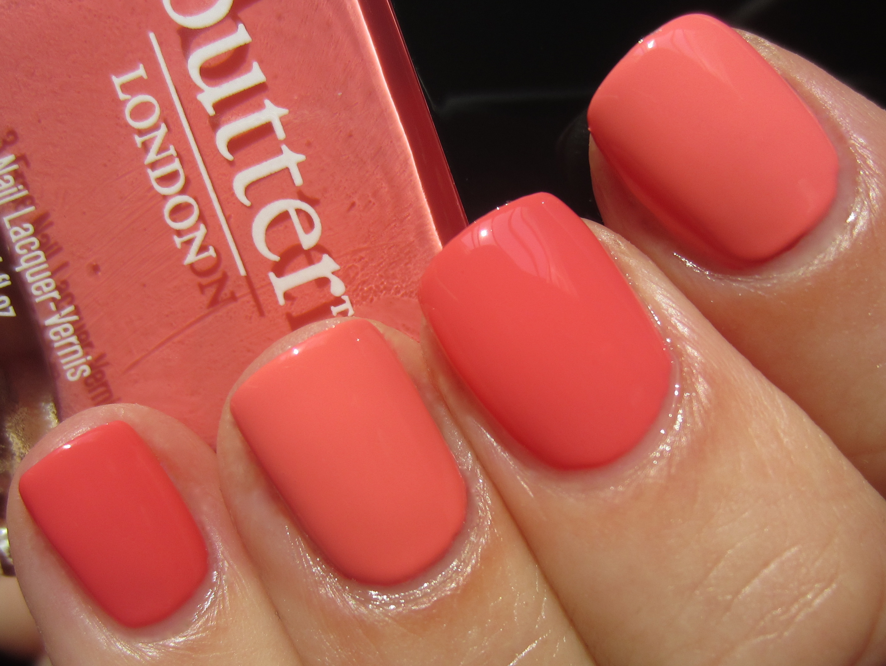 ‘Trout Pout‘ [slang for a woman who has overdone collagen lip injections, lending her a somewhat fishy face], is a paradoxically vivid yet dusty-looking salmon crème hue with some coral hints in the base for added depth. The formula was simply spectacular, flowing easily, levelling off perfectly and leaving a gorgeous glossy finish behind. With 2 coats you can reach good coverage, but I applied 3 here for consistency in the swatches.