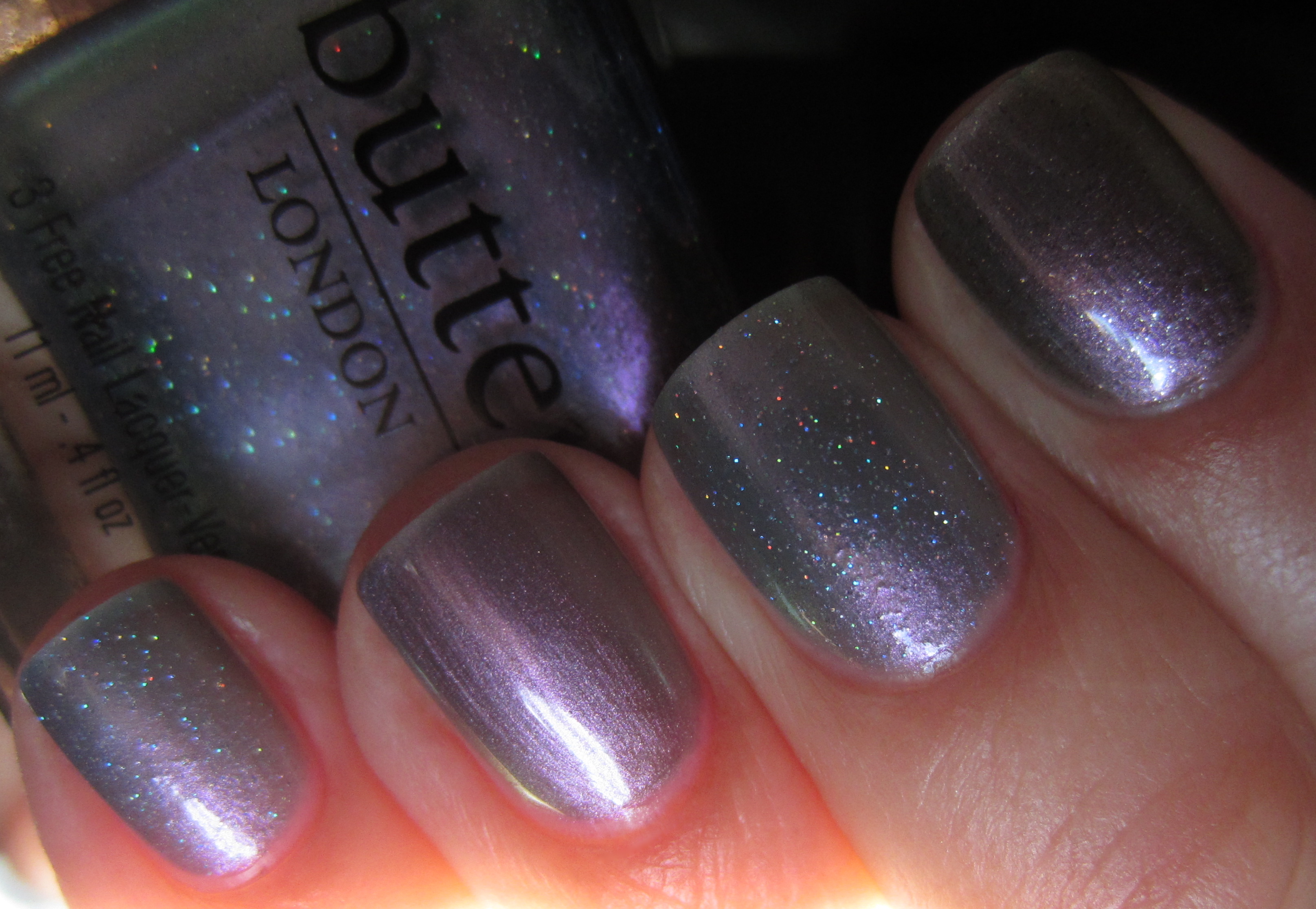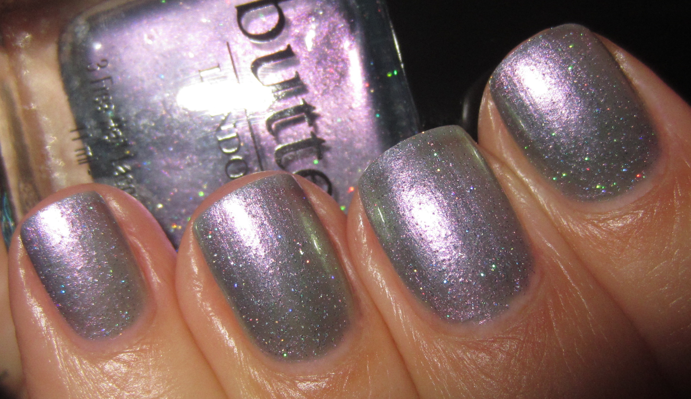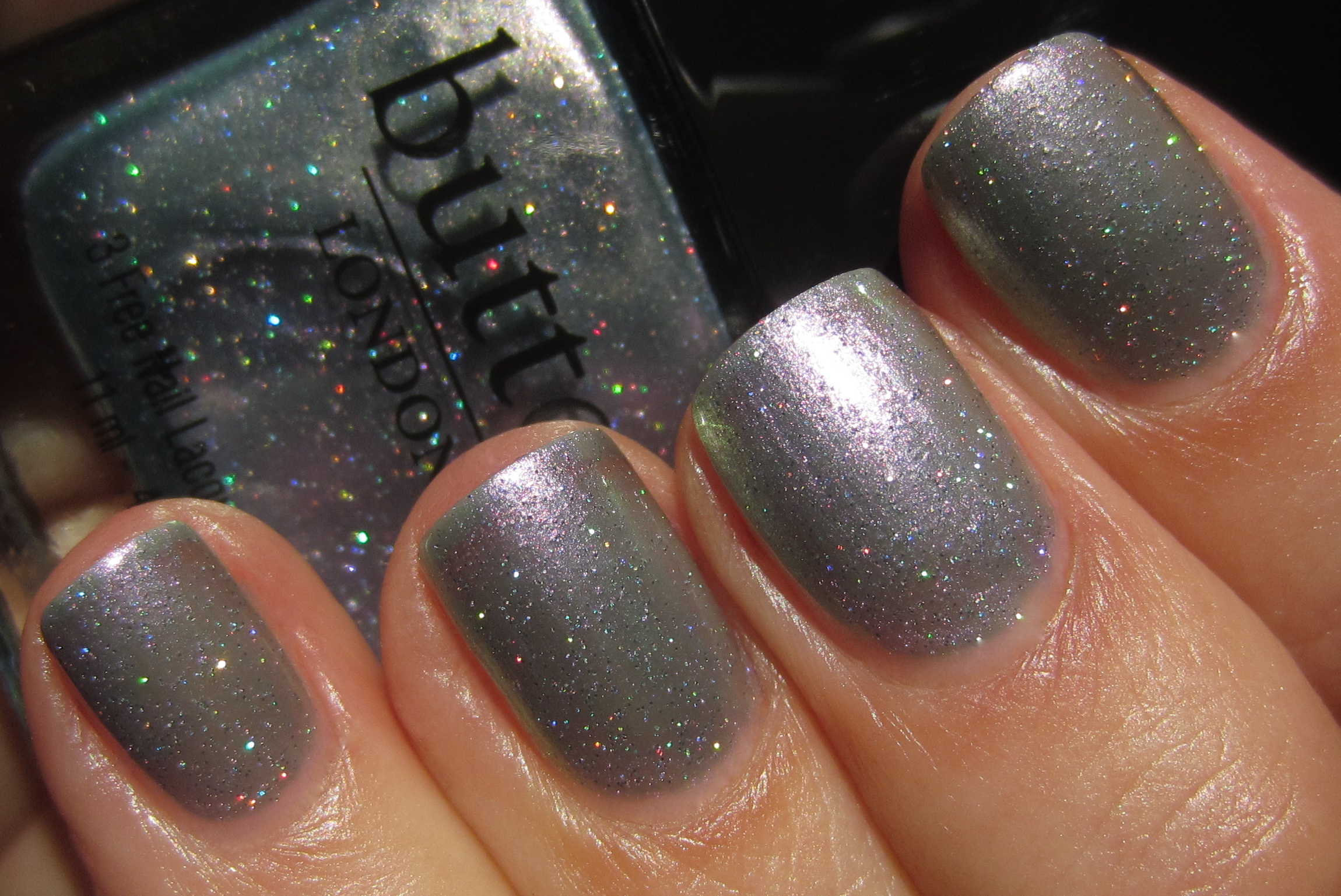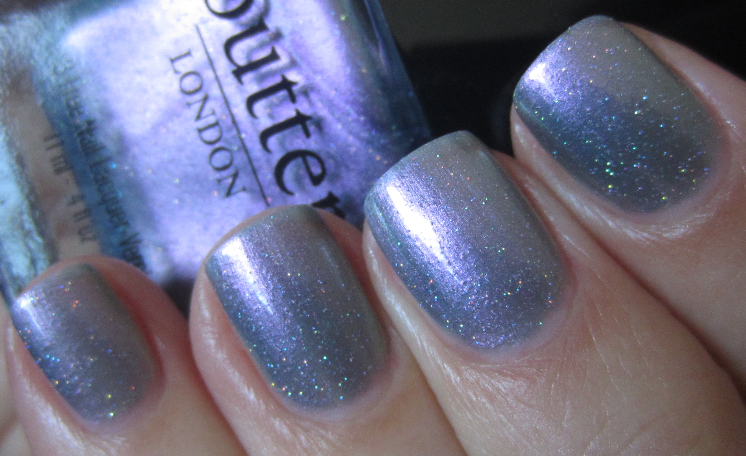 ‘Knackered‘ [to be tired or exhausted. “Wow, you look knackered – what did you get up to last night?”], is magical … it truly is! A chameleon-like shade, this is a sheer yet iridescent hue filled with ultra-fine polychromatic glitter that can flash either silver, turquoise, green or purple – depending on the light and your angle of view. For the following swatches I applied 3 coats, but I was surprised to find that good coverage was also achieved by the 2nd layer. As with ‘Disco Biscuit’, this varnish definitely benefits from at least 1-2 layers of top coat to really bring out all its intricate nuances.