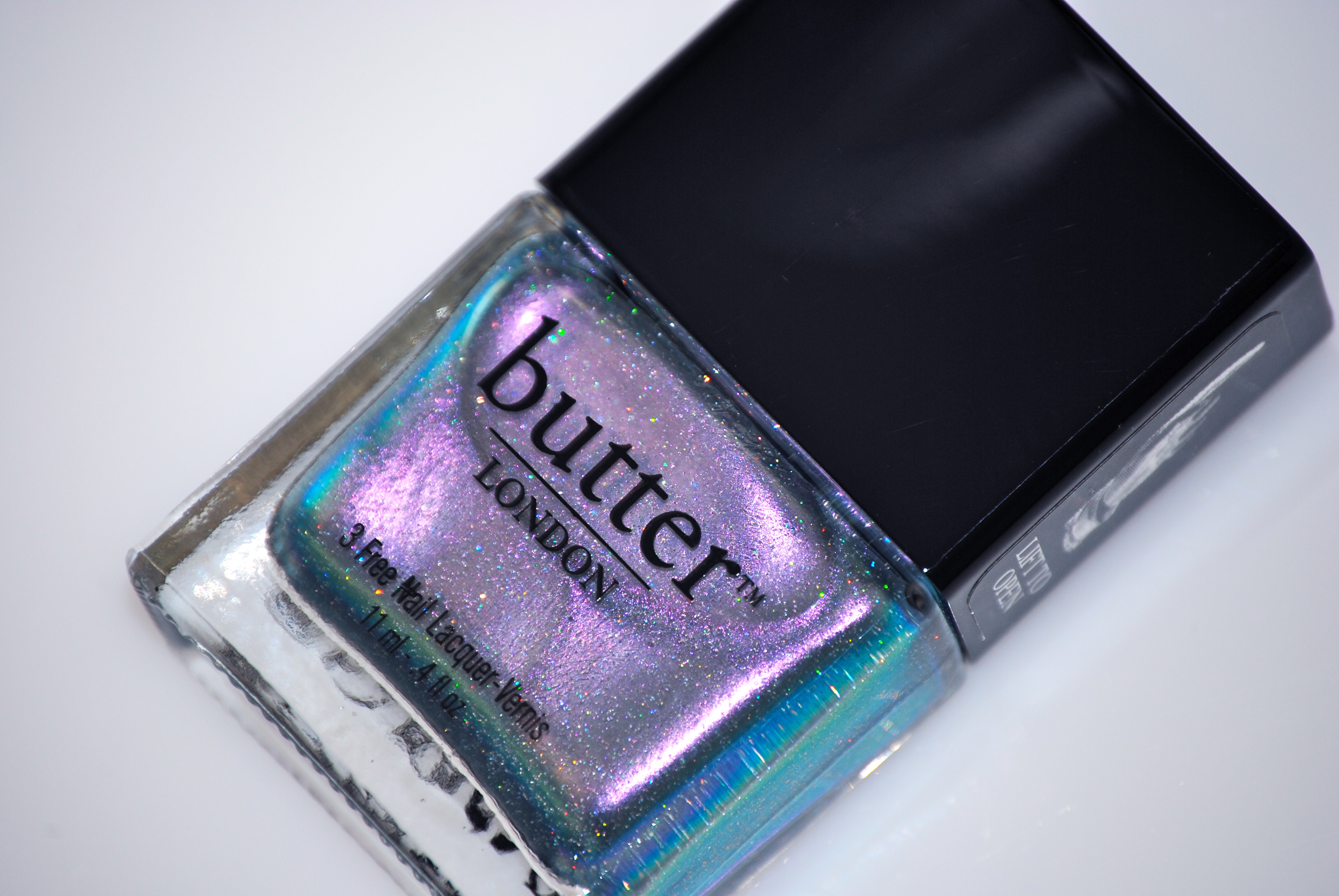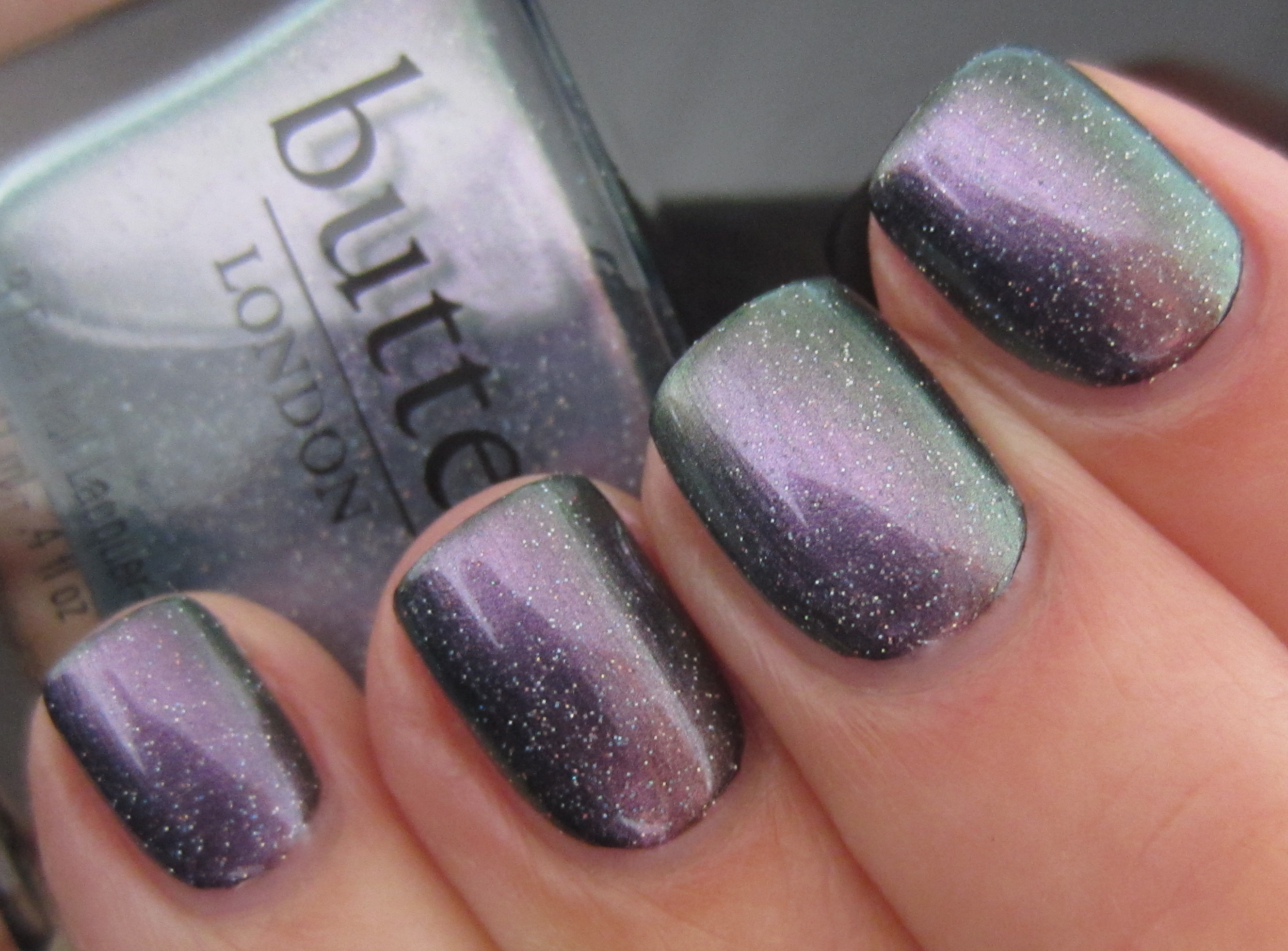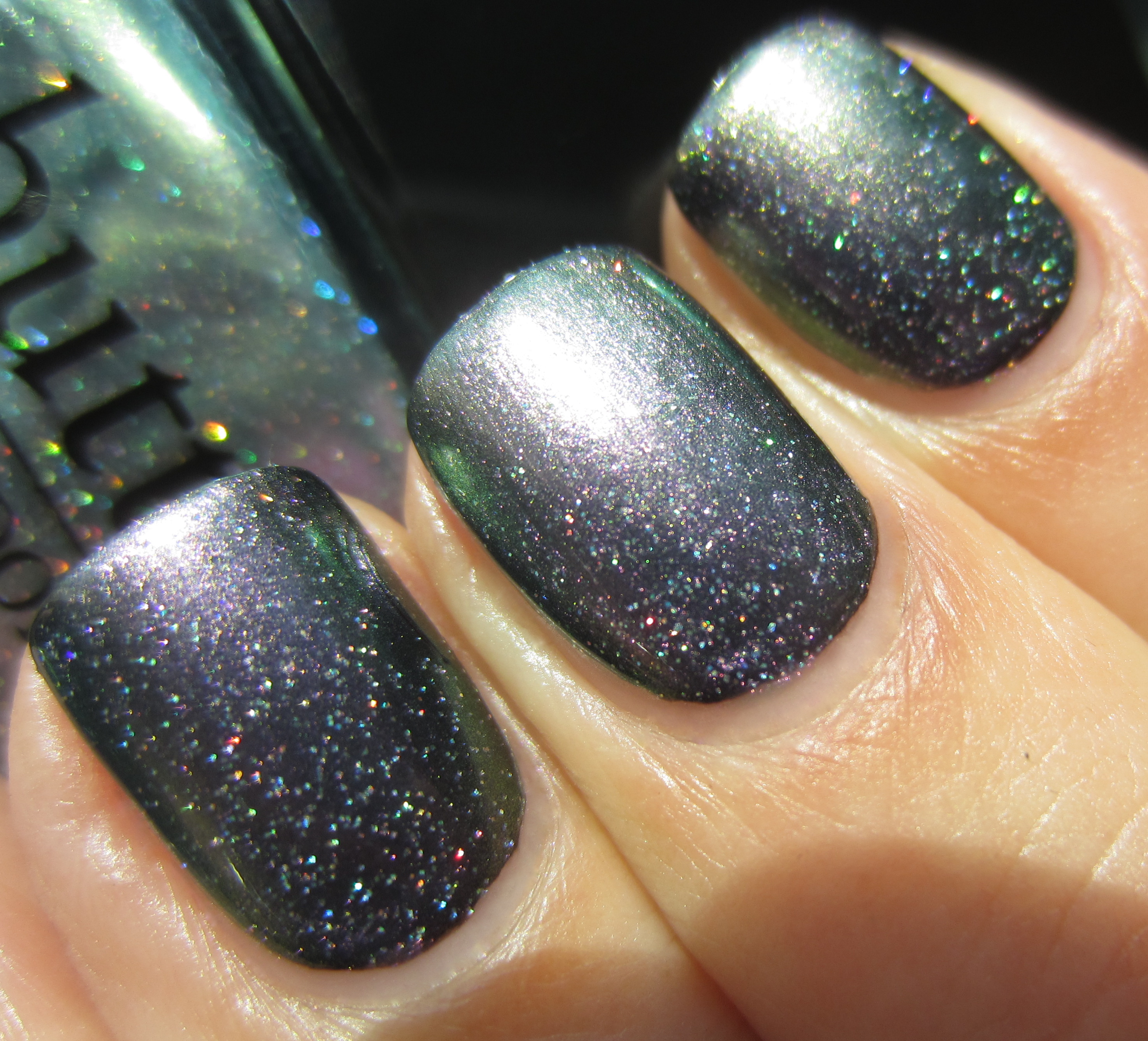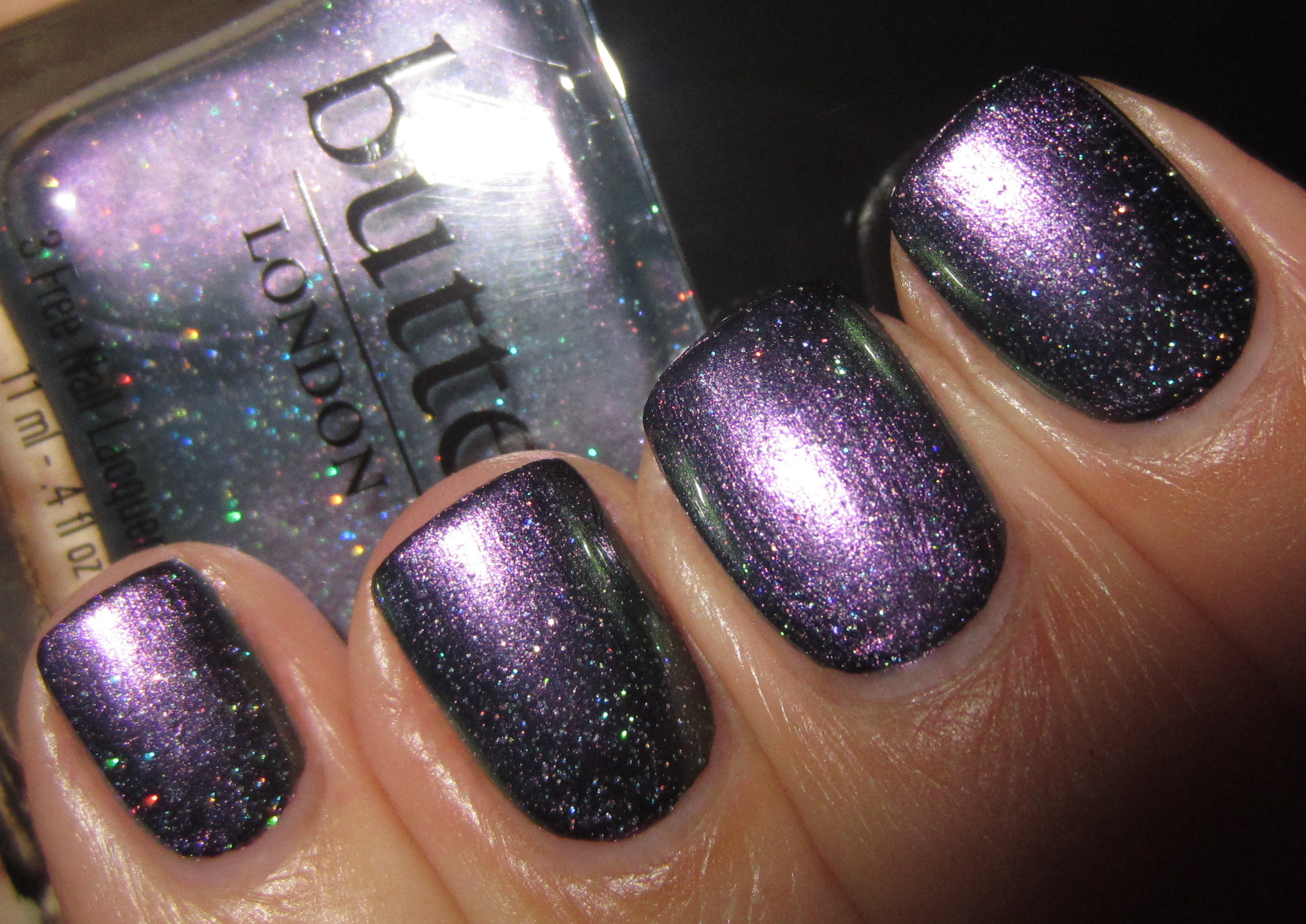 ‘Knackered‘ [to be tired or exhausted. “Wow, you look knackered – what did you get up to last night?”], is magical … it truly is! A chameleon-like shade, this is a sheer yet iridescent hue filled with ultra-fine polychromatic glitter that can flash either silver, turquoise, green or purple – depending on the light and your angle of view. For the following swatches I applied 3 coats, but I was surprised to find that good coverage was also achieved by the 2nd layer. As with ‘Disco Biscuit’, this varnish definitely benefits from at least 1-2 layers of top coat to really bring out all its intricate nuances.