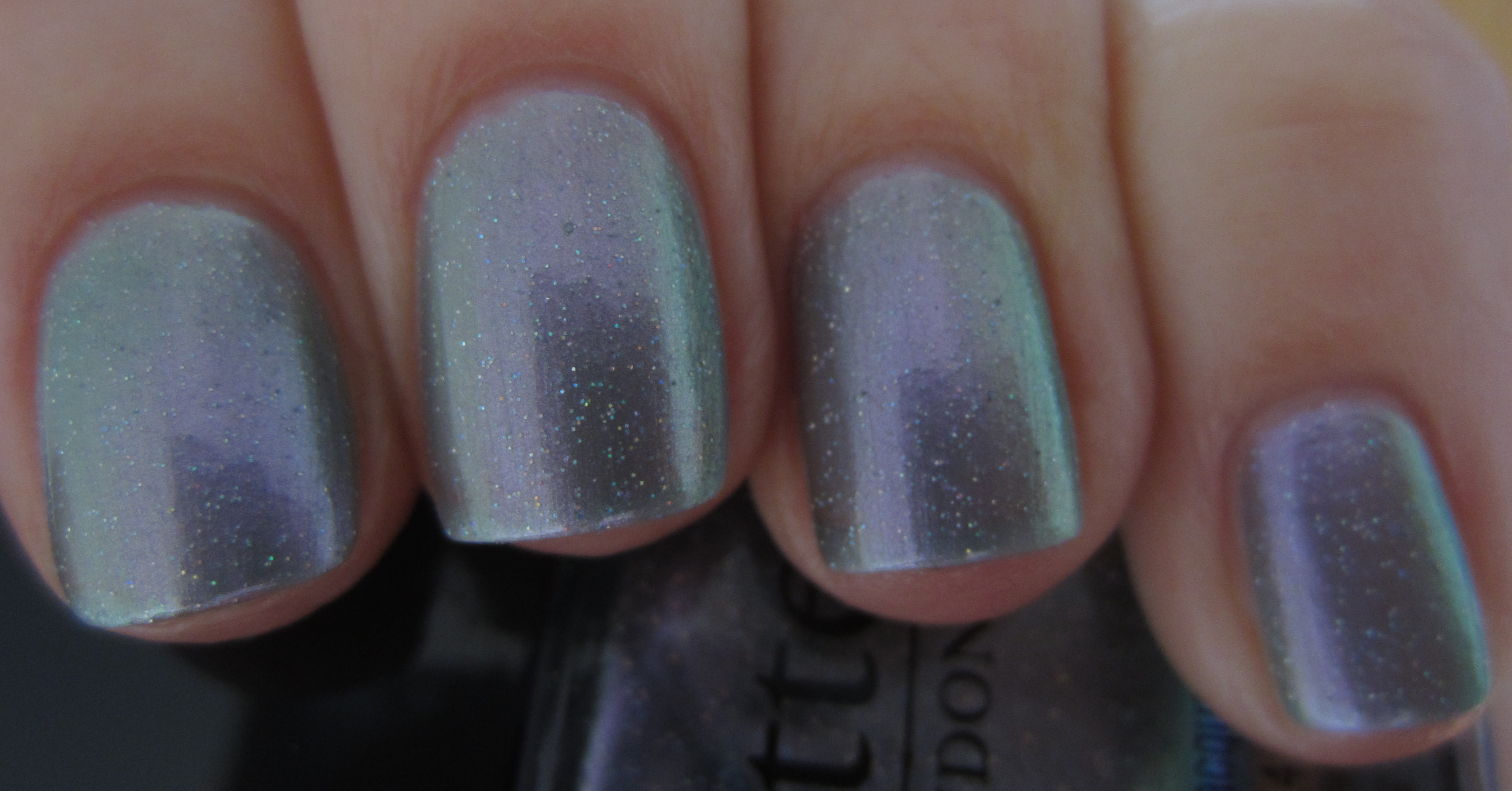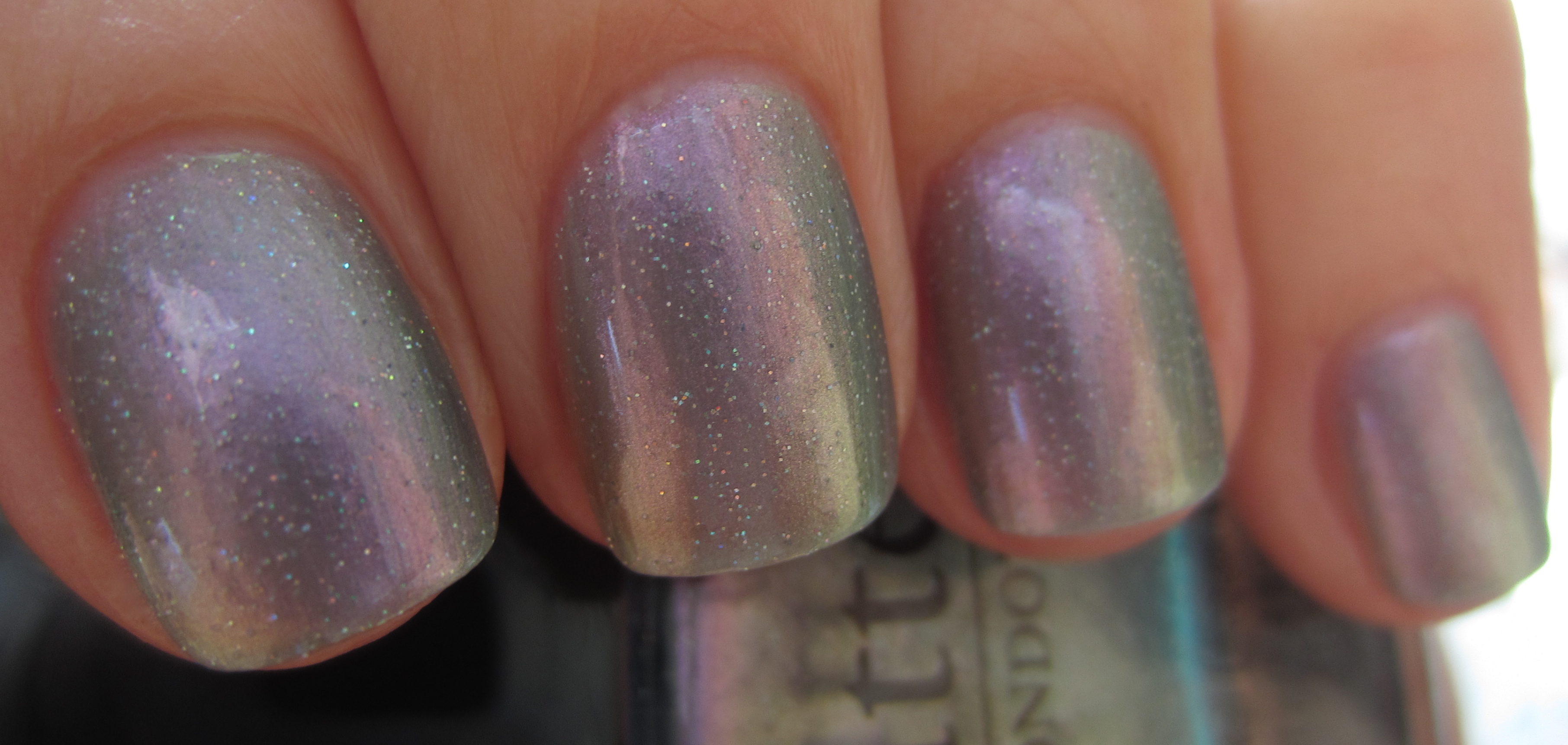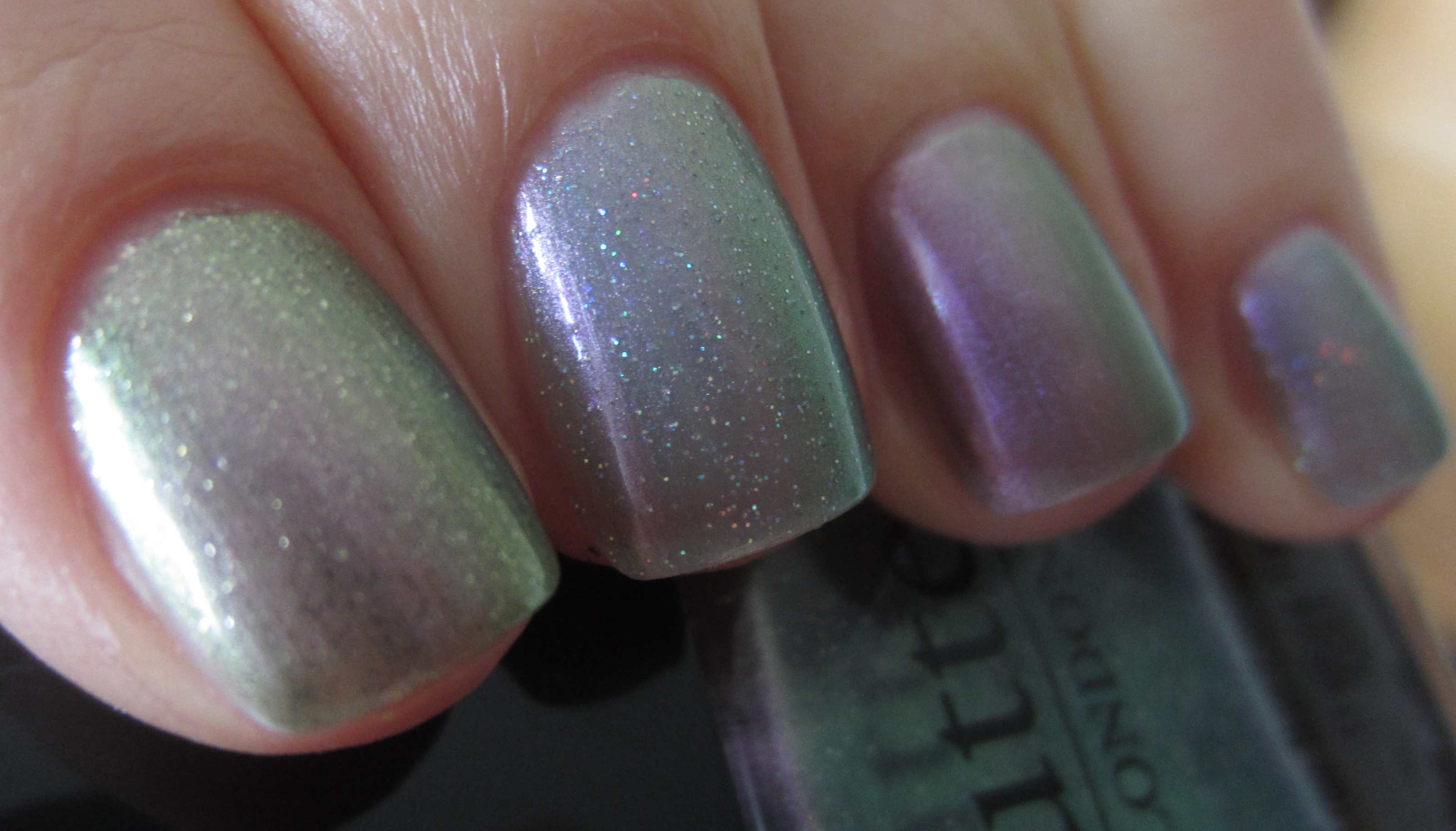 - index finger – OPI’s ‘Not Like the Movies’ (previously reviewed here): similar sheer formula but with a touch more heft to it, more green/grey leaning while its fine glitter is not prismatic