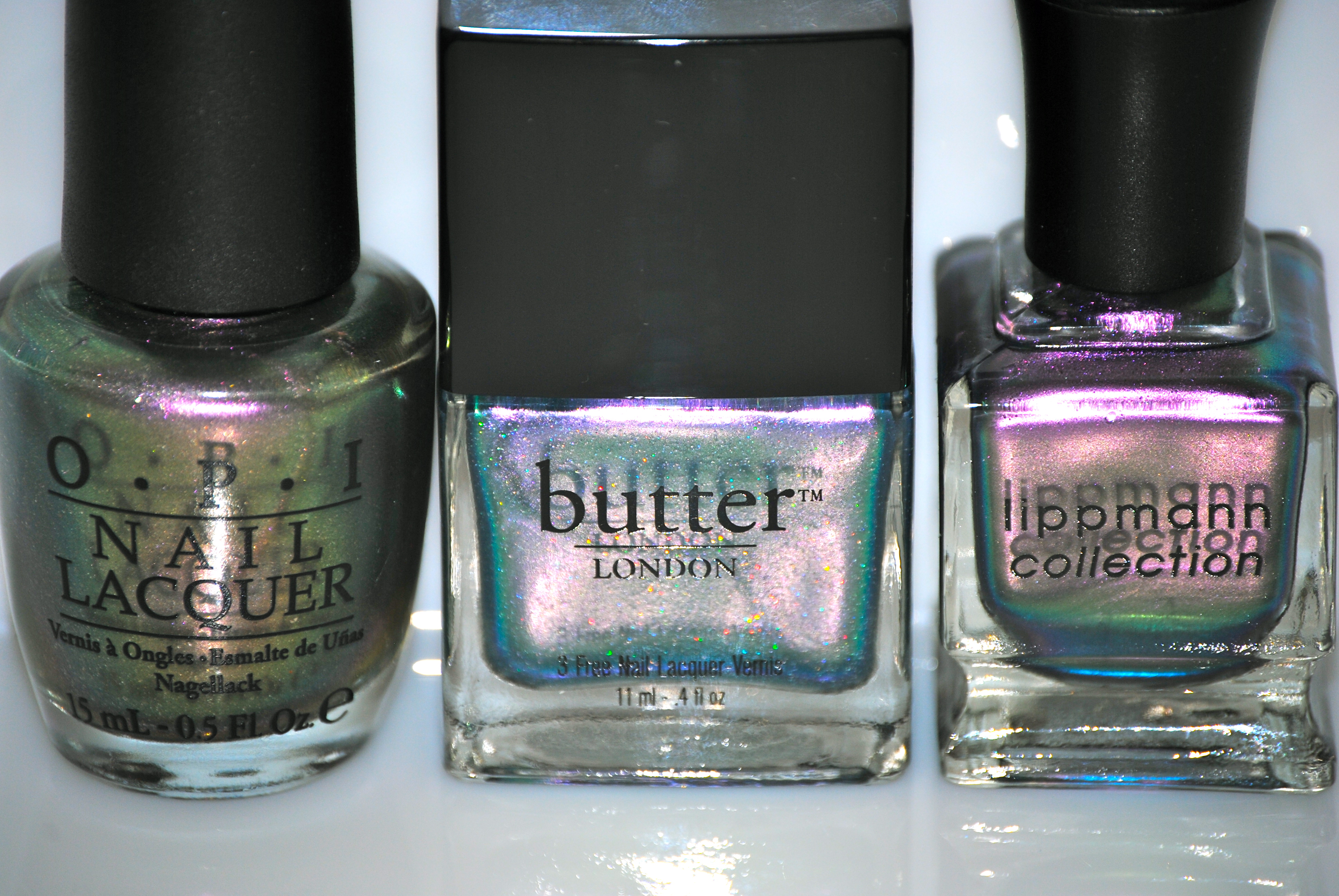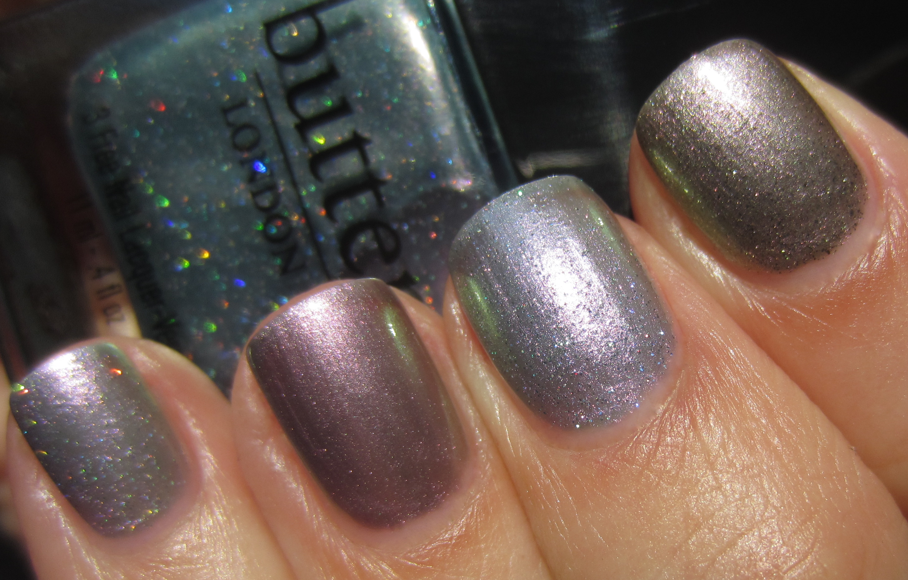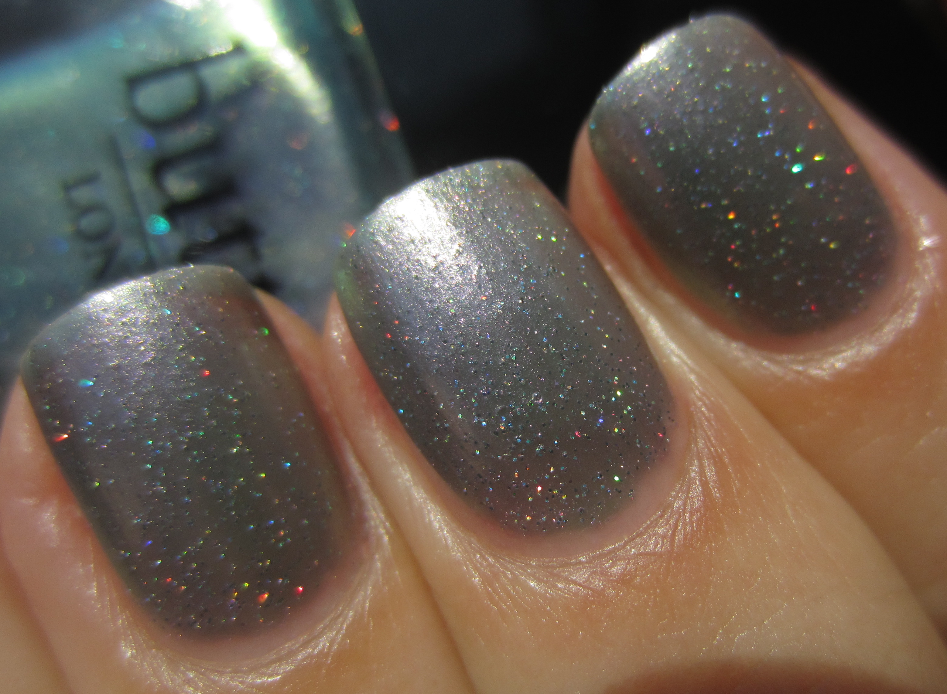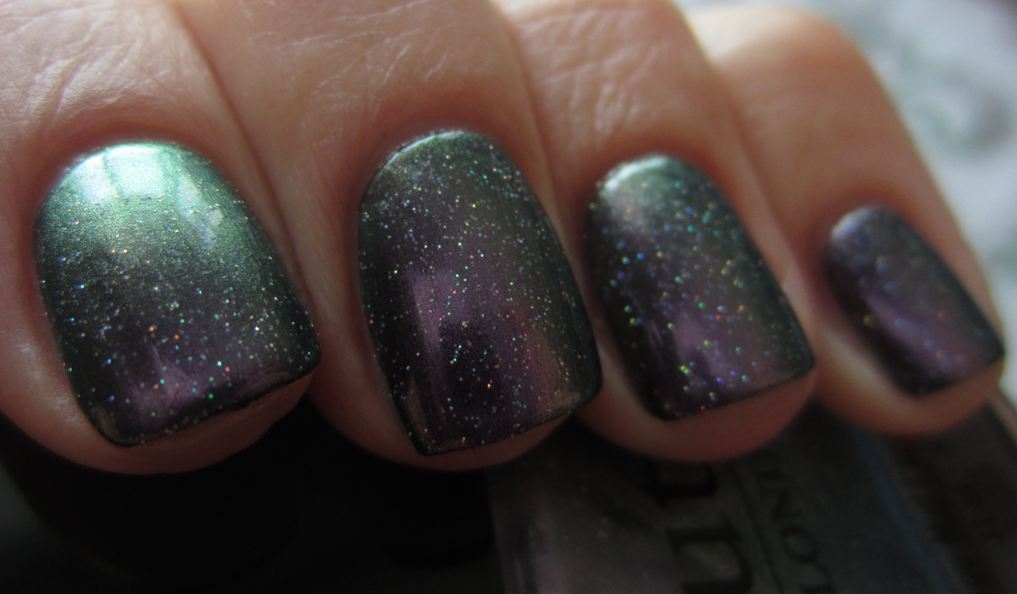- index finger – OPI’s ‘Not Like the Movies’ (previously reviewed here): similar sheer formula but with a touch more heft to it, more green/grey leaning while its fine glitter is not prismatic