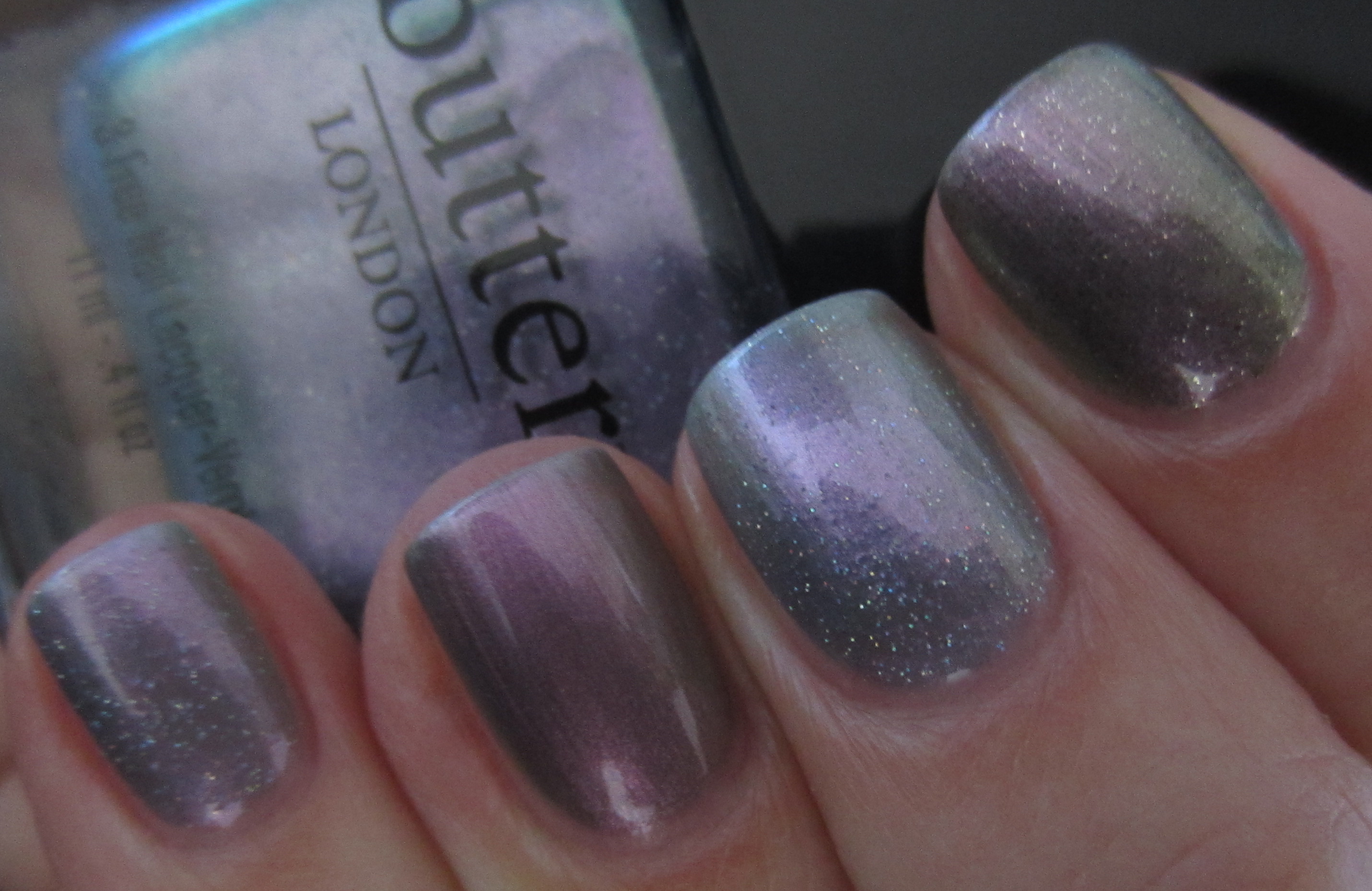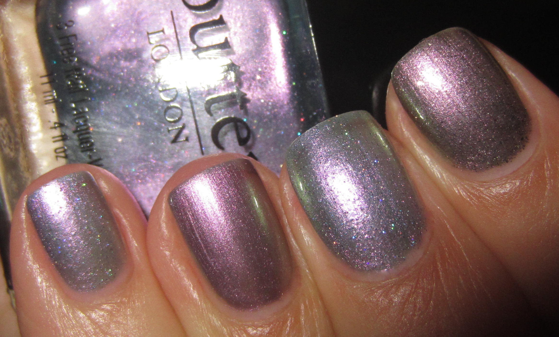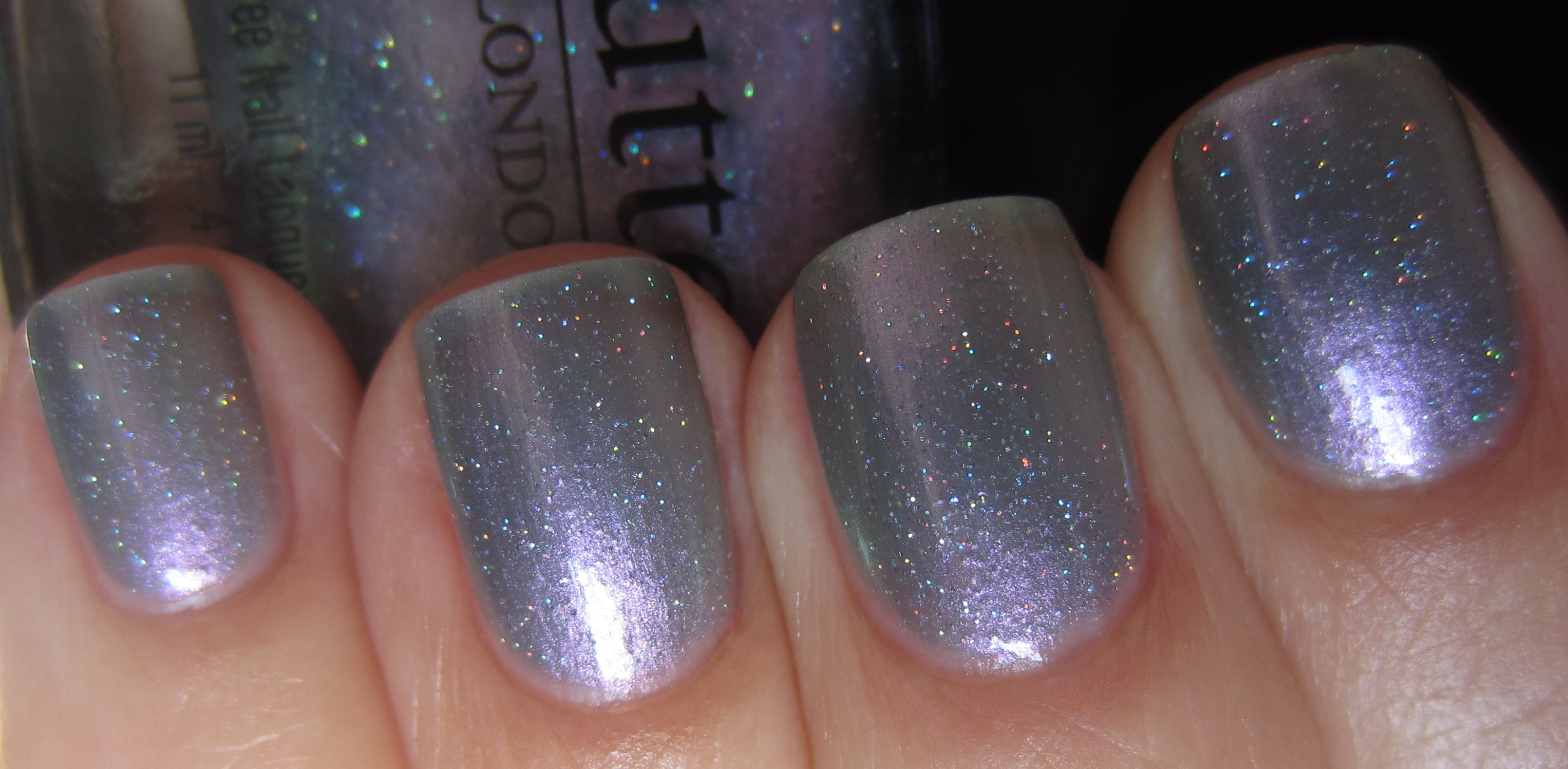 - ring finger – Deborah Lippmann’s ‘Wicked Game’ (previously reviewed here): same sheerness, but more silvery/purple tinged, bearing no glitter and can be prone to some faint brush stroke marks