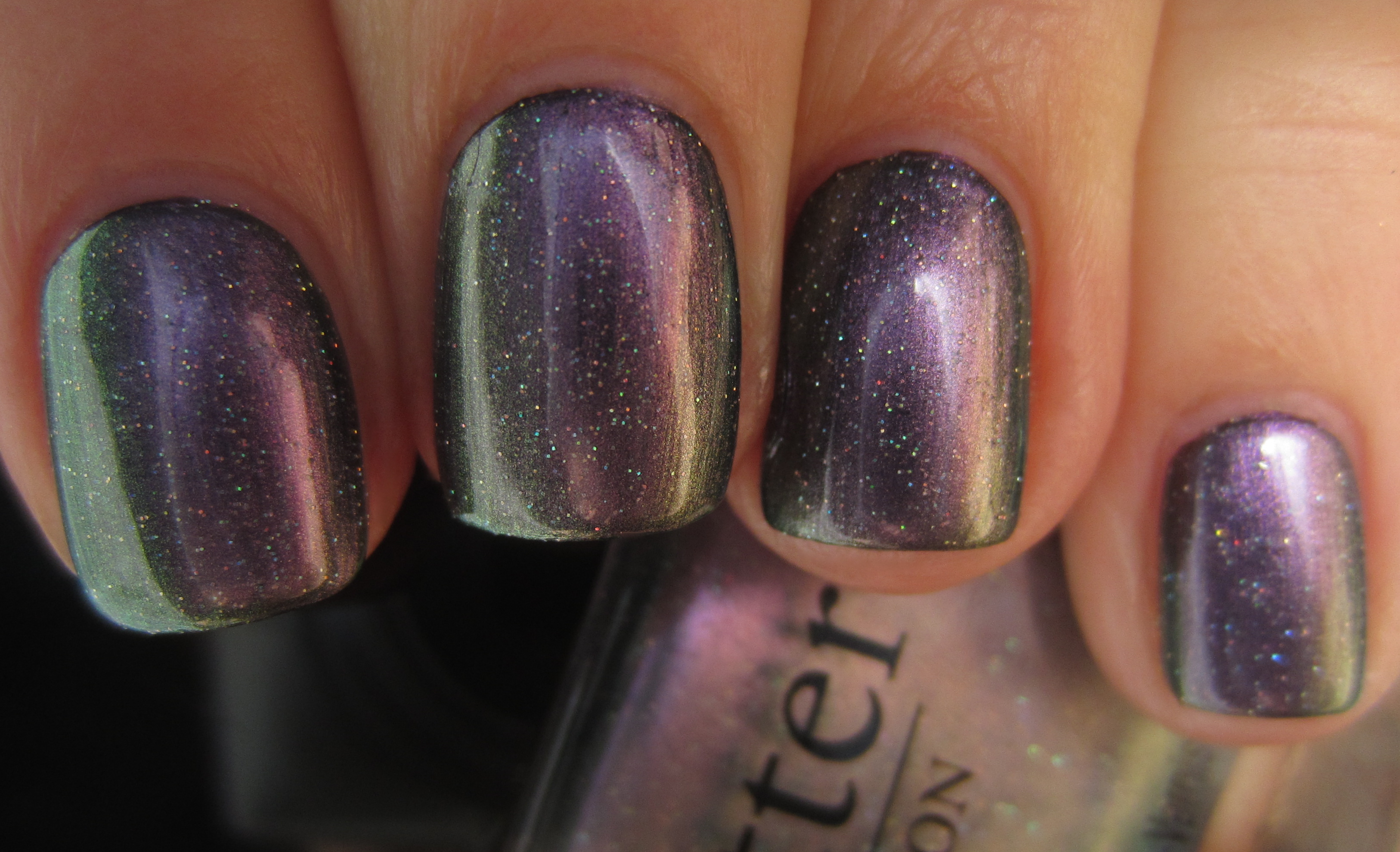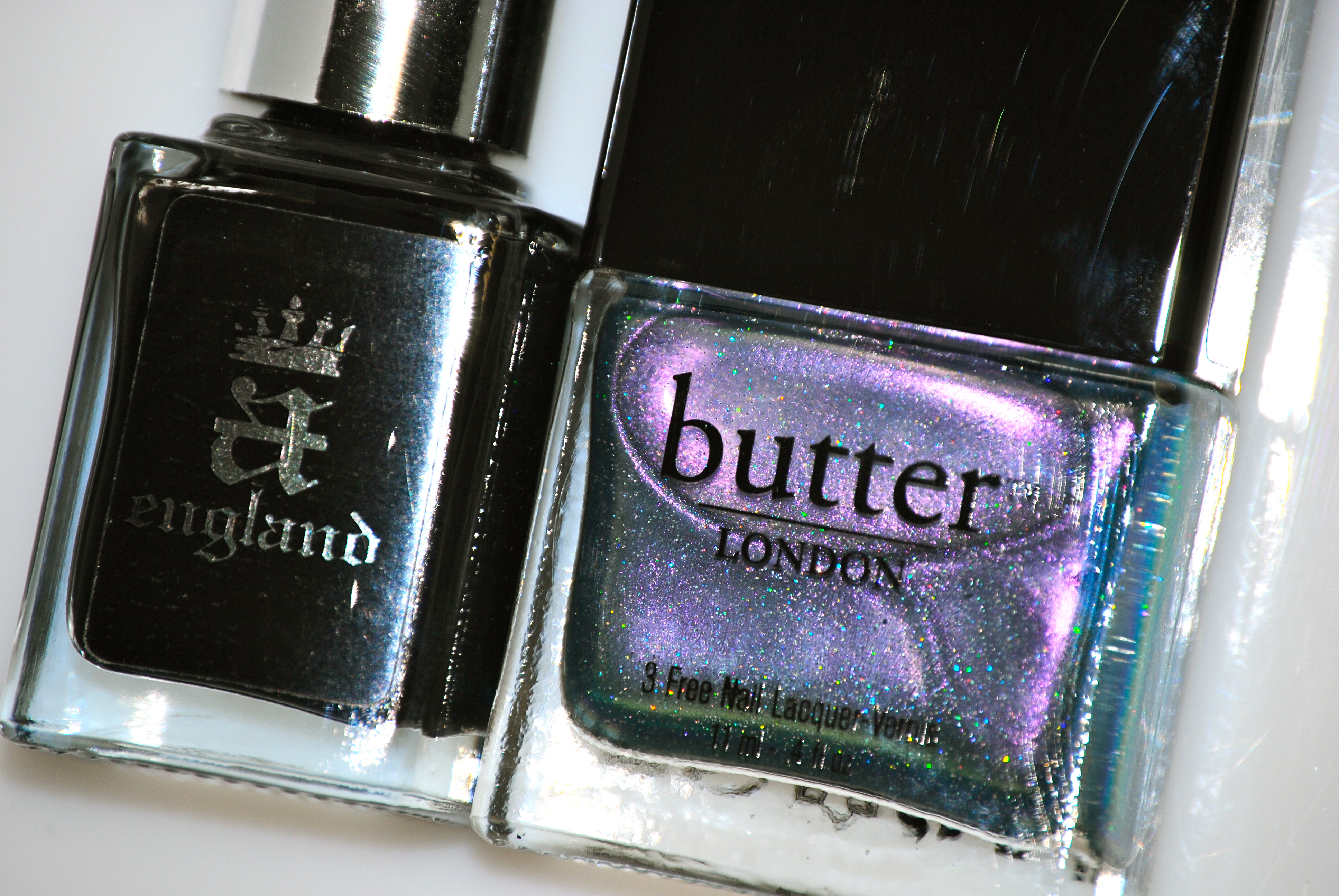 Lastly, I was curious to see how ‘Knackered’ would perform if layered over a black crème, and so reaching for my absolutely favourite ebony shade, a-england’s ‘Camelot’ (previously reviewed here), I began with 2 coats of this gorgeously luxurious glossy black, then added applied 2 coats of ‘Knackered’, topping it all off with a layer of base coat.