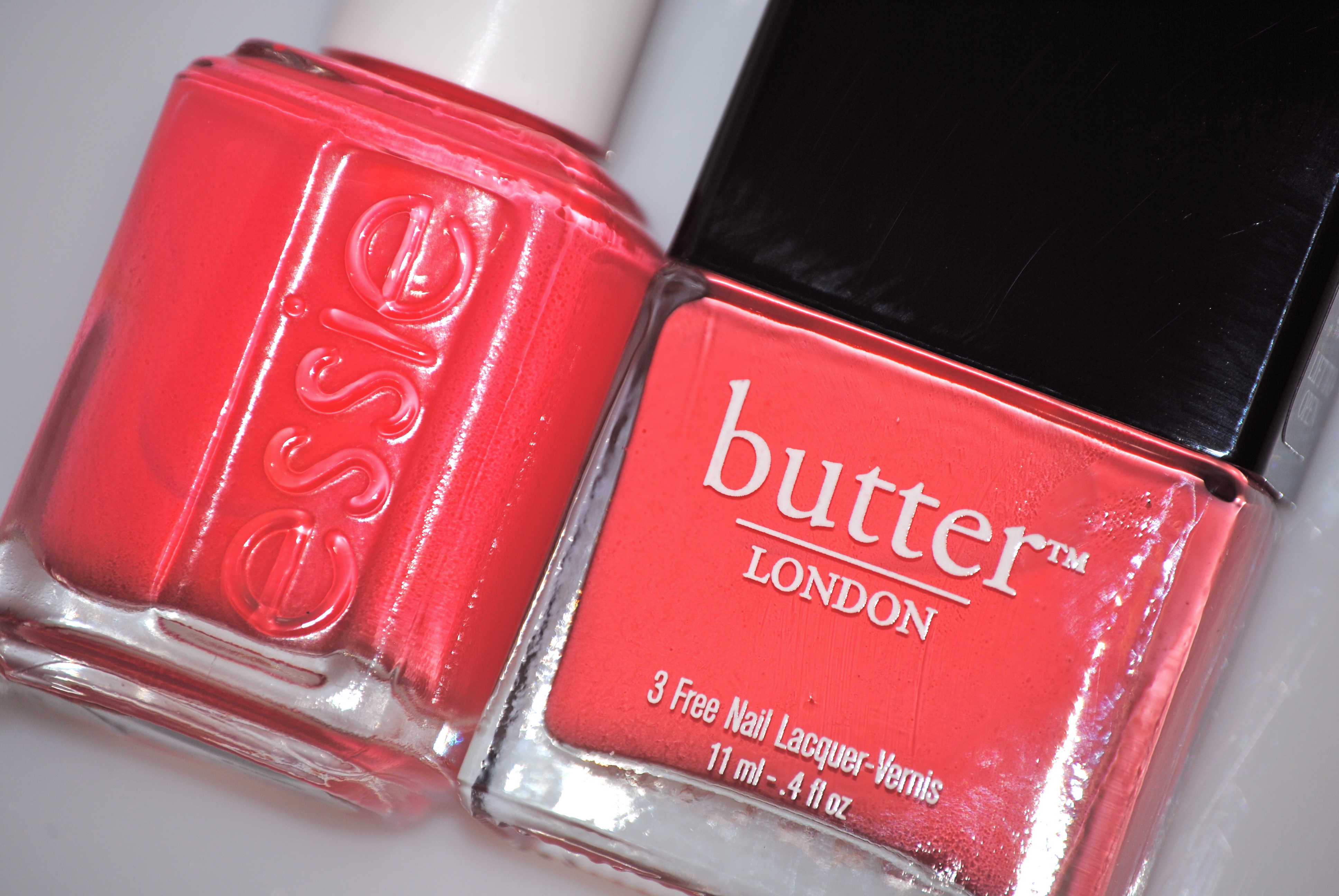 Looking through my collection, I was surprised to find that I only had one shade, Essie’s ‘Cute as a Button’ that came even remotely close to ‘Trout Pout’ – how they compared: