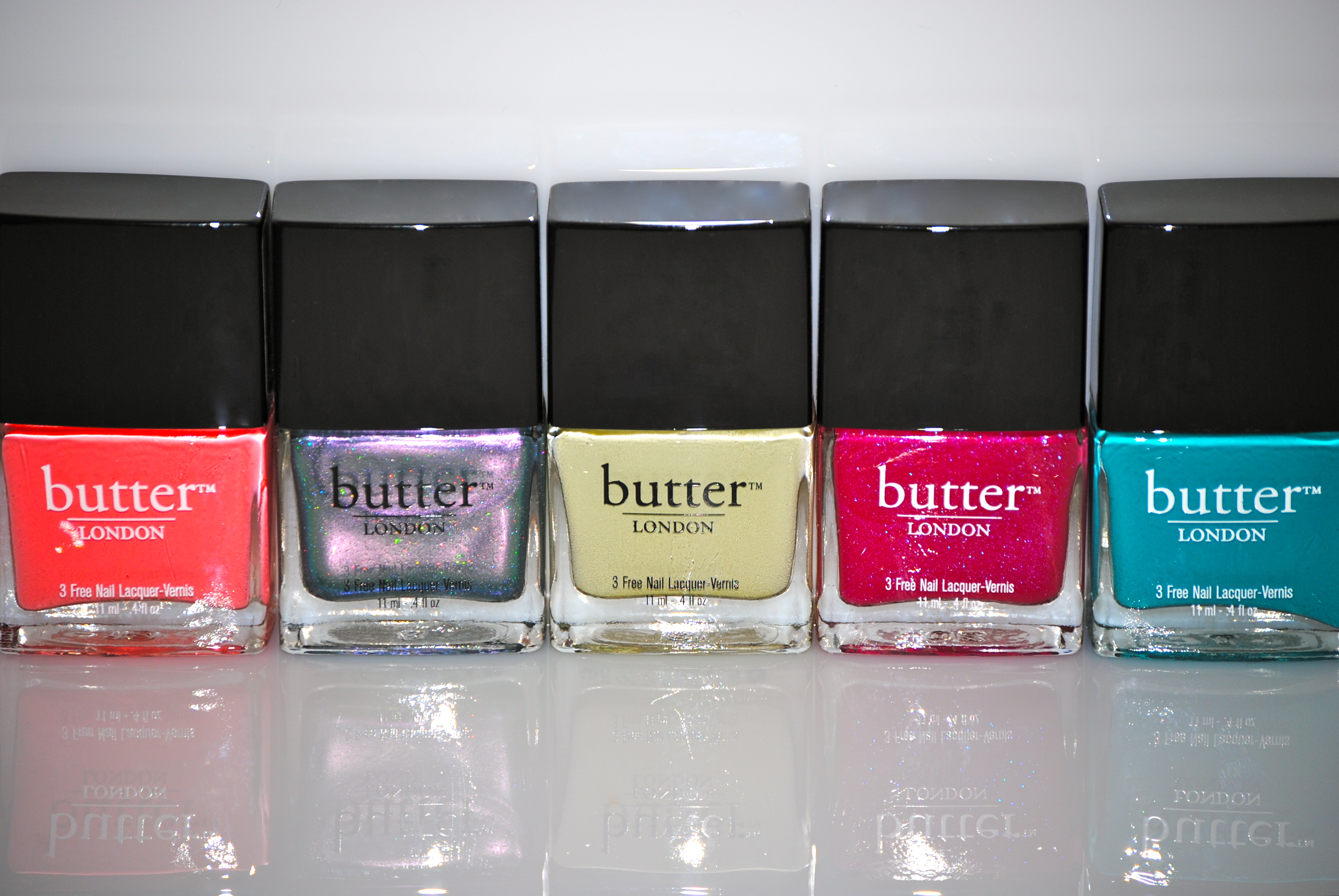 Butter London (does’t that name simply just roll off the tongue so easily?!) has released five fresh, yet totally unique shades, just in time for the spring/summer season that is upon us. With provocative-sounding names to further sweeten the deal – half the fun is in figuring out what they all mean – these vibrant hues can be mixed & matched for some fabulous mani/pedi combinations … be ready for some major compliments! All swatches are with base and top coats.