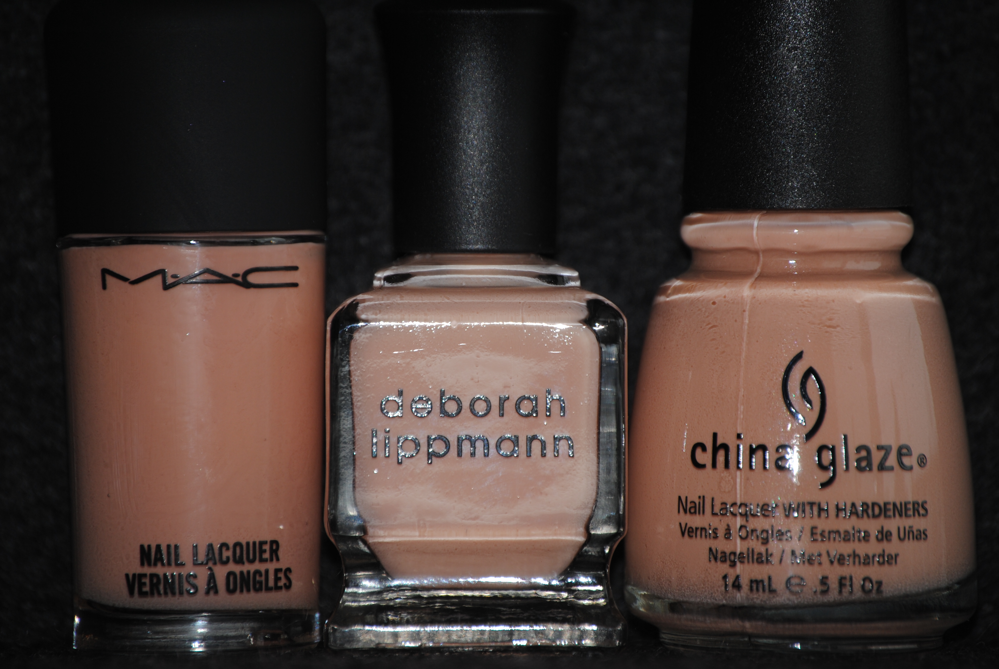 I would have sworn that I had something similar and the closest I came was with Deborah Lippmann’s ‘I’m Not That Innocent’ and MAC’s ‘Blissed Out’, but ‘Sunset Sail’ falls somewhere between the two. While the bottle colour between the Lippmann polish and the China Glaze seemed almost identical, the Lippmann turned out to be not only paler, but the formula was significantly thinner and slightly streaky; the MAC was a thin formula as well, but the hue fell slightly darker, albeit a close match in tone. The major difference was that neither of the other 2 polishes had that secret shimmer and so seemed a little flat when next to ‘Sunset Sail’. Photo above: Index & pinkie fingers – Sunset Sail, middle finger – I’m Not That Innocent and ring finger – Blissed Out.