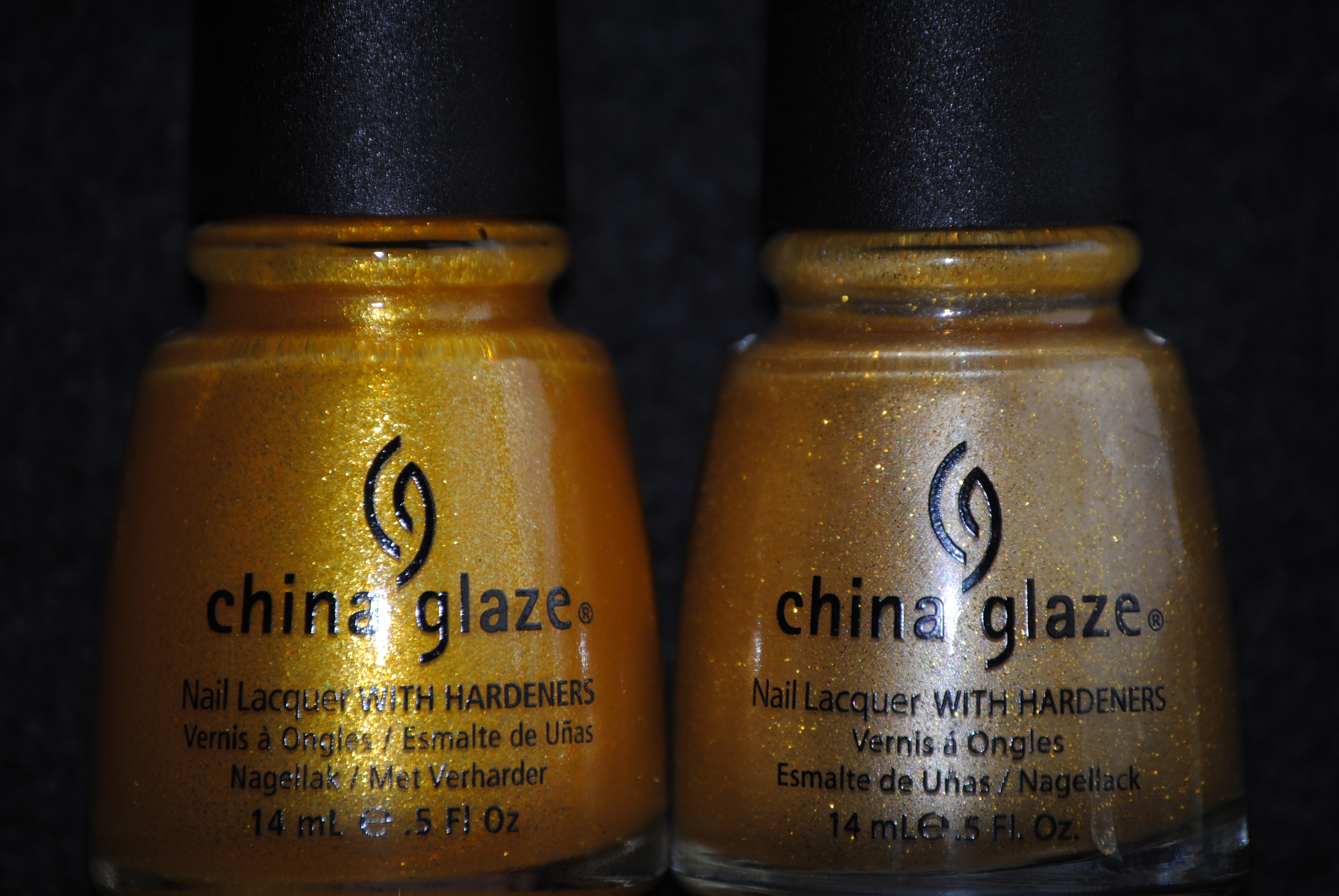 At first glance, I thought that ‘Lighthouse & Cowardly Lyin’ might be almost identical, but you can clearly see how much more of a pale lemon yellow Cowardly Lyin’ is beside the brighter gold of Lighthouse. Cowardly Lyin’ is also significantly thinner in application, with much sparser and slightly larger two-toned golden glitter throughout, lending it an almost spotted look next to Lighthouse.