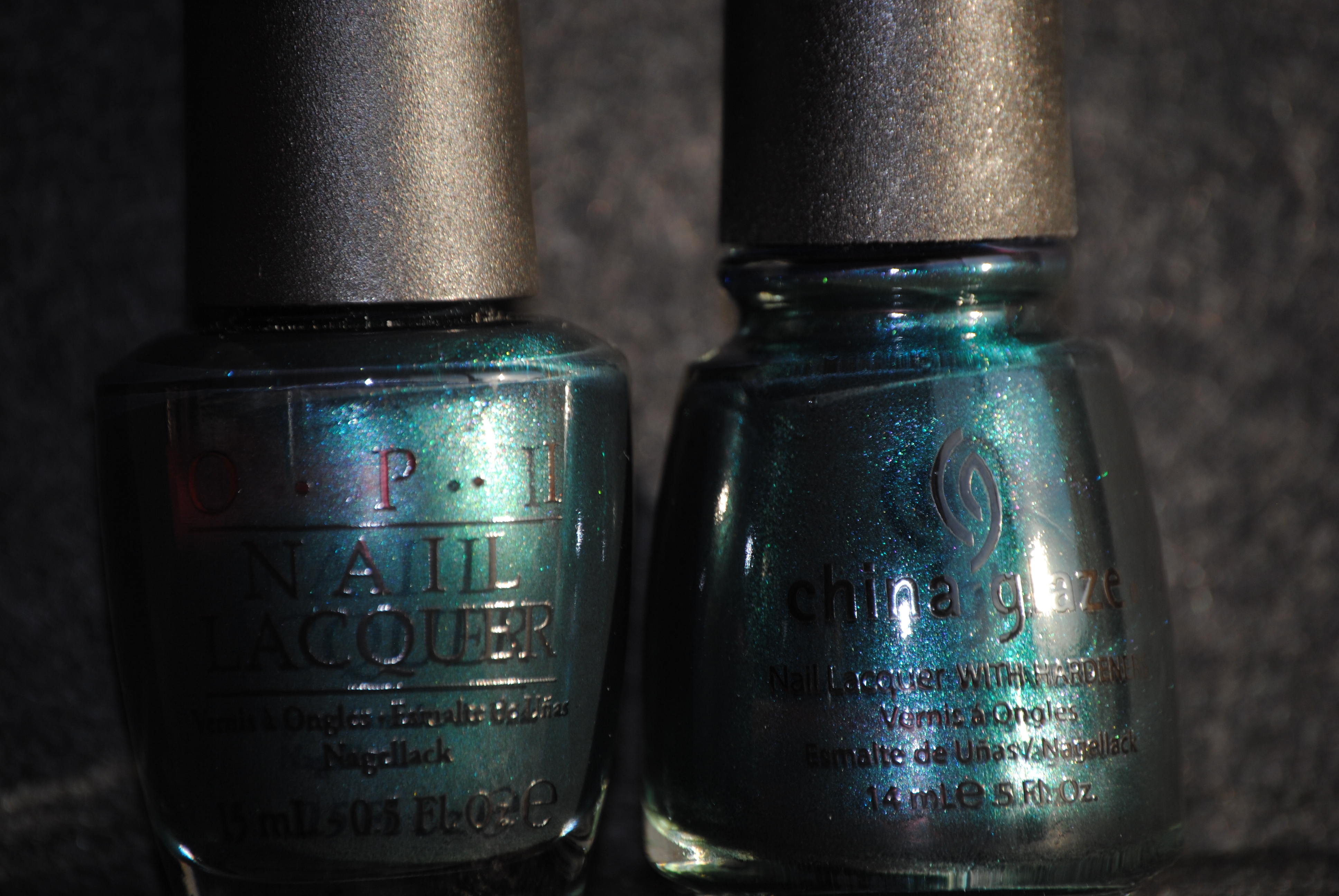First up we have OPI’s Lucerne-Tainly Look Marvelous (LTLM) versus China Glaze’s Jitterbug; the formula on both seemed similar, with both of them flowing easily, no visible brush strokes and a beautiful foil finish. The biggest differences are in the tonal qualities; Jitterbug has a blueish tinge to it making it look more like steel, versus LTLM’s slightly greenish undertone, making it more of a gunmetal. The other thing I noticed is that the OPI was significantly glossier & more sparkly, even before a top coat was added.