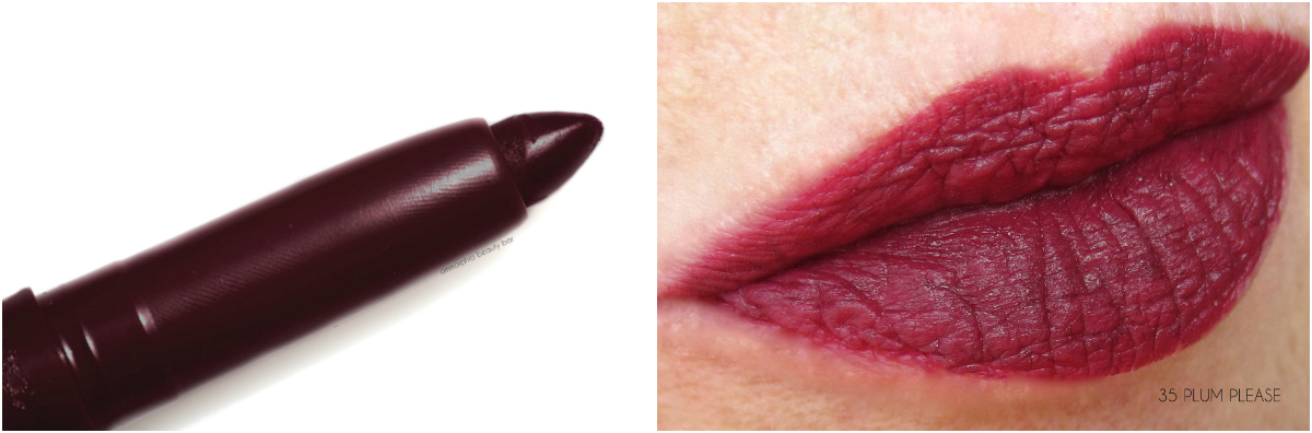 35 Plum Please | intense vampy burgundy, can swing either warm or cool, the darkest and most colour saturated of them all (blotting it out with the smudger made it look patchy on my lips, but applied full-on it’s spectacular)