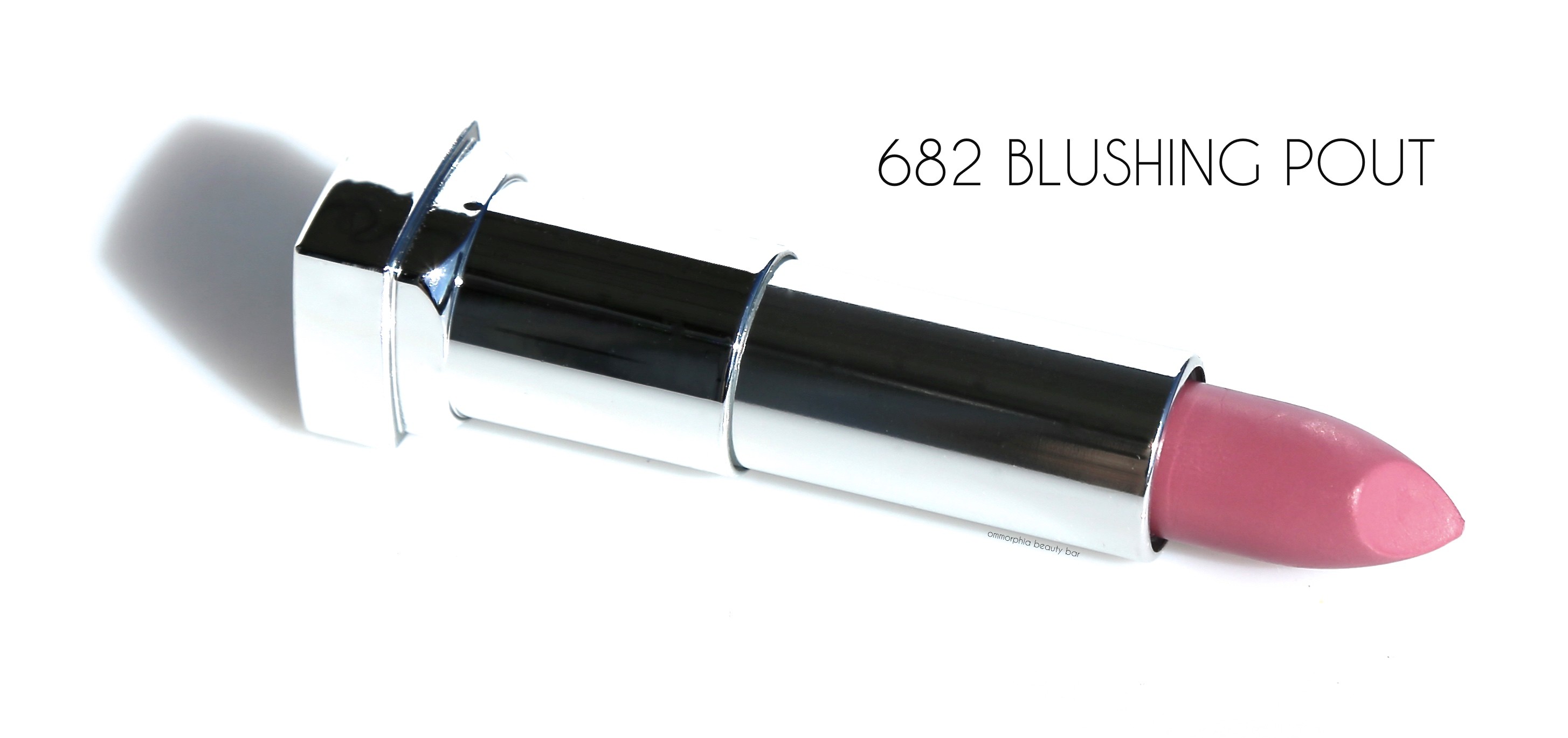 682 Blushing Pout | A white-based dusty pale pink with a tendency to settle in lip lines (of which I have TONS) and can appear slightly patchy at first – but which can be basically eliminated by blotting and re-applying. A total retro feel to this shade (think: Twiggy, the swinging 60s).