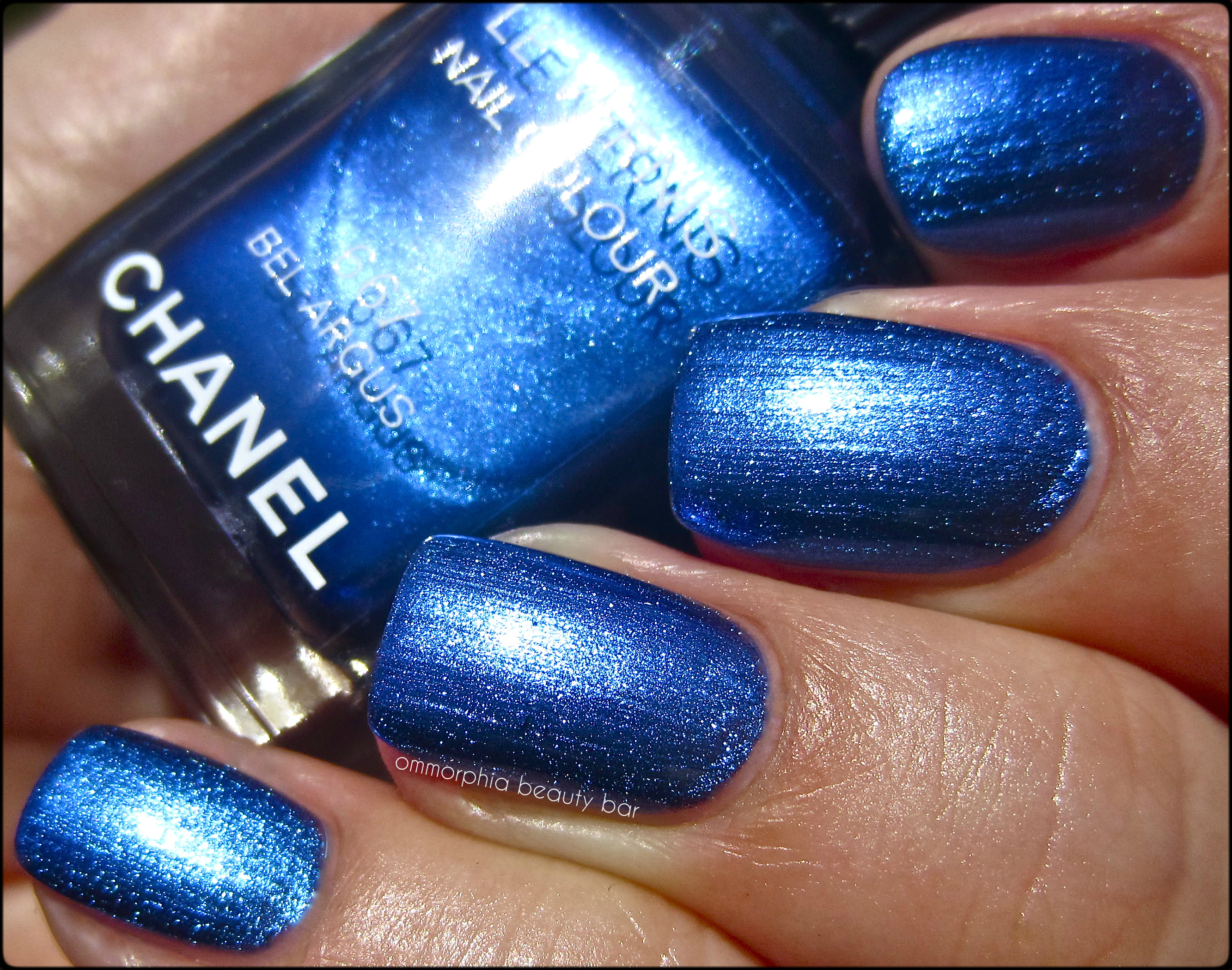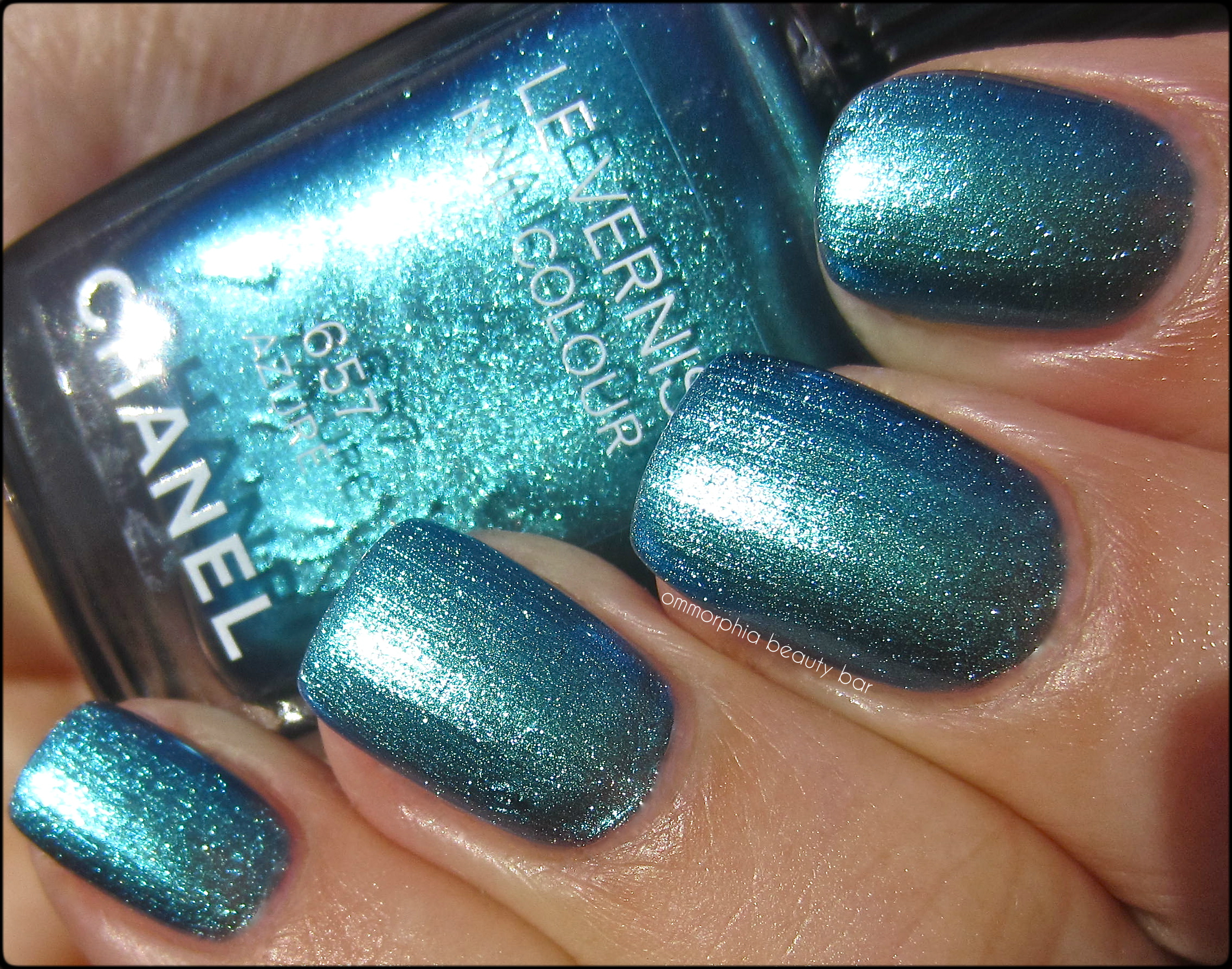CHANEL #583 Taboo (CAD $27.00) – a complex multi-chrome eggplant/wine base hue filled with ultra fine ribbons of purple and burgundy shimmer throughout and with mega colour shifting properties that throw out purple/indigo flashes, depending on the angle and lighting. The contents at the bottle’s neck appear rather inky in tone, belied by the application, which lays down more dark violet at the first coat. Pigmentation is STELLAR and the flow is simply phenomenal, while the final result is of that lit-from-withing glow which I absolutely adore – very much like a banked fire. Mysterious, sensual, provocative and intriguing — this shade is all that, and more, with the added bonus of absolutely no staining left behind upon removal. Coats applied: 2, plus top coat (although its rich colour saturation can easily make it pass for a 1-coater)