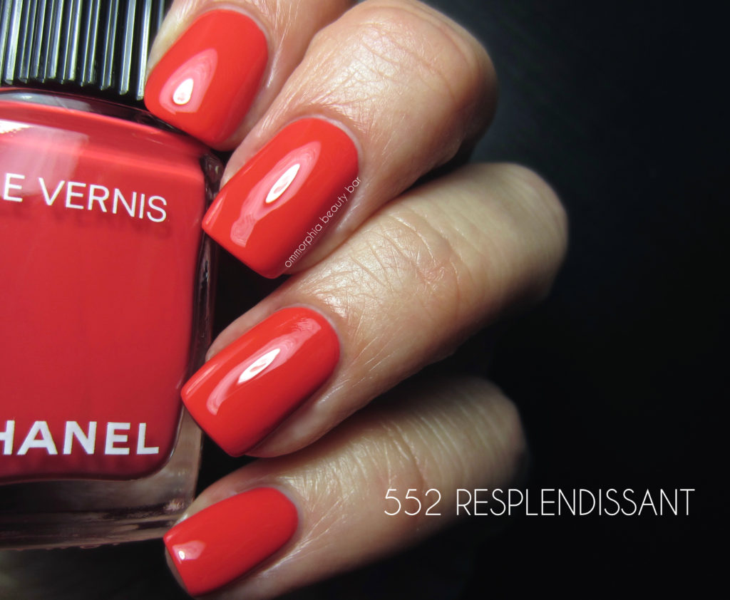 552 Resplendissant (CAN $32.00) | Basically, this hot coral crème hue is what we call a “one-coat-wonder” and it’s not often that CHANEL creates one of these. The rose undertones in the base mean that this shade can be easily wearable by a broad range of skin tones. The formula falls smoothly, shows excellent opacity from the start, and has the type of density that means it won’t pool along cuticles or sidewalls, coming to a super-glossy finish. Apart from being a great compromise for those who want something other than red, Resplendissant will also make for one kick-ass pedi shade, especially against a light tan.