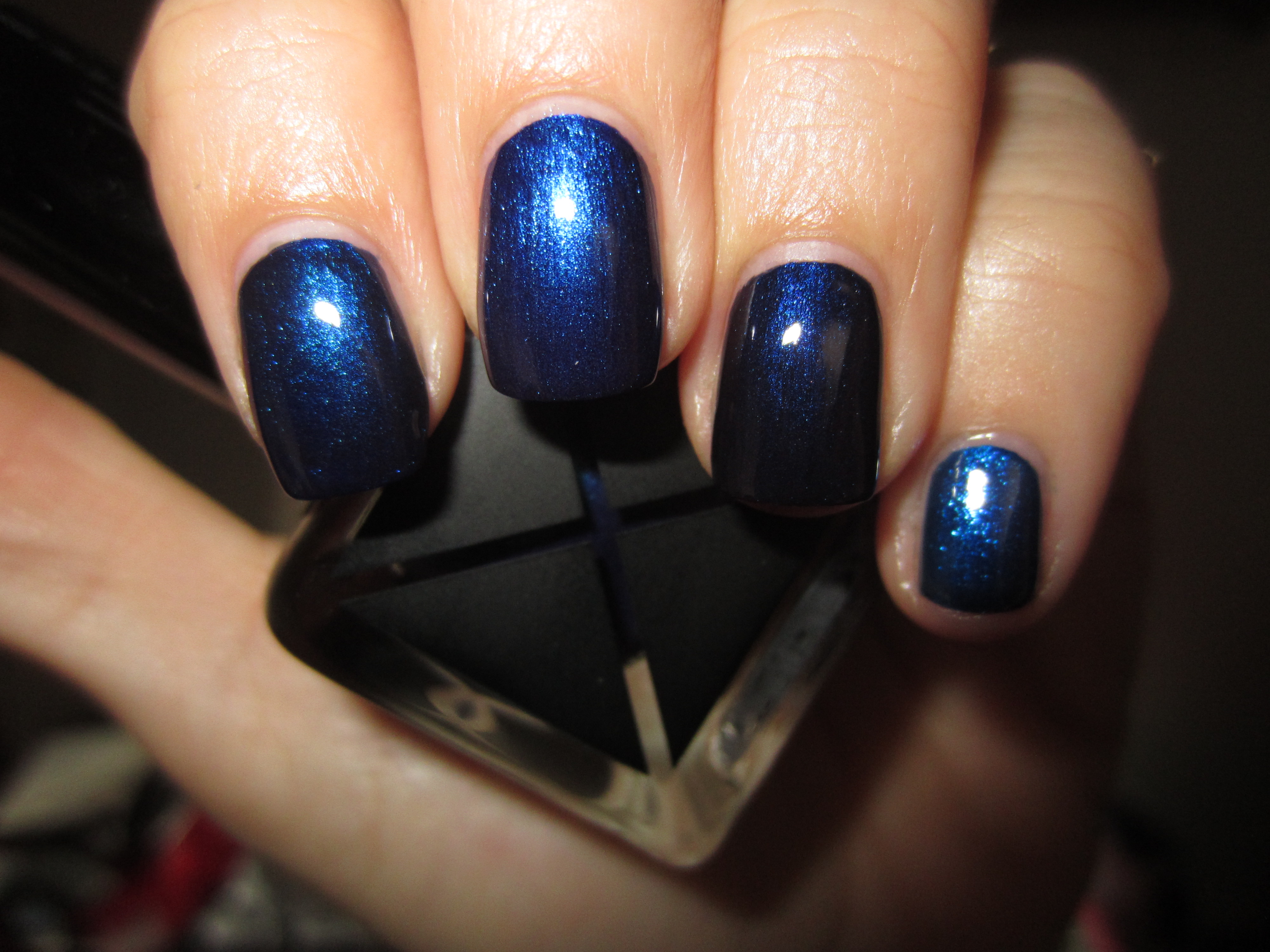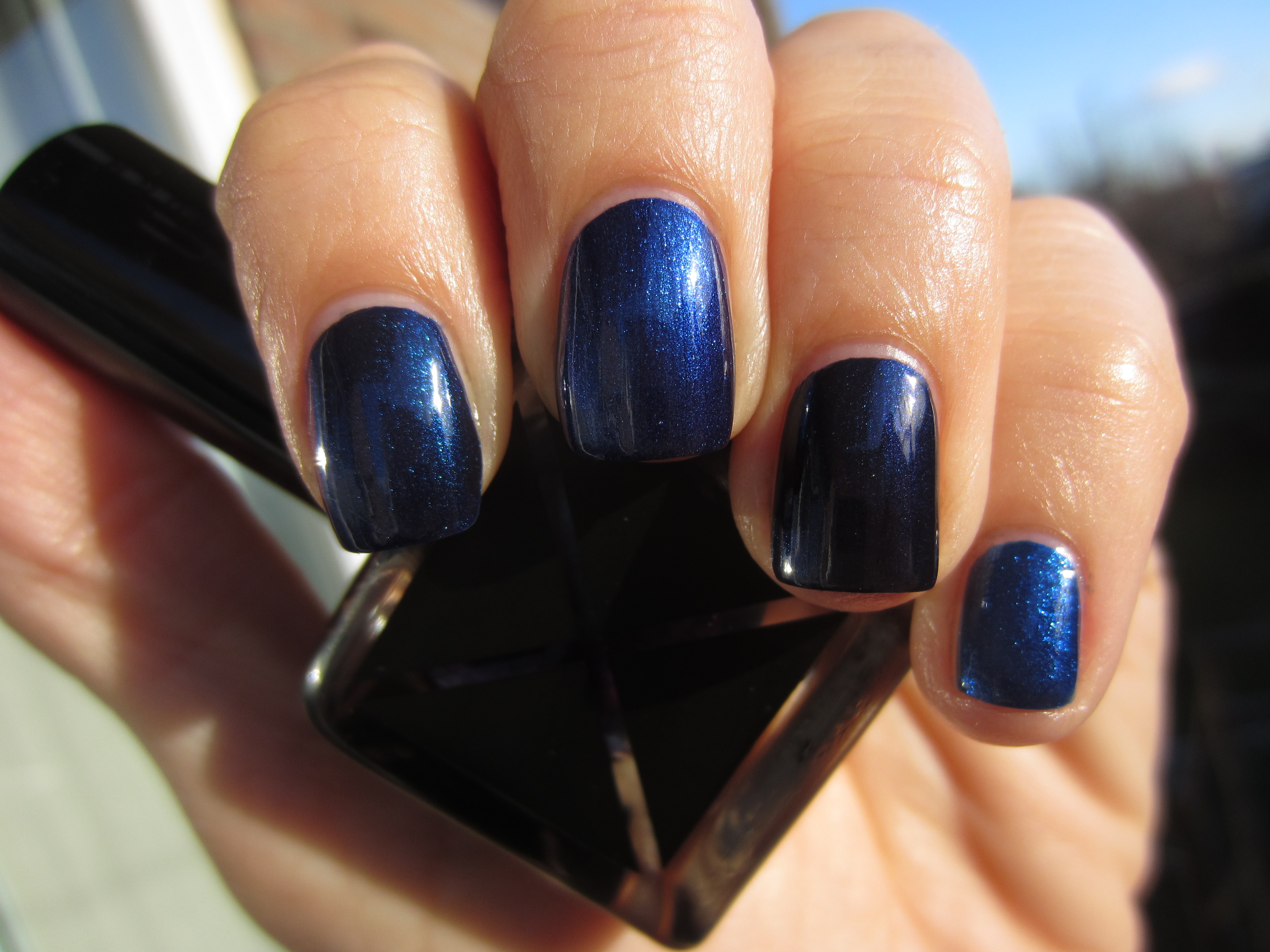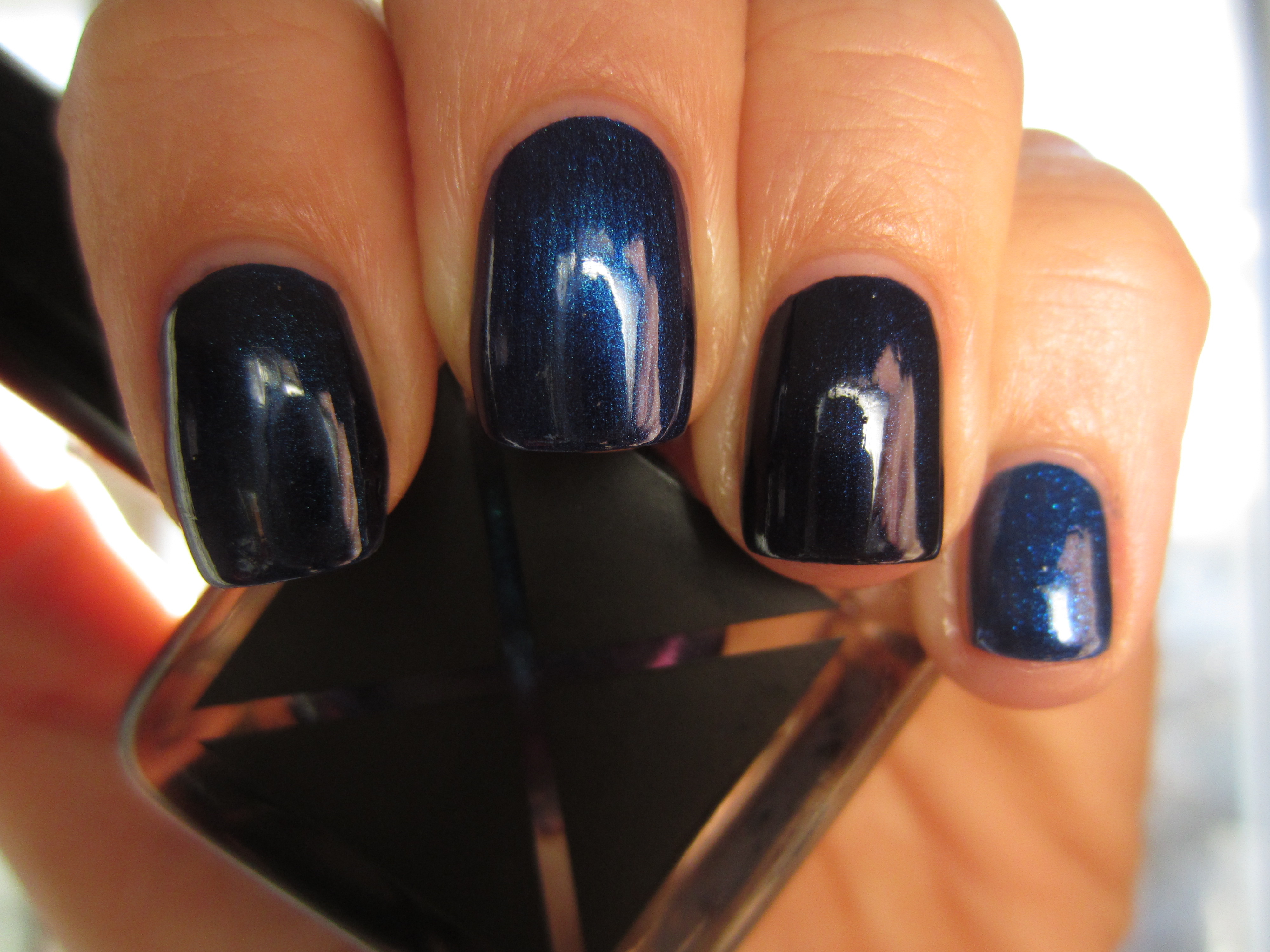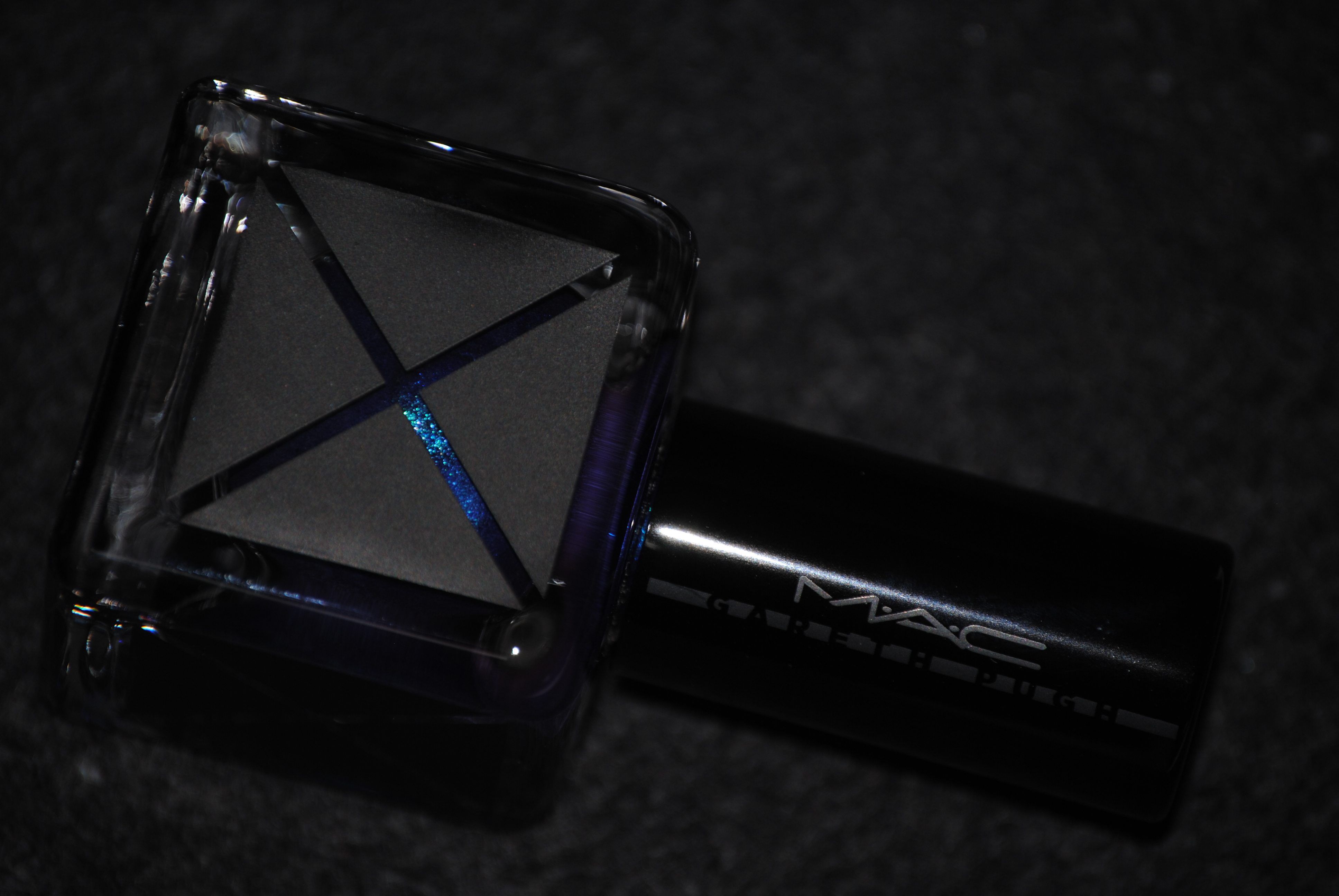 MAC’s recent collaboration with hot young British designer Gareth Pugh, has resulted in a capsule collection consisting of several limited edition pieces, one of which I bring you today. ‘Hyper’, an intensely gleaming, ultra rich indigo nail varnish, instantly drew me…not only because of the colour itself, but for the vampy mystery it seemed to promise. Without bothering to swatch it at the store first, I basically bought it sight unseen and hoped for the best – and I’m so glad I did! The following swatches are all with Deborah Lippmann’s 2-Second Nail Primer, and Essie’s All In One Base Coat, as well as No Chips Ahead Top Coat.