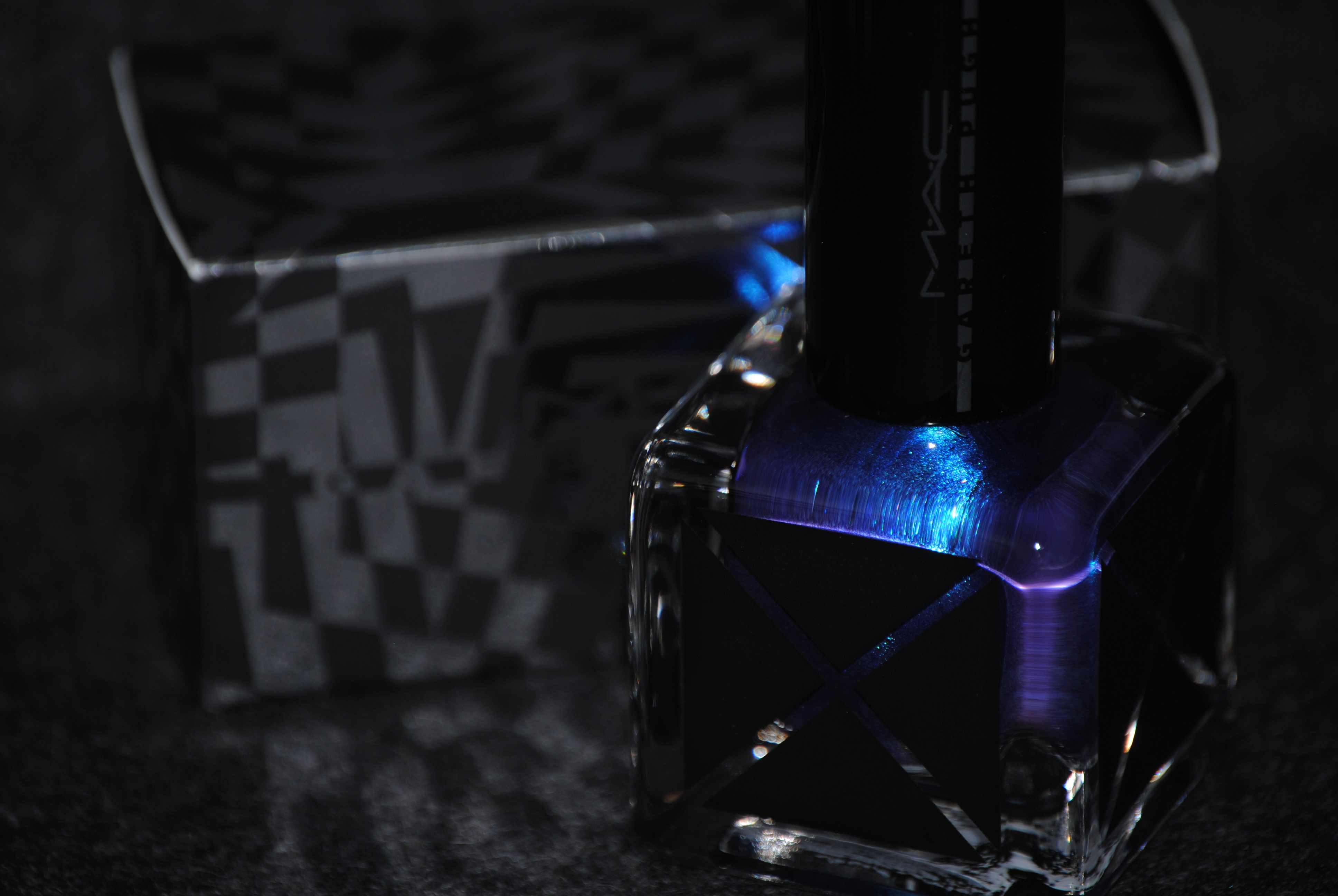 ‘Hyper’, one of three limited edition nail varnishes released in this limited edition capsule collection, is the only one that really caught – and held – my eye. Catching only tantalizing glimpses of the colour through the cut out shapes on the bottle, it totally seduced me with its deep rich blue tones that seemed to morph to a vivid violet before my eyes. The bottle itself is not your usual MAC shape; a square, heavy-gauge glass bottle with a black “x” silkscreened on each of its four sides, the narrow cap also has the MAC logo embossed along its length. The formula seems to be a departure from MAC’s norm, being a touch on the thick side and could be applied as a one-coater if so desired, although I prefer the look of at least two coats, myself. The brush felt a bit short, but was still manageable and while the purple duochrome clearly appears in the bottle, it was next to impossible to detect any such flash upon the nails – my only disappointment with this beauty. On the other hand, the formula was wonderful in every other sense, being self-levelling, bearing a “secret shimmer”, finishing with a nice gloss and leaving behind absolutely no staining.