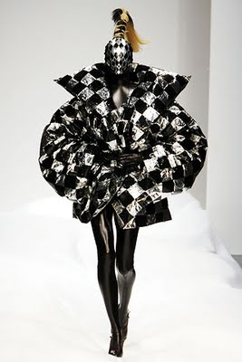 The exterior of the box pays homage to Gareth Pugh’s love of the geometric shape, while giving it a twist by the use of a foil finish. Above photo is from a 2007 Gareth Pugh collection … uncanny resemblance!