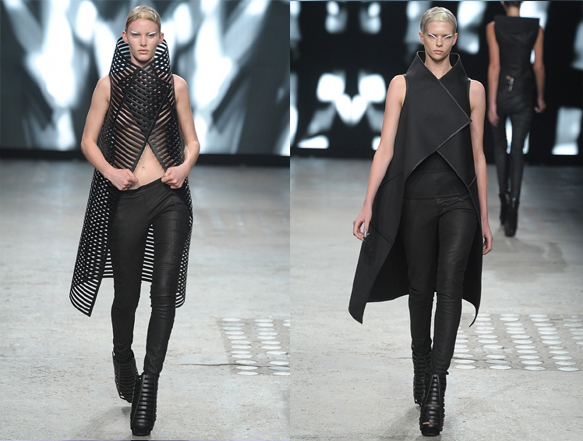 The above images from Gareth Pugh’s Spring/Summer 2012 collection, exemplify what this eclectic British designer has become known for: edgy, urban, minimalistic, and sophisticated futuristic chic. I love how the “x” design on the bottle, as well as the geometric packaging, mimics and follows the lines of his designs … inspired!