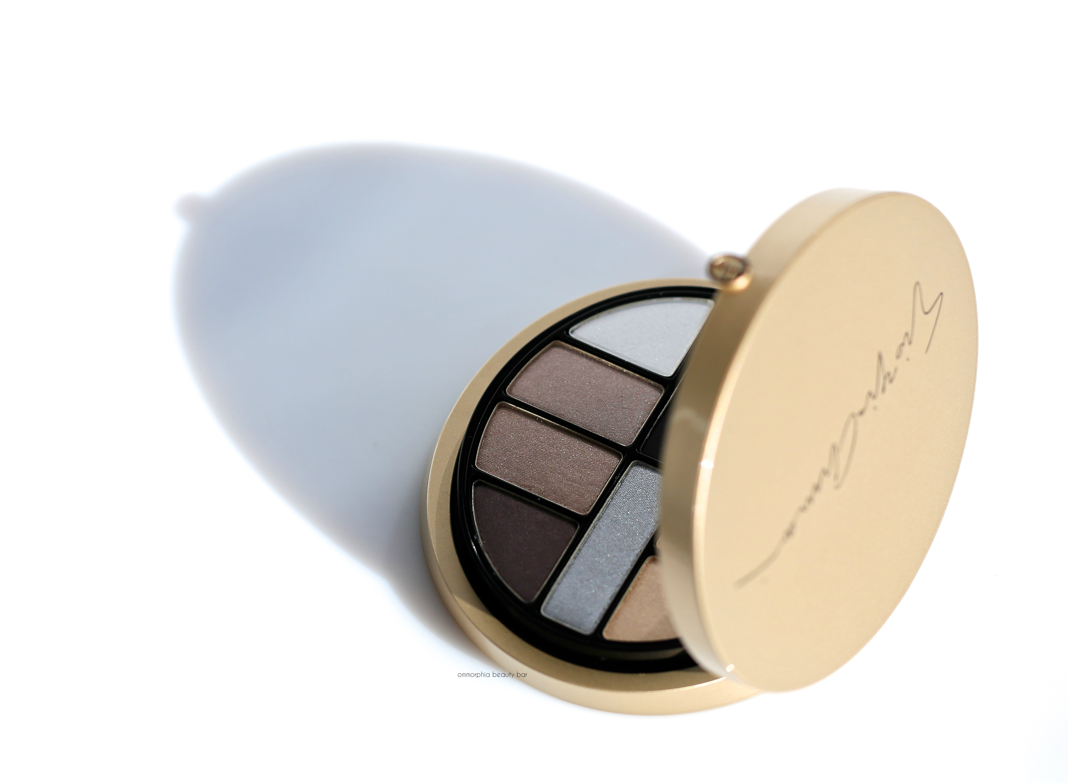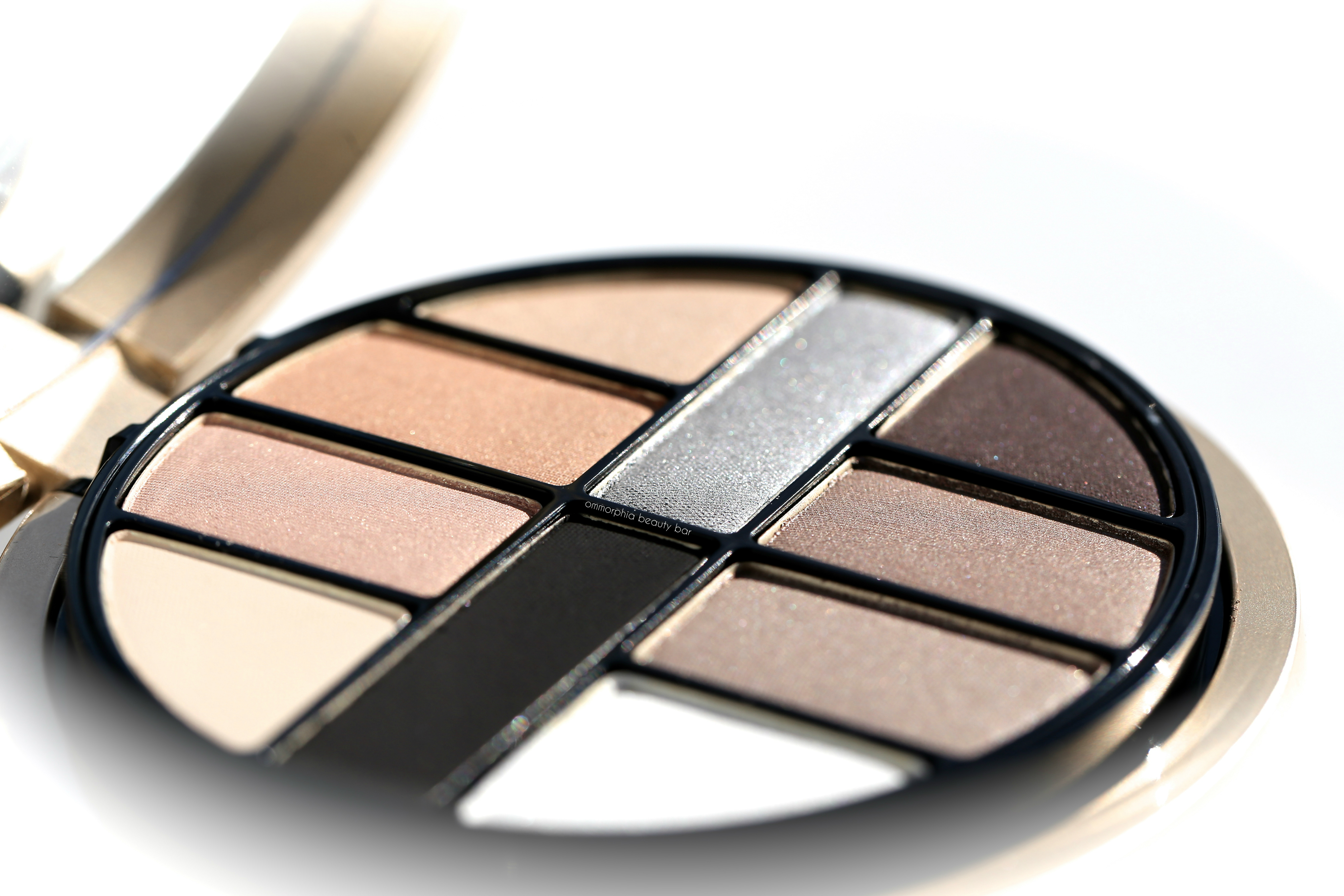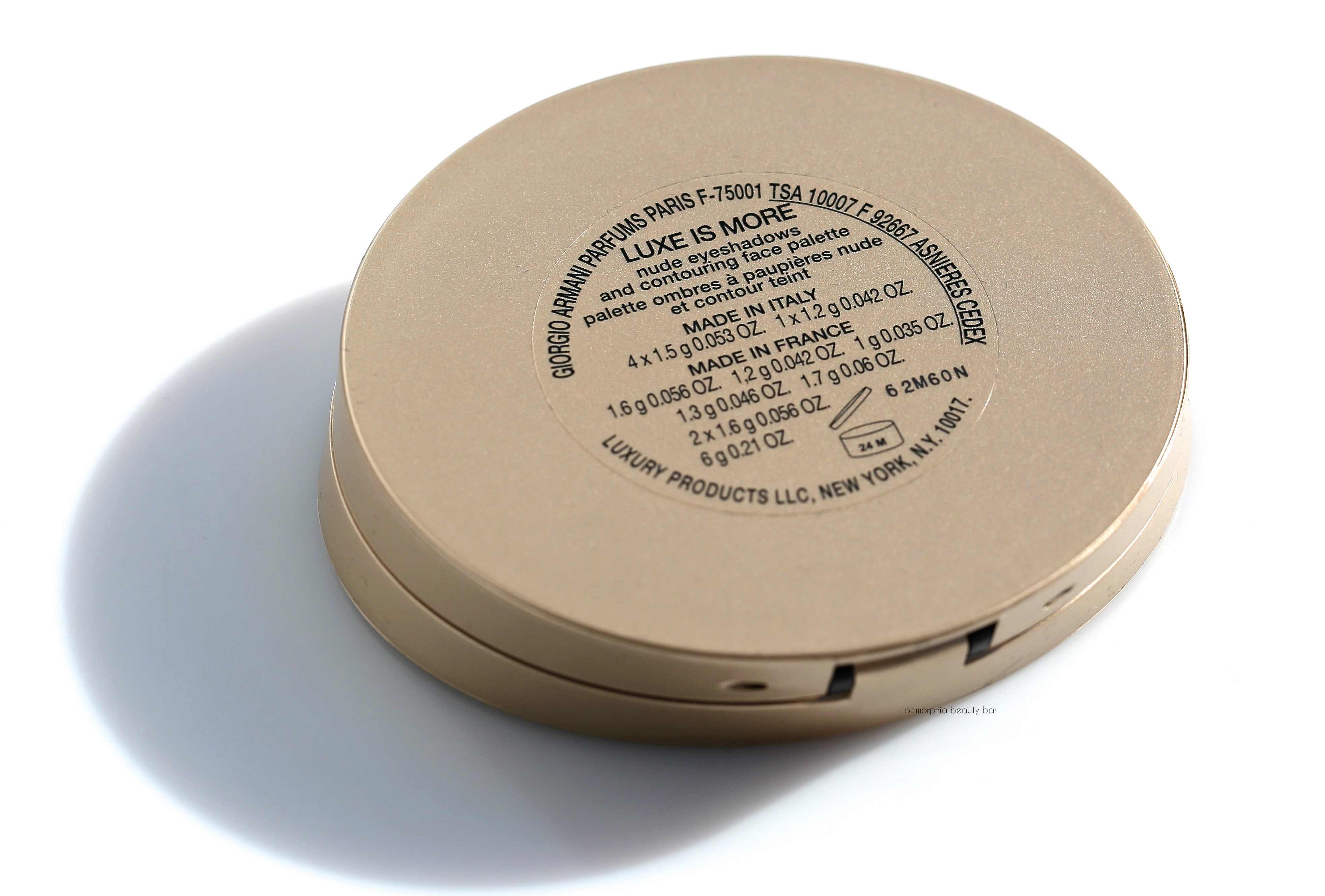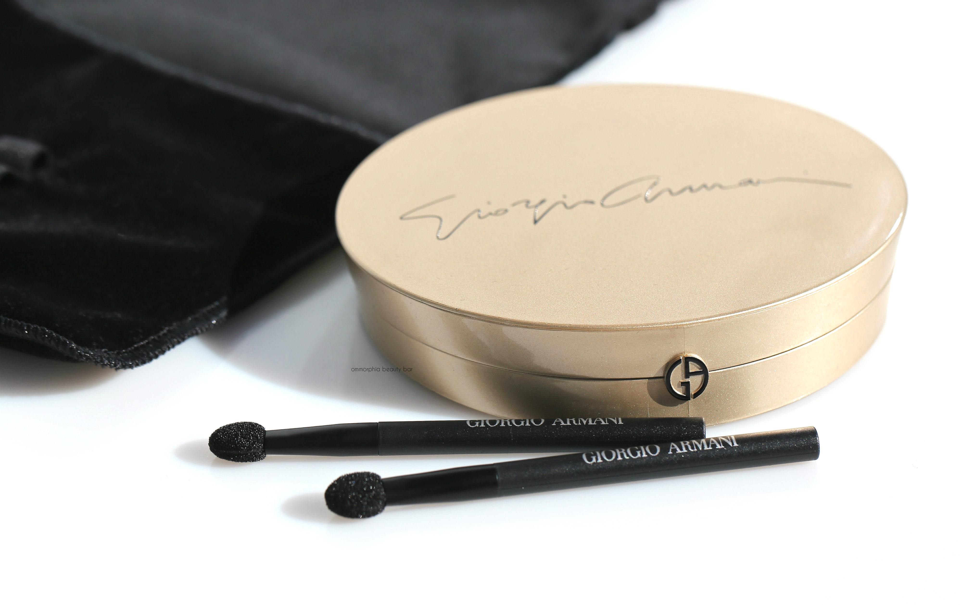 Luxe Is More Palette, Limited Edition/eyeshadows (CAN $160.00) | Housed in a protective velvet sleeve, this is a two-tiered pale gold lacquered compact printed with Giorgio Armani’s signature on the cover and a full-sized mirror on the inner lid, bearing ten eyeshadows on the upper level + 2 accompanying sponge-tipped applicators (held in place on the sleeve), and three face products + 2 black flat sponges on the bottom level. The eyeshadow shades range in tones of pale to dark, in a [mostly] pearlescent finish: