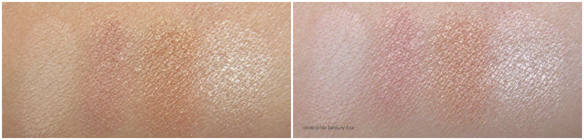All eyeshadow swatches shown in direct sunlight (left) and alternate light (right).