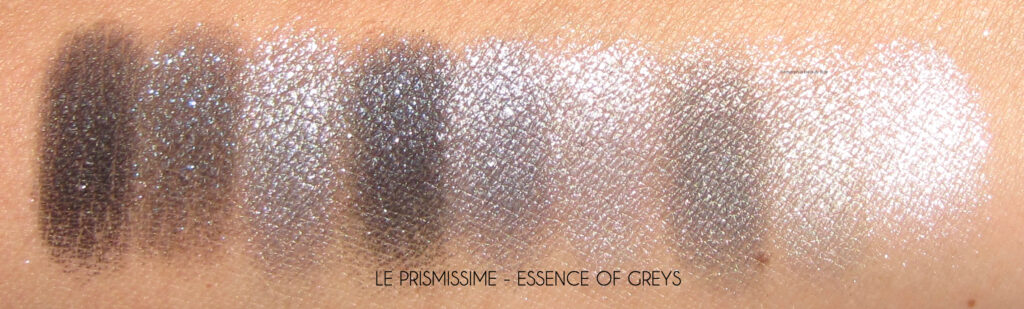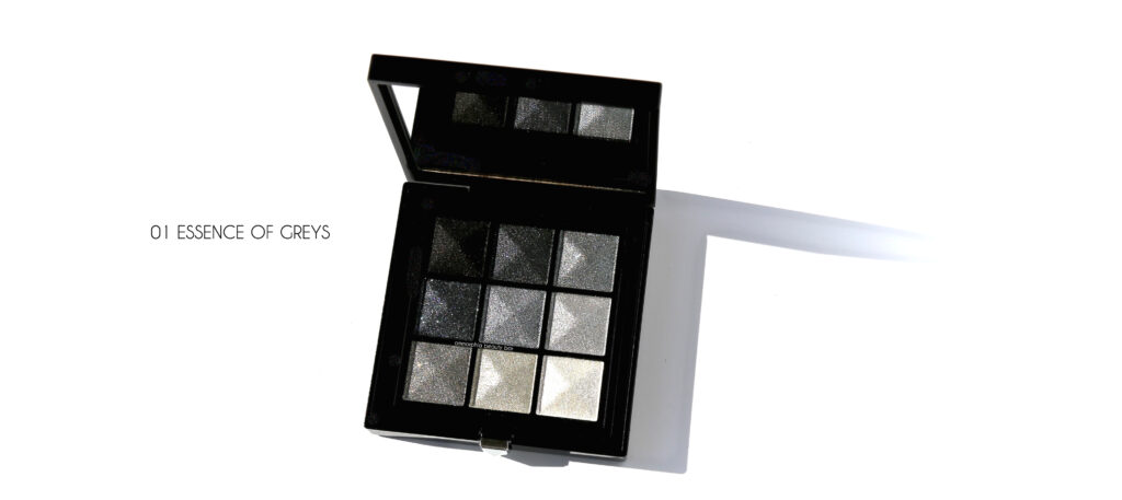 01 Essence of Greys | Recreating the grey monochromes of analog photography, this palette is the cooler leaning option of the two. Interestingly enough, there are no mattes amongst the 9 hues (with the exception of the top left shade, which is more satin than matte — but close enough), and I actually don’t mind, since the varying levels of shimmer give these shades a multi-dimensionality that can be otherwise lacking with straight-up mattes. You can always add an opaque black liner to ground things, although I’m loving the effect without.