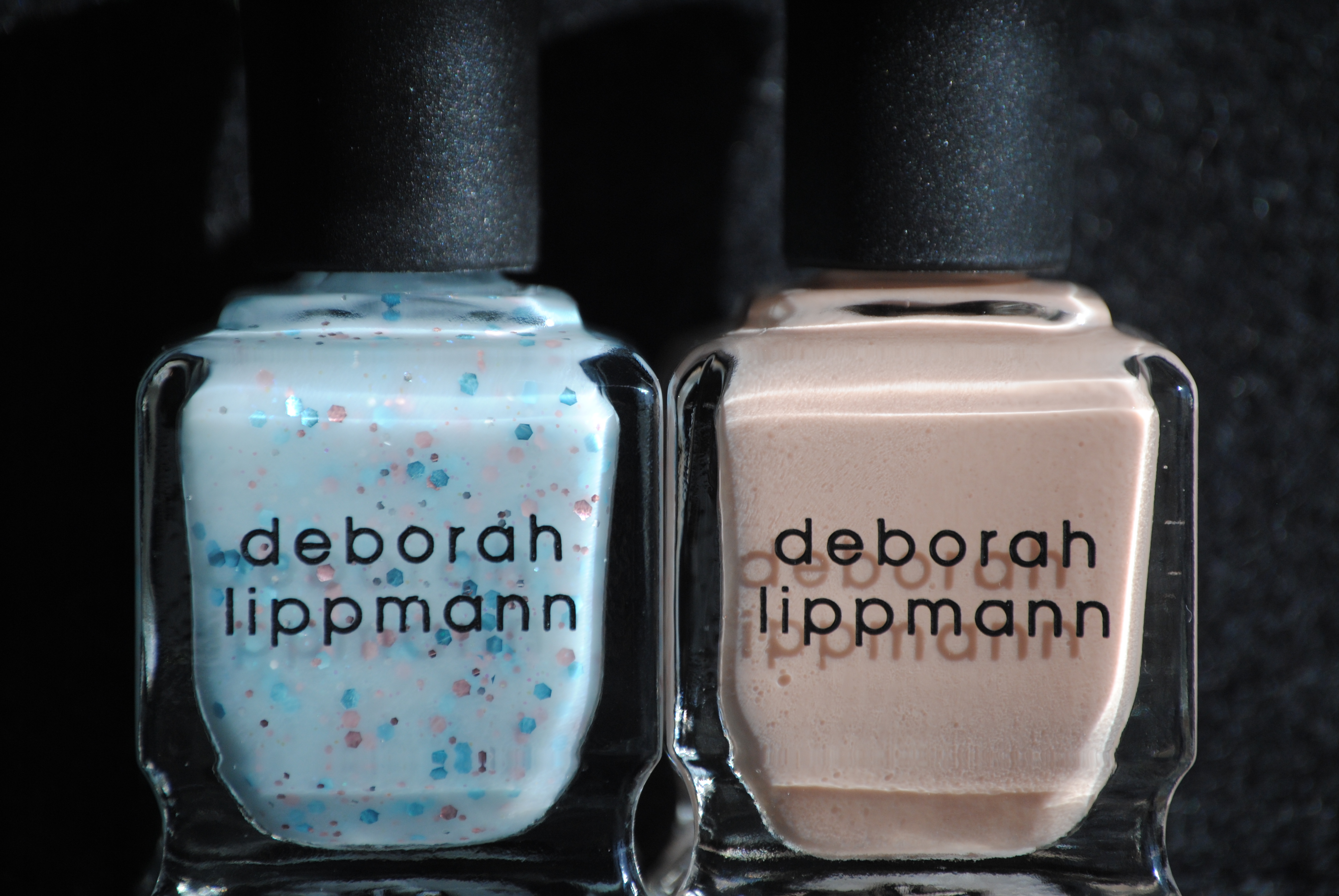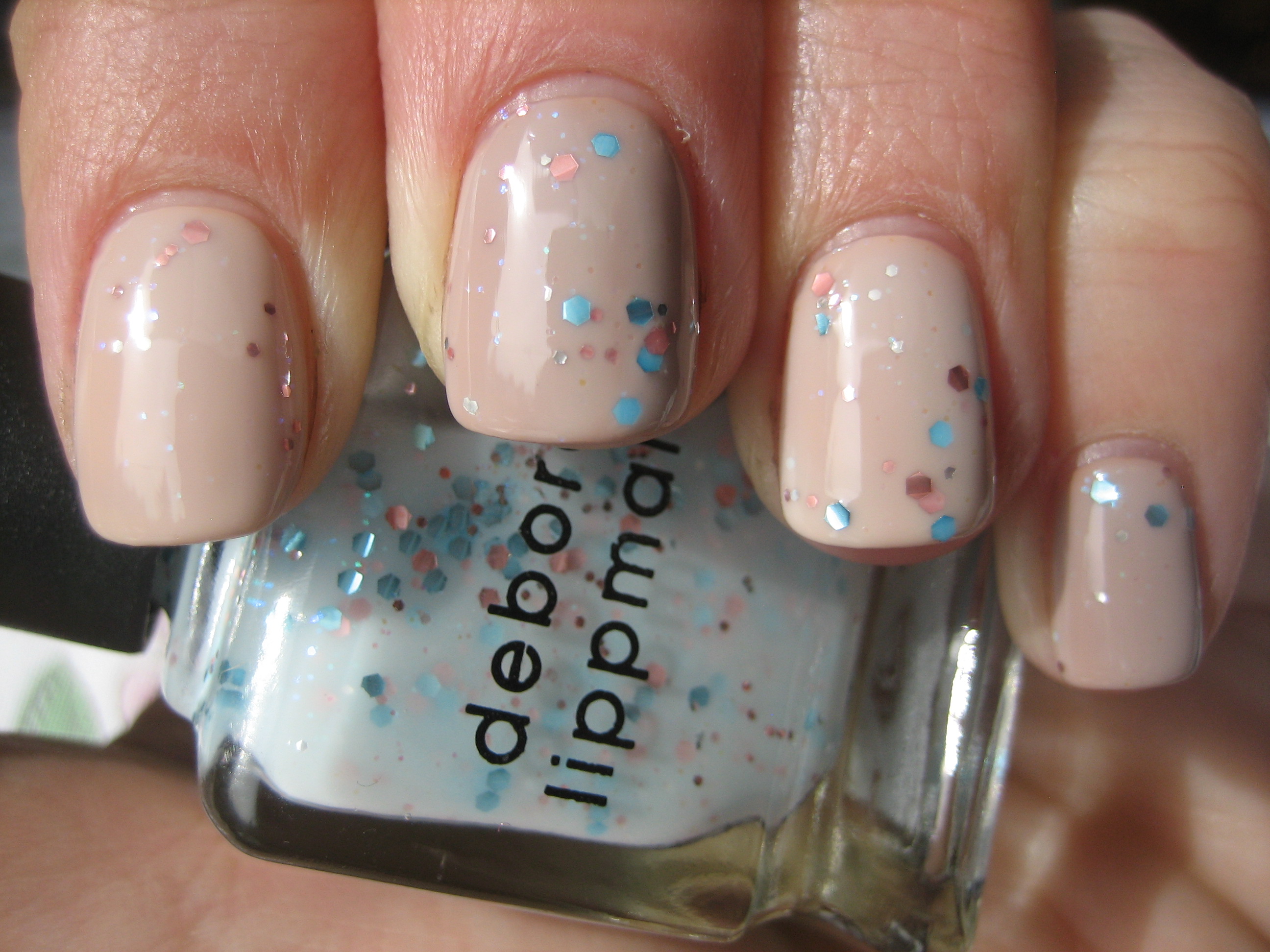 The Badgley Mishka Spring 2011 show was where Deborah Lippmann first gave us a tantalizing glimpse into one of her upcoming shades, ‘Glitter In The Air’ (reviewed here). All we knew at the time, was that it was described as a “sky blue confetti” and that she had layered it over the cult and celebrity favourite polish from her line, ‘Fashion’ – an opaque nude shade. That let us know that ‘Glitter In The Air’ was sheer enough to be layered, and that it had a fresh, Spring vibe to it. When it was announced that she would also be releasing another nude shade, ‘Naked‘ (reviewed here) along with ‘Glitter In The Air’, my first thought was that ‘Fashion’ was being removed from her lineup, but I’m happy to say that I thought wrong. Since I had the two nude shades, I decided to try my own layering experiment: ‘Glitter In The Air’ over ‘Naked’ over ‘Fashion’! Swatch is with Deborah Lippmann Rehydrating Base Coat, three coats each of ‘Naked’ (index & ring fingers) and ‘Fashion’ (middle & pinkie fingers), and two coats of ‘Glitter In The Air’, no top coat.