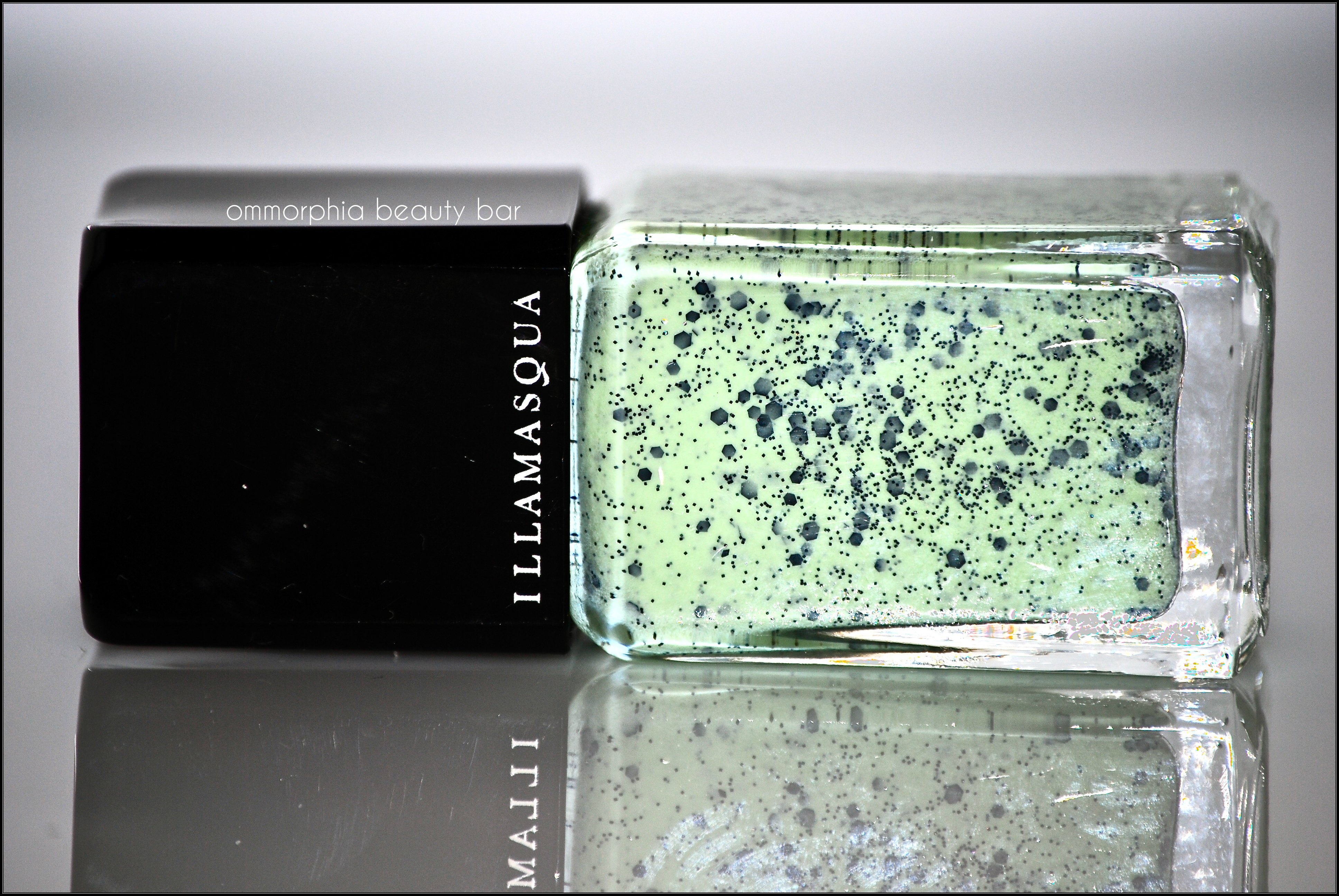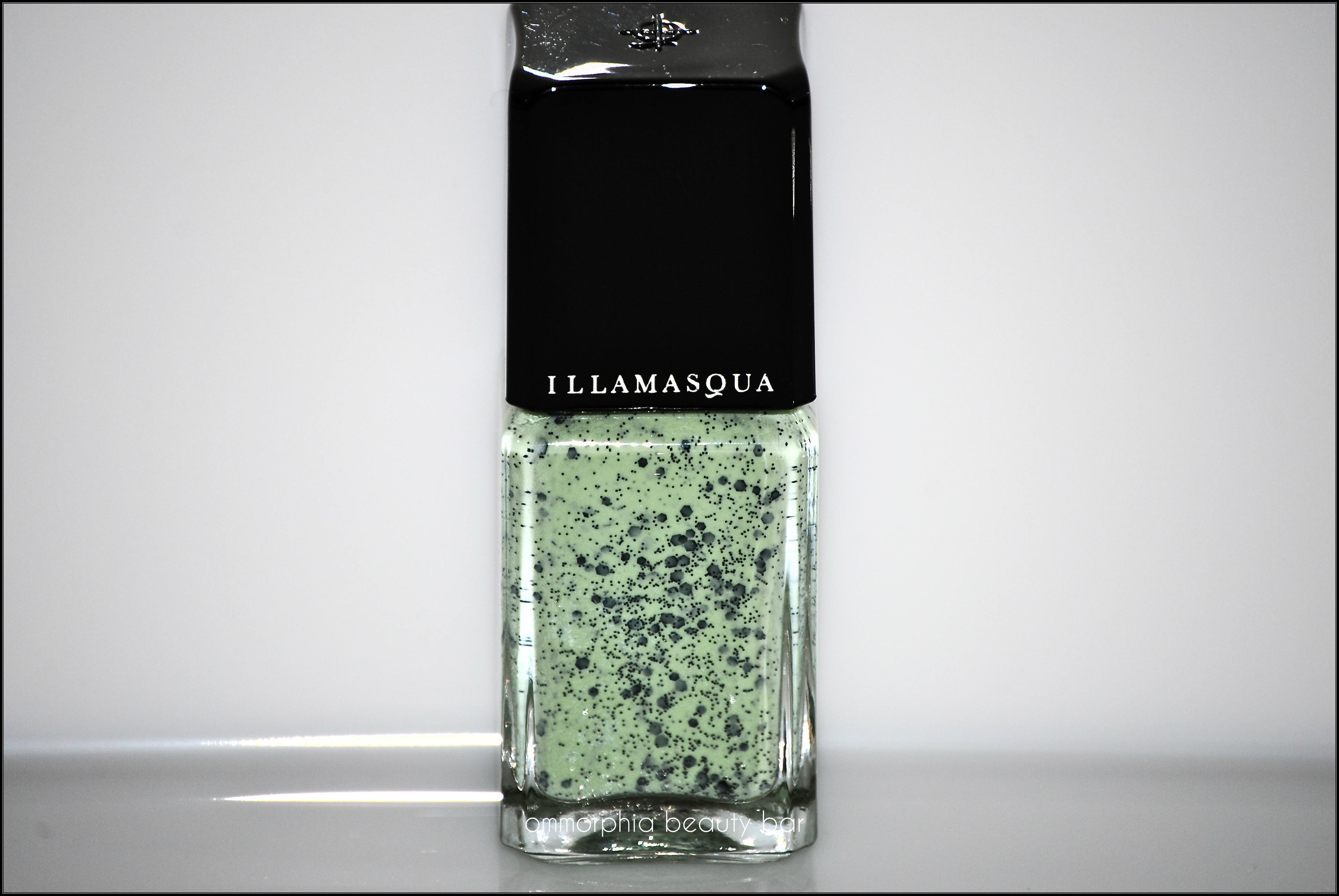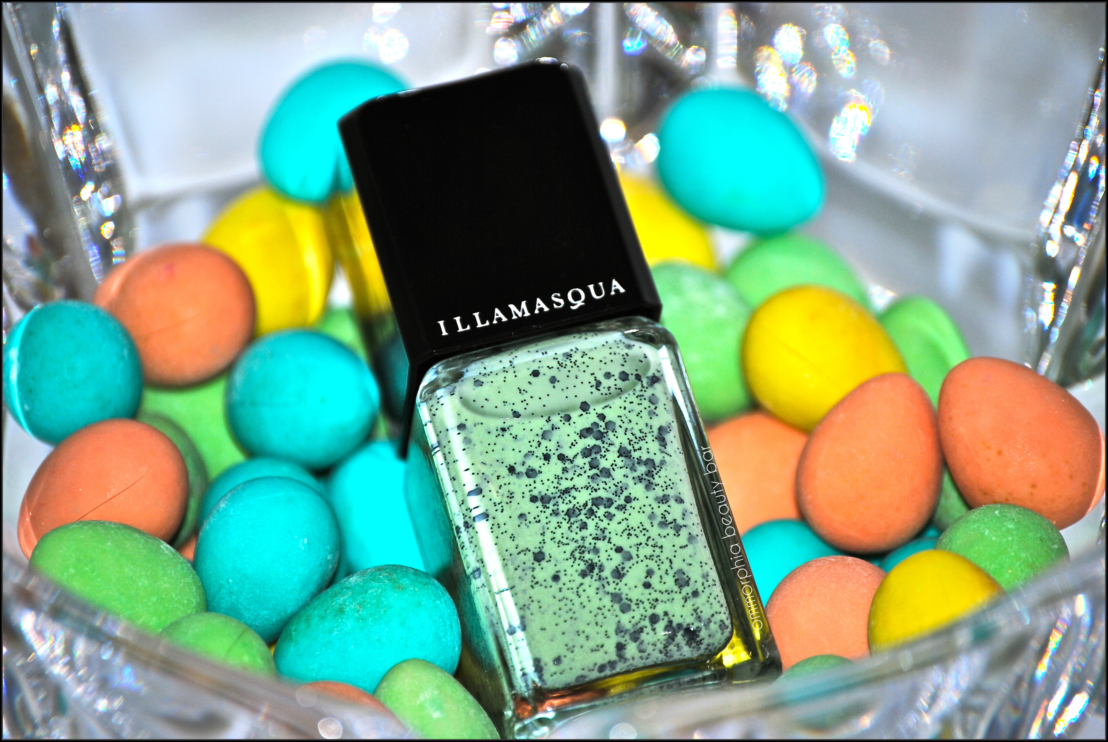 Brand new for Spring 2013, Illamasqua introduces a unique new finish in their lacquer lineup released in conjunction with their latest “I’m Perfection” Collection – 5 new shades of Speckled Varnish, meant to mimic the speckled look of bird eggs and all of their imperfect beauty, as found in nature. Of the 5, I was most drawn to ‘Mottle’ – I love the way the glitter pieces seem to paradoxically stand out and also stay just out of reach, from their seafoam green background, although I confess to having my eye on a few more of these shades – time for another shopping trip, I think.