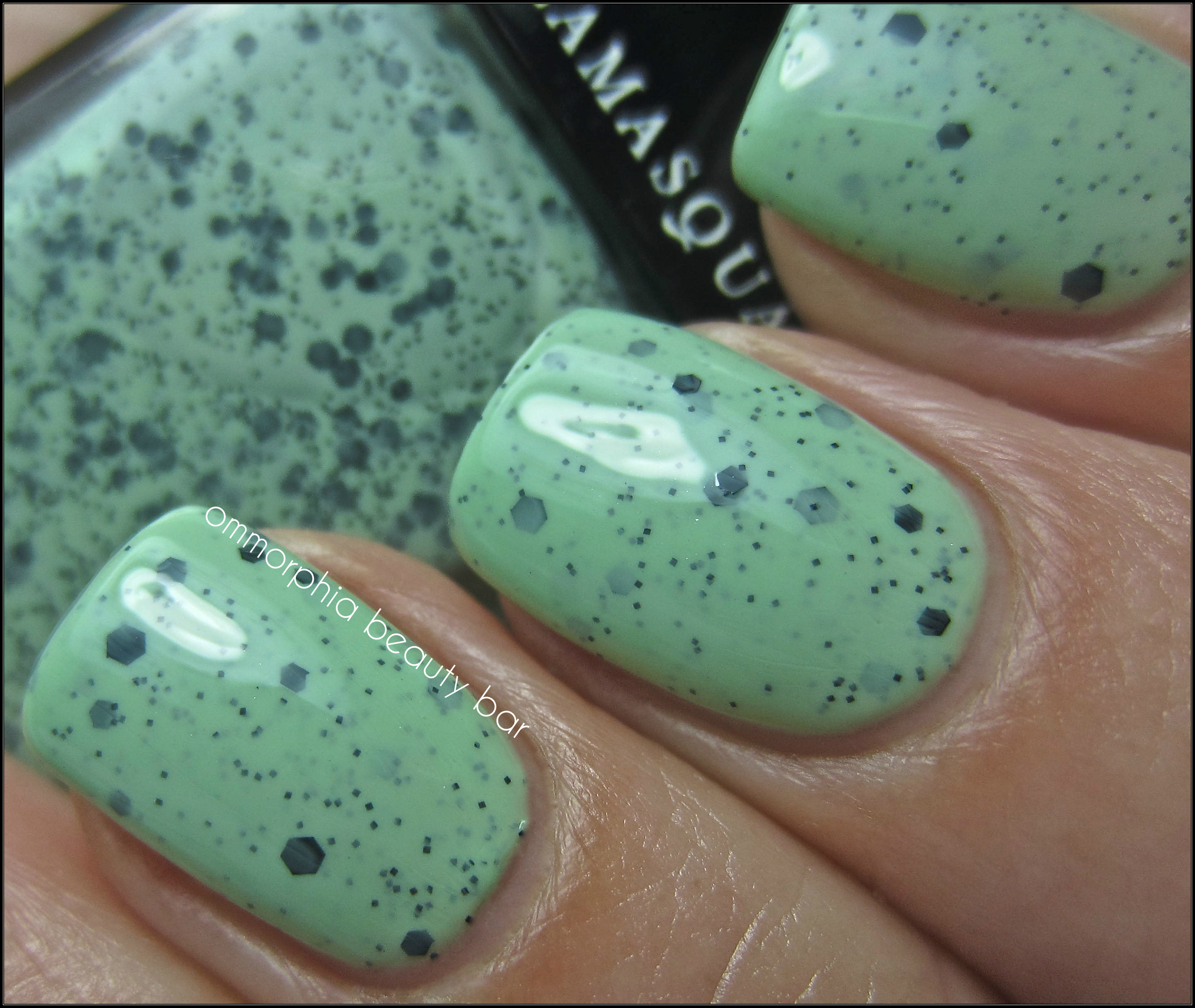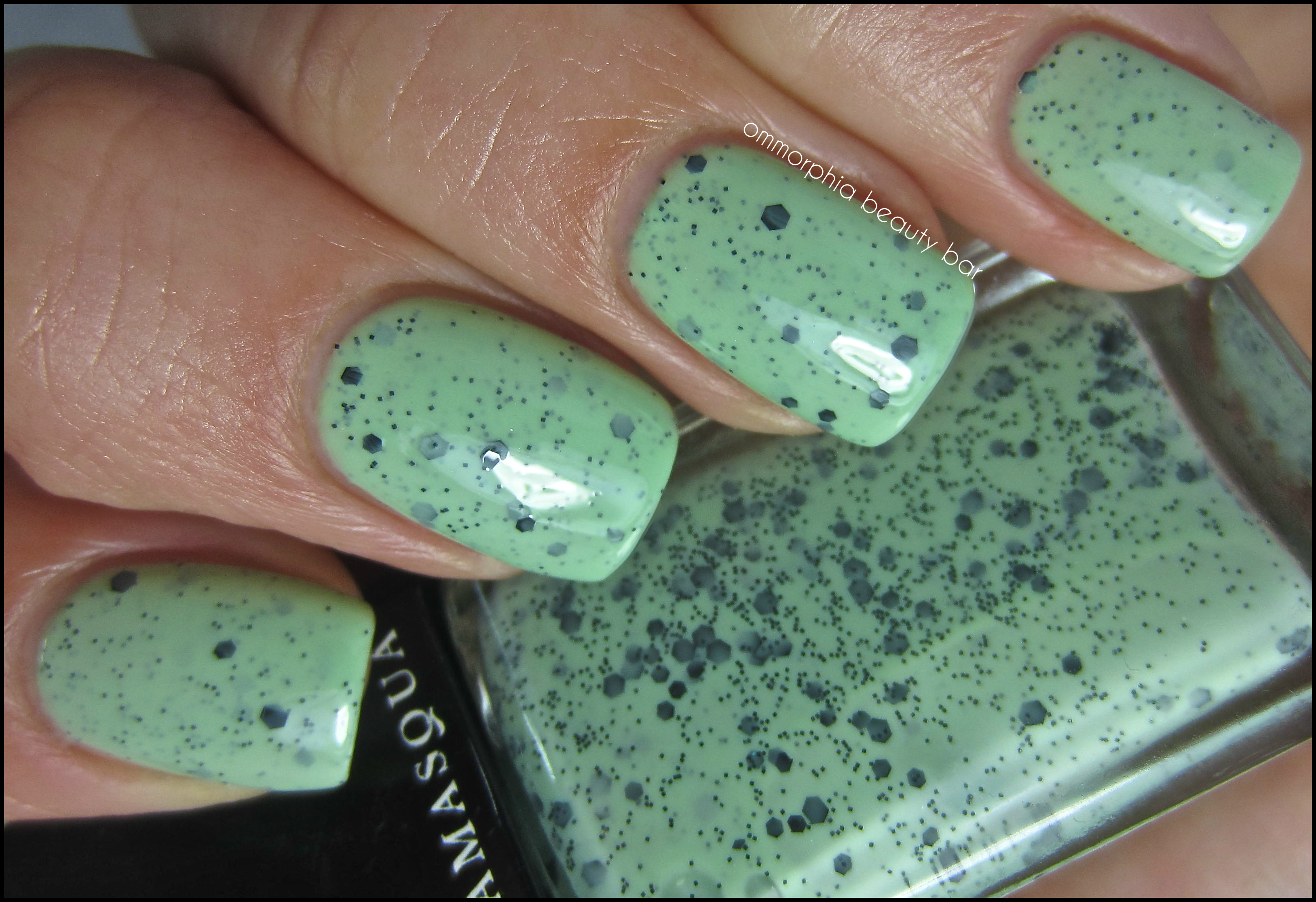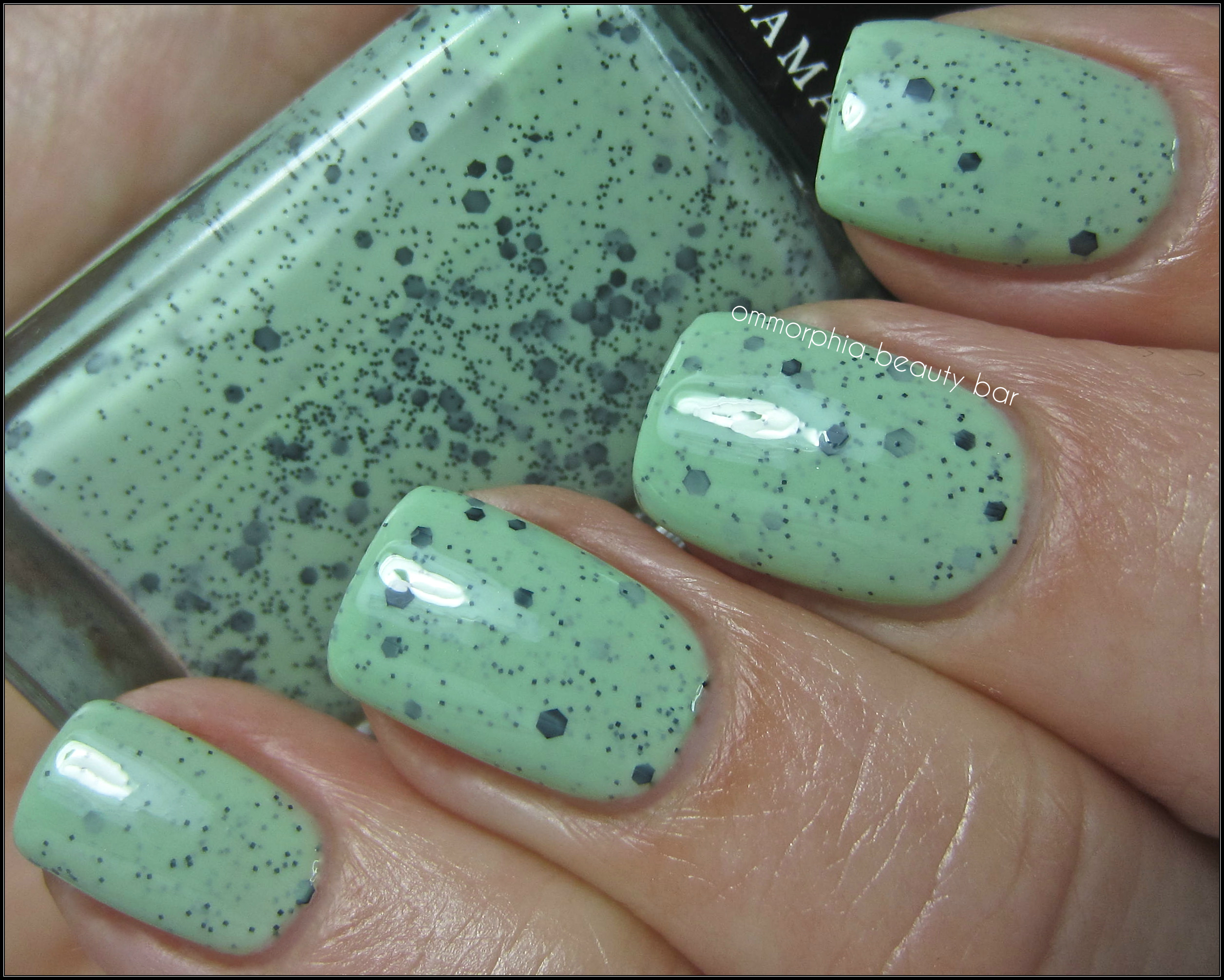 Illamasqua Speckled Nail Varnish in Mottle – (CAD $18.00 15 ml/0.5 fl.oz) a milky mint green base filled with ultra fine black glitter as well as black hexagonal glitter pieces in small & medium sizes. With a superb flow and a perfect viscosity to the formula, application was effortless, completely self-levelling, and glossy enough at the finish to make top coat basically redundant – but don’t skip that step nonetheless. Each brush stroke yields a healthy and fairly equal amount of glitter & colour, so no extra “fishing” or placement is needed, although keep in mind that this look is all about “nature” and meant to be slightly imbalanced. I was surprised to find the end result smooth to the touch, as I was expecting a lacquer with this much going on to be rather bumpy – so not the case here. Absolutely loving its diffused/filtered look, as though the glitter has risen from the bottom to come just shy of the surface – totally fascinating. Bonus: fairly easy removal. Coats applied: 3 (thin – mainly for pictures, as 2 coats provides more than adequate coverage), plus top coat.