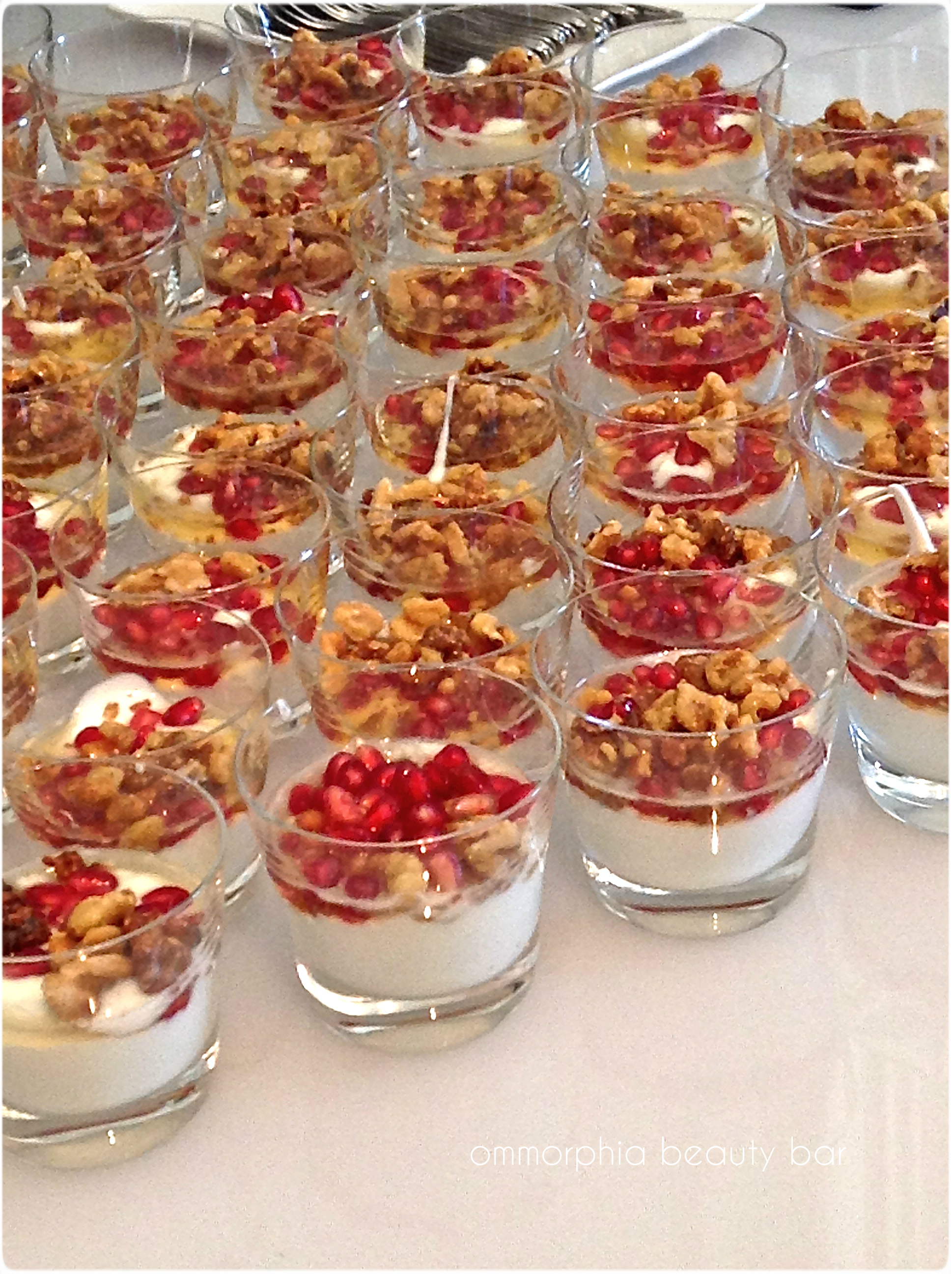 Greek yogurt cups sprinkled with Greek honey, pomegranate seeds, and walnuts