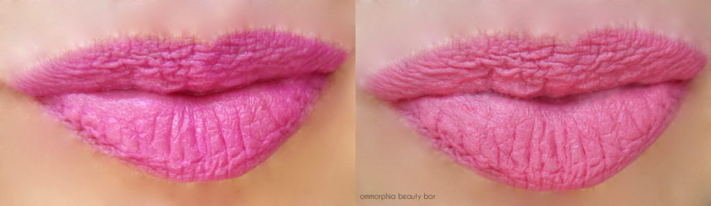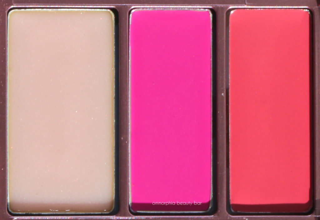 The three lip hues can be worn individually, or mixed & matched/layered; when applied solo, the more vivid pink shade gives the better coverage of them all and has a slightly more satiny finish than the coral pink. Using a brush for application (such as the one supplied in the compact) can be somewhat time consuming and I’m not that crazy about the brush strokes it can leave behind; your best bet is to apply these with your finger and literally press the colour into the lips for a smoother finish and that sexy “bitten” effect.