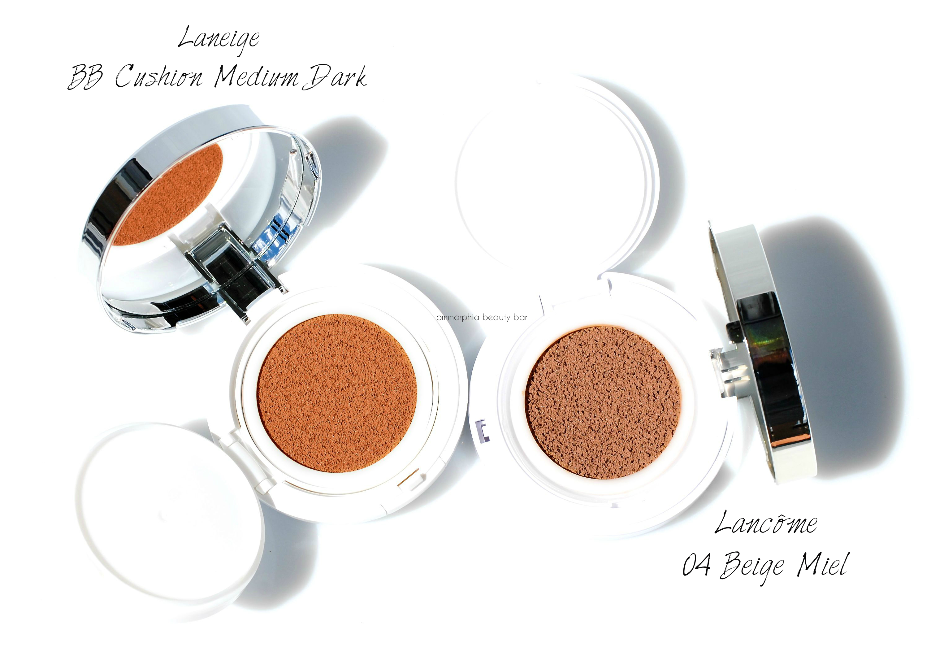 When I was recently Stateside, I picked up the Laneige BB Cushion in Medium Dark that I had heard so much about, and of the 3 Lancôme Miracle Cushion shades I was sent, 04 Beige Miel appeared the closest. How they compare: