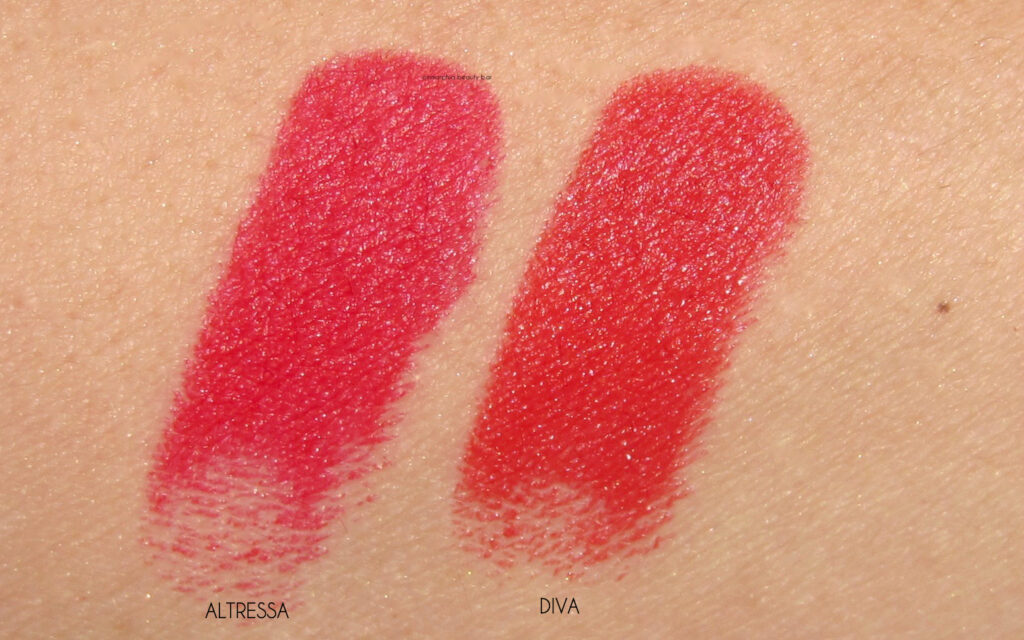 The texture of these lipsticks is buttery smooth with pigment saturation off the charts, providing full coverage by a single swipe. The “velvetized” look of the lipstick bullet designates its finish: not fully matte, but more velvet-like in both feel and finish, with a slight sheen for depth. As to staying power, we’re talking major and while reapplication will be needed at some point due to some emollience in the formula, does it matter? You’ll WANT to whip one of these out in public, I can assure you. Both shades fade to a light stain, long after most of the colour has gone.