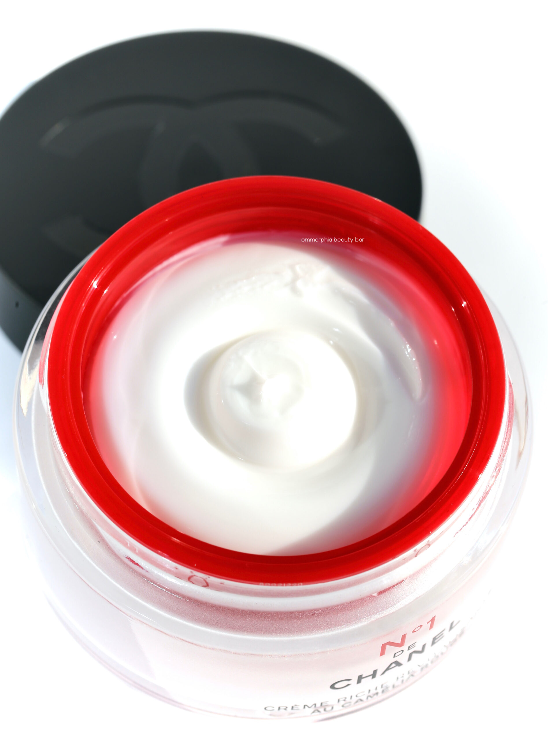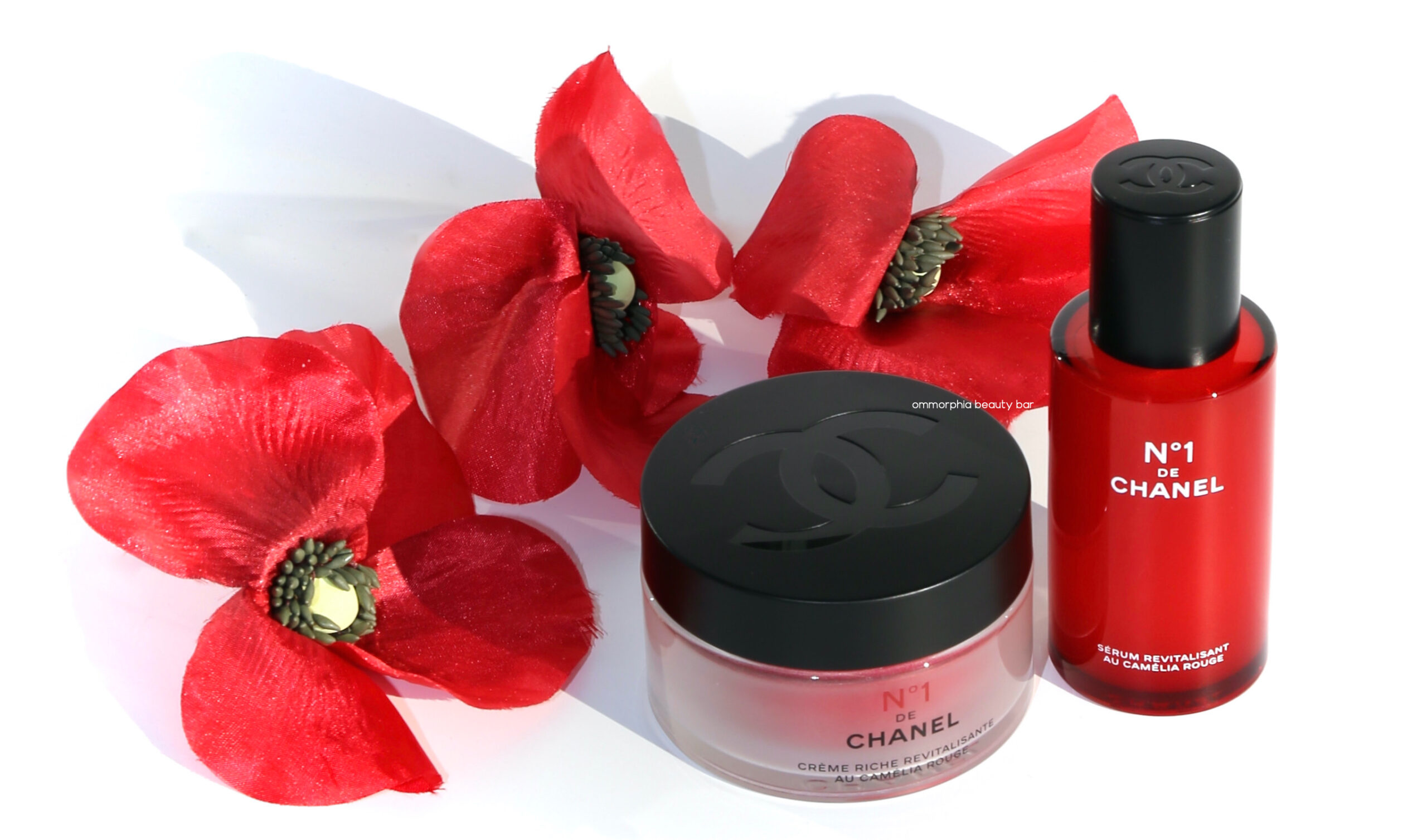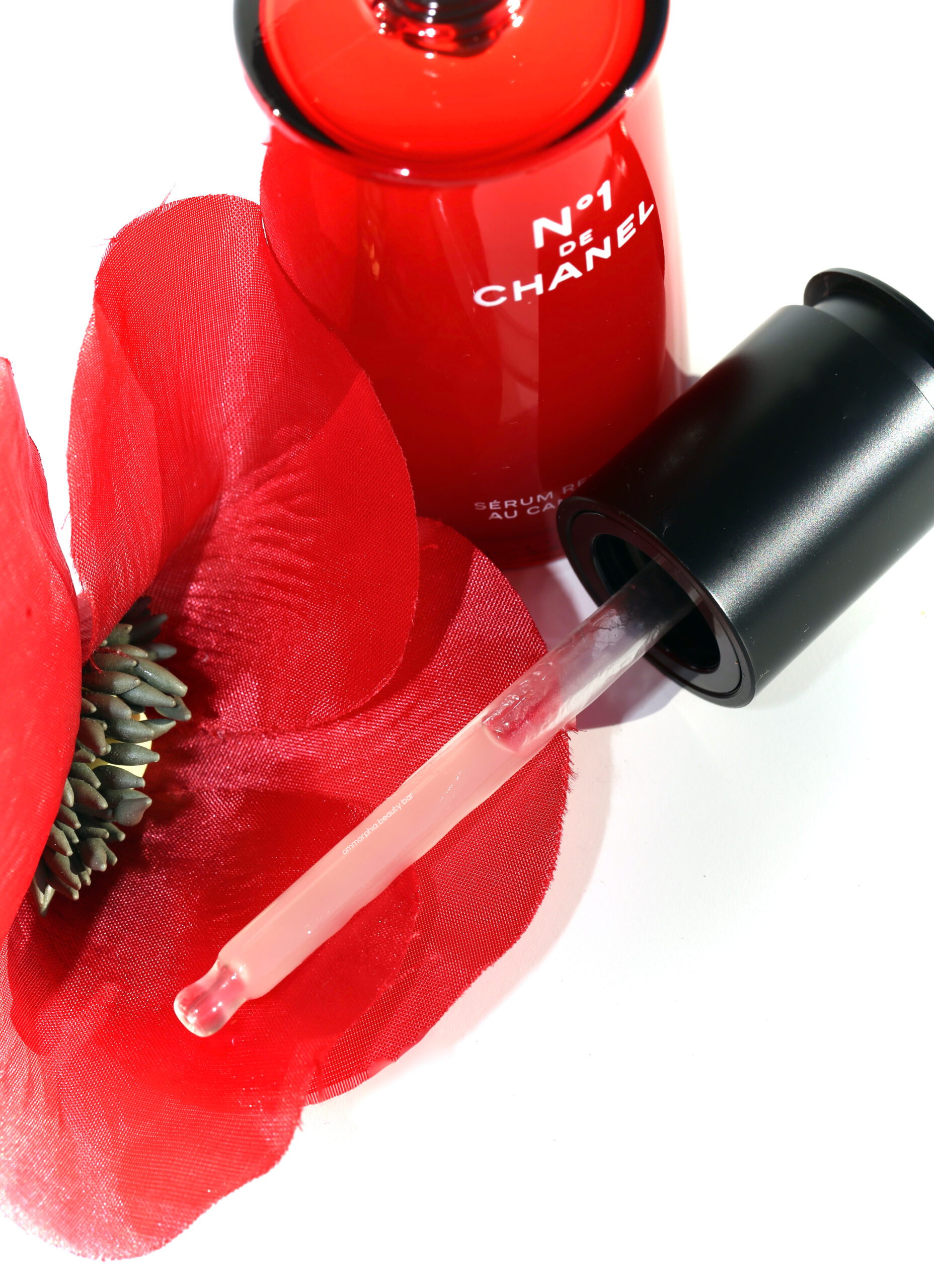 N° 1 de CHANEL Red Camellia Revitalizing Serum (CAN $192.00/50 ml, 1.7 fl oz) | Housed in a sleek red glass bottle, the delivery system is interesting; by twisting the cap counterclockwise, it pops up and you can then press on it to draw the contents up into the stopper. Concentrated in red camellia extract, the fluid nature of this serum absorbs quickly into the skin, leaving no greasy residue behind. The formula contains up to 97% ingredients from natural origin and 76% camellia-derived ingredients for maximum benefit. Just one dropper-full should be enough to cover the entire face & neck, although I prefer using a bit more as I like including the décolletage areas as well. When paired with the Rich Revitalizing Cream, this serum becomes enhanced and works even harder to provide age-benefitting properties. Lightly fragranced, but which dissipates soon after application.
