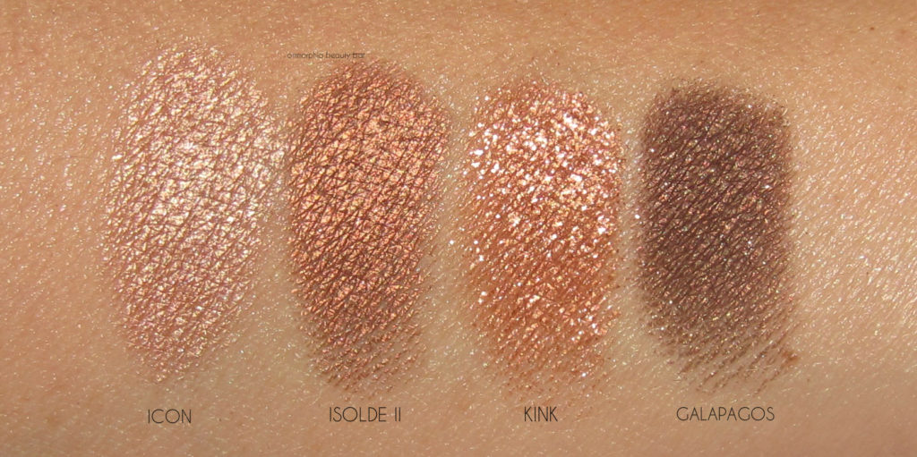 All four shades have excellent staying power when applied over primer (as my lids tend to get oily, I never wear eyeshadow straight up), with the colours staying true until removed. Kink is a unique animal and there are many ways to work it; using a flat paddle-shaped brush to dab it over any of the other shades yields a fun glittery touch — or even on its own, for just a hint of sparkle. If going the latter route, you will need an anchor (primer) to keep the glittery bits in place, although some will probably fall down just the same (again, I personally don’t mind as I prefer a more ‘lived-in’ look). Applying it with a dampened brush calls forth some major impact and really brings out its copperiness — again, that way is a bit editorial-looking, but paired with mascara and keeping the rest of the face/lips minimal, makes for one helluva stunning statement.