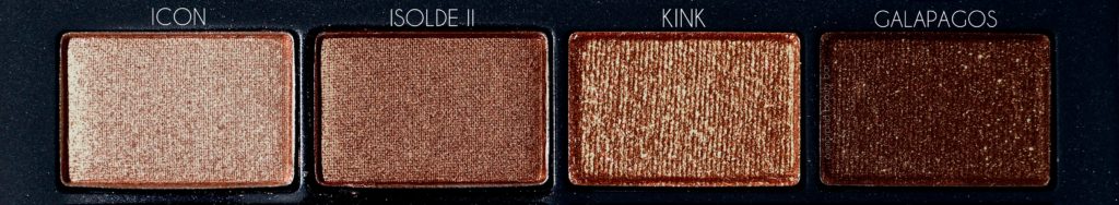 Atomic Blonde Eye and Cheek Palette, limited edition (CAN $74.00) | The packaging design gives a pretty good idea of what’s on the inside: warm leaning neutrals, with a bit of sizzle on the side. Of the 4 eyeshadows, both Icon & Isolde II (the latter is part of a duo in the brand’s permanent range) display a creamy smoothness upon application, while Kink is the glittery-est of the bunch — and therefore needs a bit more attention — with Galapagos rounding things out via depth of tone and a light sparkling touch. As to highlighters, Last Call is exactly what I’ve been looking for: a shade that’s neither too yellow nor pink, with a buttery application that lasts & lasts. When it comes to bronzers, my preference lies in something that has a bit of ‘muddiness’ as I find it works best with my skin tone. That said, Unleashed is that perfect mix of warm & cool, with a drier texture that suits me fine, as I find I can control the application better.