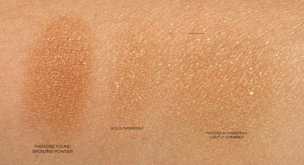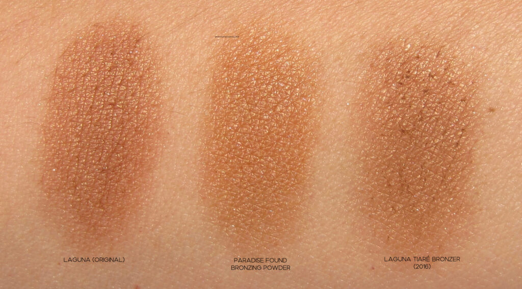 I decided to pull out my original Laguna Bronzer as well as the Laguna Tiaré Bronzer launched in 2016 from the Tahiti Bronze Collection (reviewed here) for comparison because I wanted to see how Paradise Found compared. As can be seen in the above swatch, the original is several degrees deeper, although that may also be because it’s older. The Tiaré version appears to lean slighter cooler and even seems more pigmented. Fun fact: the heavenly fragrance of Paradise Found actually made its debut with the Tiaré bronzer.