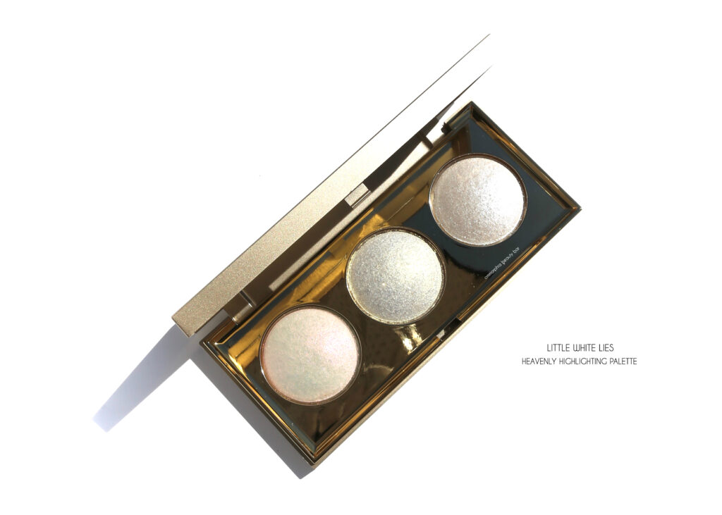 Little White Lies Heavenly Highlighting Palette (CAN $59.00) | This limited edition palette holds 3 white highlighters that each contain a different undertones: pink, gold, and blue. The cream/powder texture is unique as well, feeling bouncy to the touch and even slightly cooling upon the skin with initial application. The translucent base allows the pearlescent shimmers & micro-fine glitters to show up as a “glistening effect” upon the skin — absolutely gorgeous and totally ethereal. The gossamer light formula means it’s non-tacky and completely weightless in feel and while you can definitely wear each shade solo, you also have the option of layering them over blush for even more impact. Note that this does leave ultra fine glitter particles along the skin and while visible, they somehow manage to look ethereal just the same.