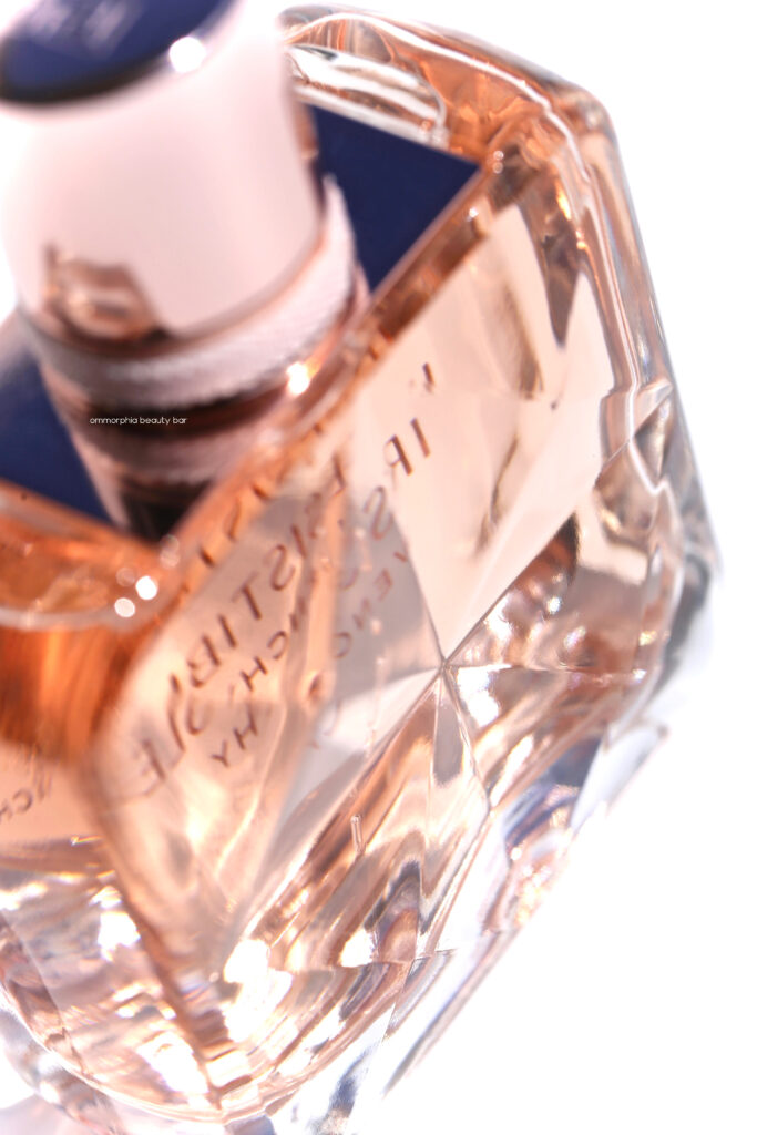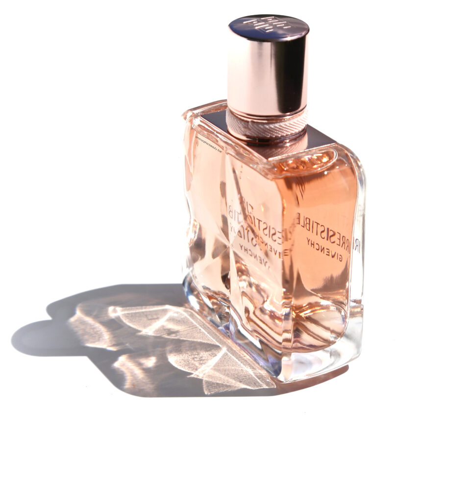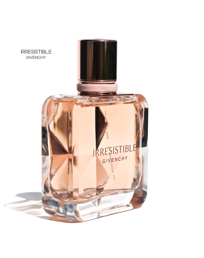“This uplifting rose is sparkling. It begins with fruity, juicy and crisp tones of pear and ambrette, and then pulsates with a powdery iris transcending through it. This rose and blond wood dance lends a measured tension before coming together deliciously with an easily set off musk. The new invigorating IRRESISTIBLE GIVENCHY is a bold invitation to let go”