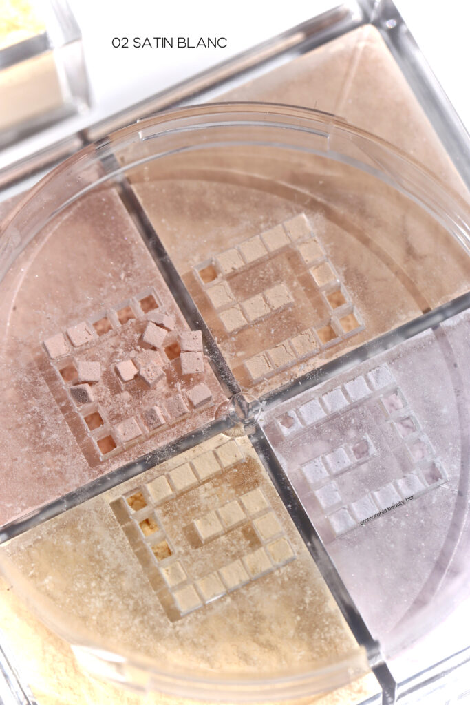 02 Satin Blanc|Targeted towards fair skin, the four ‘nude’ shades here help with neutralizing even the slightest grey tinge your skin might have, and thus help to bring back brightness. My skin right now has a light summer tan so applying this powder before blending looked somewhat scary, but I was really impressed with how easily it blended out just the same. That said, I feel that these shades will be perfect for me once my tan fades.