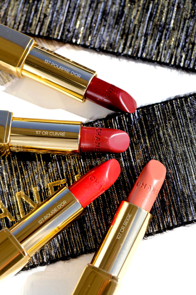 Rouge Allure Lipstick (CAN $57.00/each) | The iconic lipstick case of this range gets dressed up for this holiday collection, complete with gold touches along all 4 edges (for the record, this case was first introduced with last year’s holiday collection). The formula is super creamy and well pigmented, and the subtle golden flecks within each shade pays tribute to Gabrielle Chanel’s unconditional love for the colour gold. The emollient nature of this formula means that reapplication will be needed at some point, especially after eating and/or drinking, and all except for 107 Or Beige fades to a nice stain, leaving a hint of added colour.