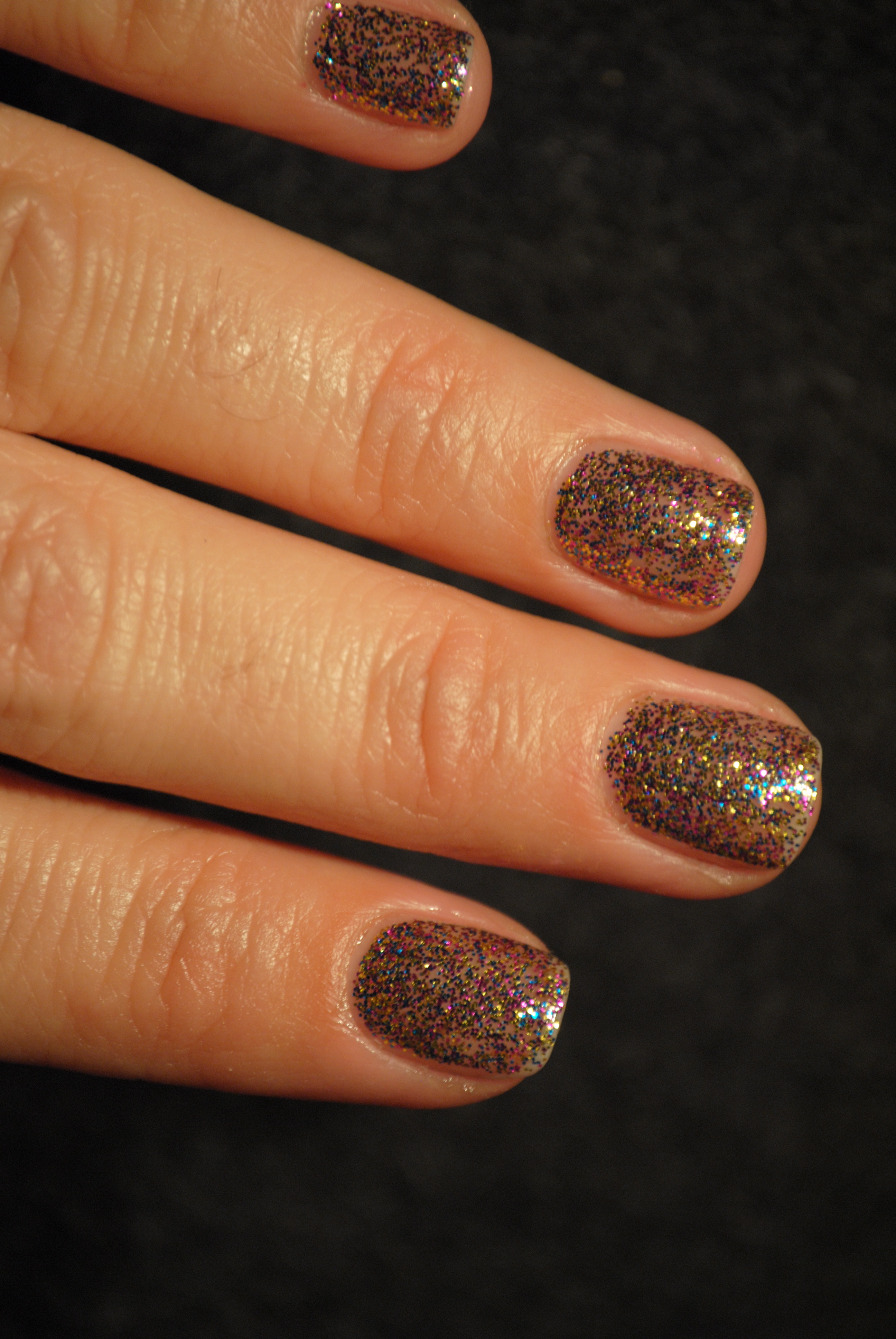 From all the glitters presented in this collection, Sparkle-icious was the main one that caught my fancy, probably because I thought the combination of colours was so unique. It has the same look and feel to it as ‘Mad As A Hatter’ from OPI’s Alice In Wonderland Collection, with the obvious difference being that Sparkle-icious is gold based while MAAH has a silver base. The glitter in both is multi-tonal with the same size and shape suspended in a clear base. Sparkle-icious has equal amounts of yellow, gold, blue and purple glitter which means that the entire nail gets covered fairly equally. I had no issues with spread or needing to move any glitter around, and I used the same combo as above: Deborah Lippmann’s Rehydrating Basecoat, three coats of polish and one layer of Seche Vite top coat although next time I would use two layers of top coat to give the nail a smoother finish. Clean up….well, let’s not go there, shall we?! Yes, it’s messy and more difficult than other polishes but I find that if I saturate a cotton pad with acetone and place it on the nail for at least one minute, it helps with removal immensely. The pictures here truly do not do this polish justice, however, as it is so much more glittery in person.