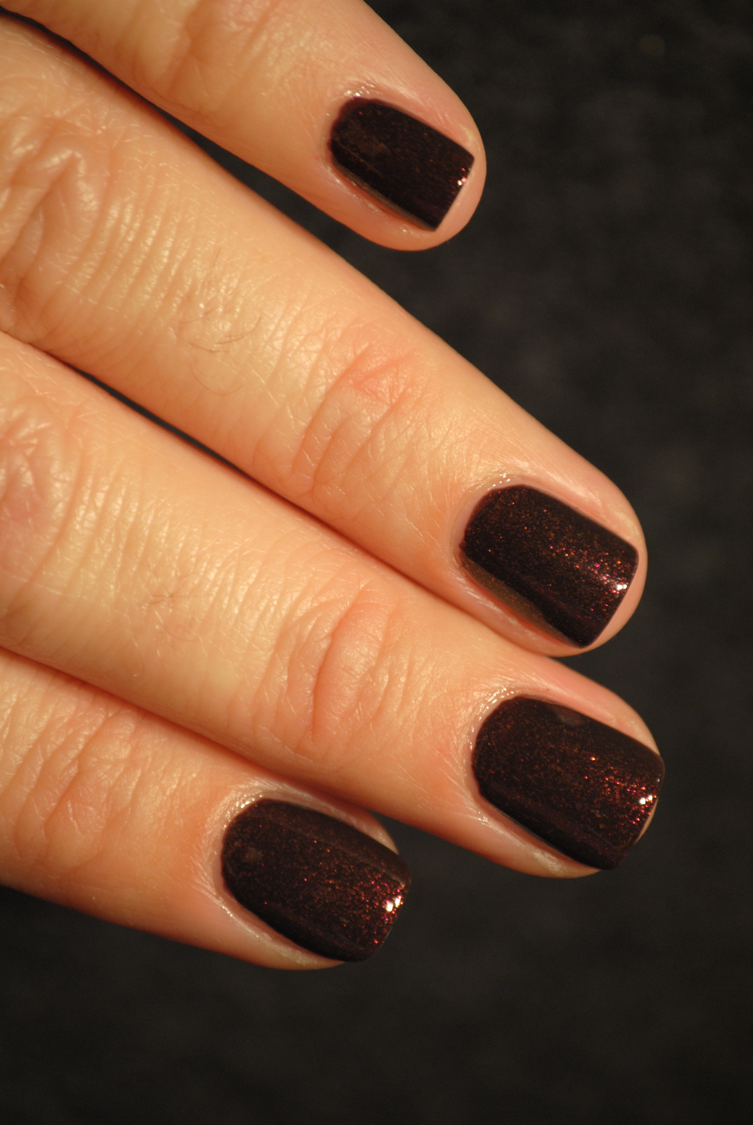 Tease-y Does It is a deep & luscious browned burgundy but what gives this colour such ‘oomph’ is the orange and magenta micro shimmer in it’s depths. The best I can describe this colour as being, is like looking at banked embers in a fireplace….it has that same almost lit-from-within look to it. That inner glow not only sets it apart from other wine/burgundy shades, but in my opinion, makes it THE standout shade of this collection. The flow was excellent, basically opaque with the first coat and left no visible brush strokes whatsoever. This was done with one coat of Debra Lippmann’s Rehydrating Basecoat, three coats of polish, finished with Sech Vite top coat. The only issue I found was that I expected the finished result to be a lot shinier than it actually ended up being, but that’s not enough to deter me from the fiery richness of this shade.