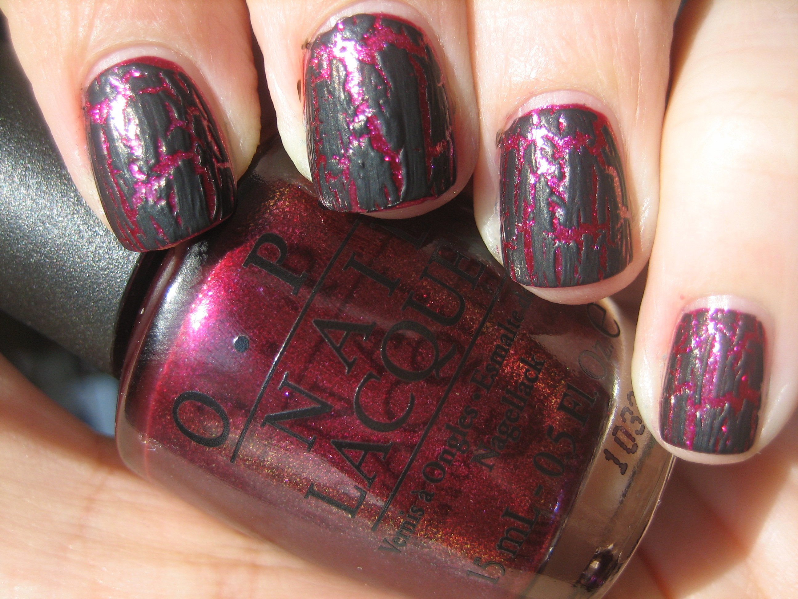 Once you layer it with ‘Black Shatter’, the look is instantly morphed from princess bride to glam-rock chic! What I found interesting is how the glitter peeks out and flashes at you from between the cracks of the Shatter and the fact that the base is so light, makes the black that much more prominent, thus taking center stage. Note in the bottom photo, how much more pronounced the effect is with a layer of top coat to seal everything in.