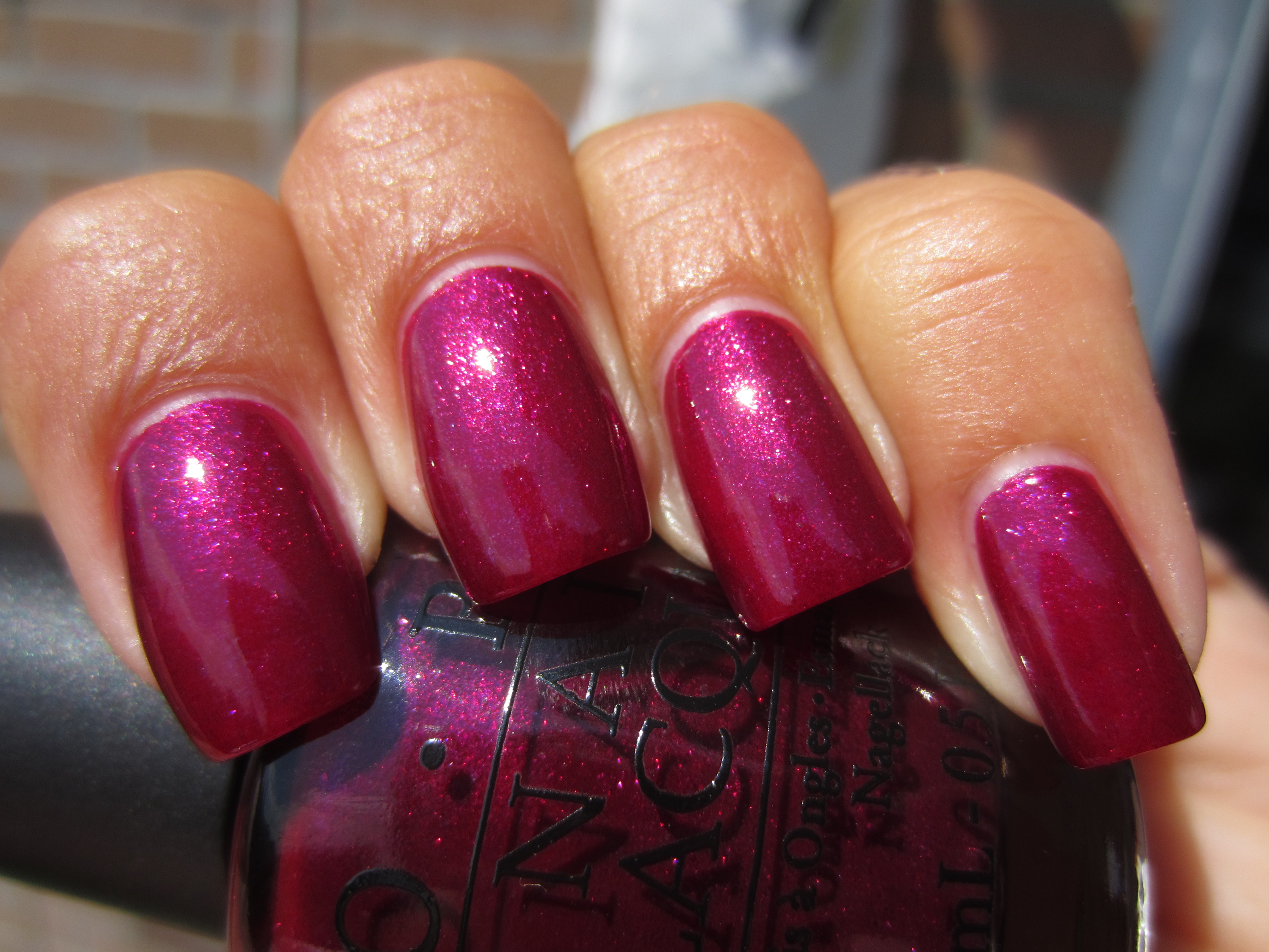 ‘Congeniality Is My Middle Name’ (all right OPI….enough with the mile-long names, already!) may at first seem like a simple magenta hue, but delve a little deeper and you can entice a magical side to this shade. Filled with a blueish inner shimmer, it has that “lit-from-within” look that I so love and which gives this shade such a unique twist. I applied two coats for the following swatches.