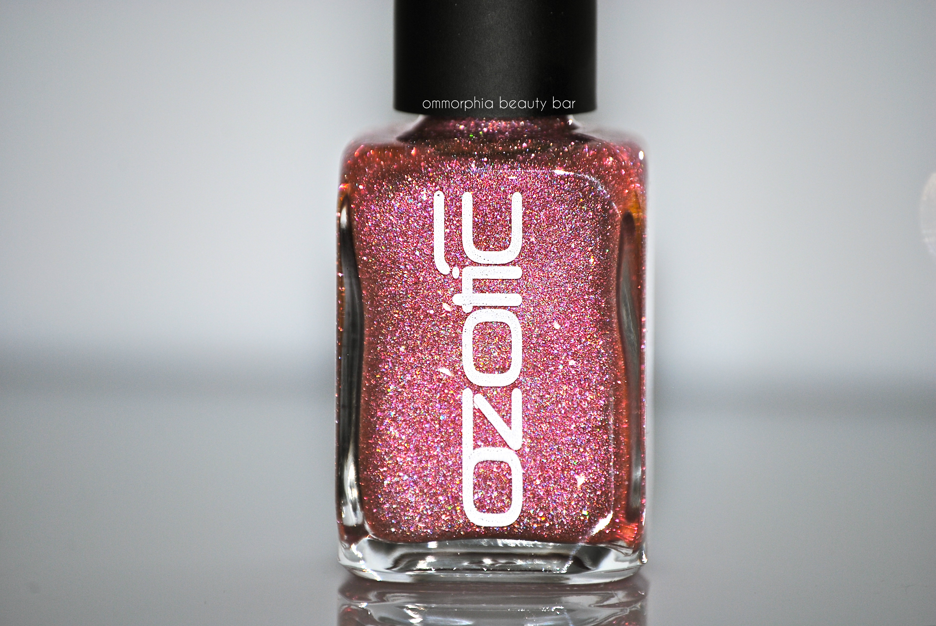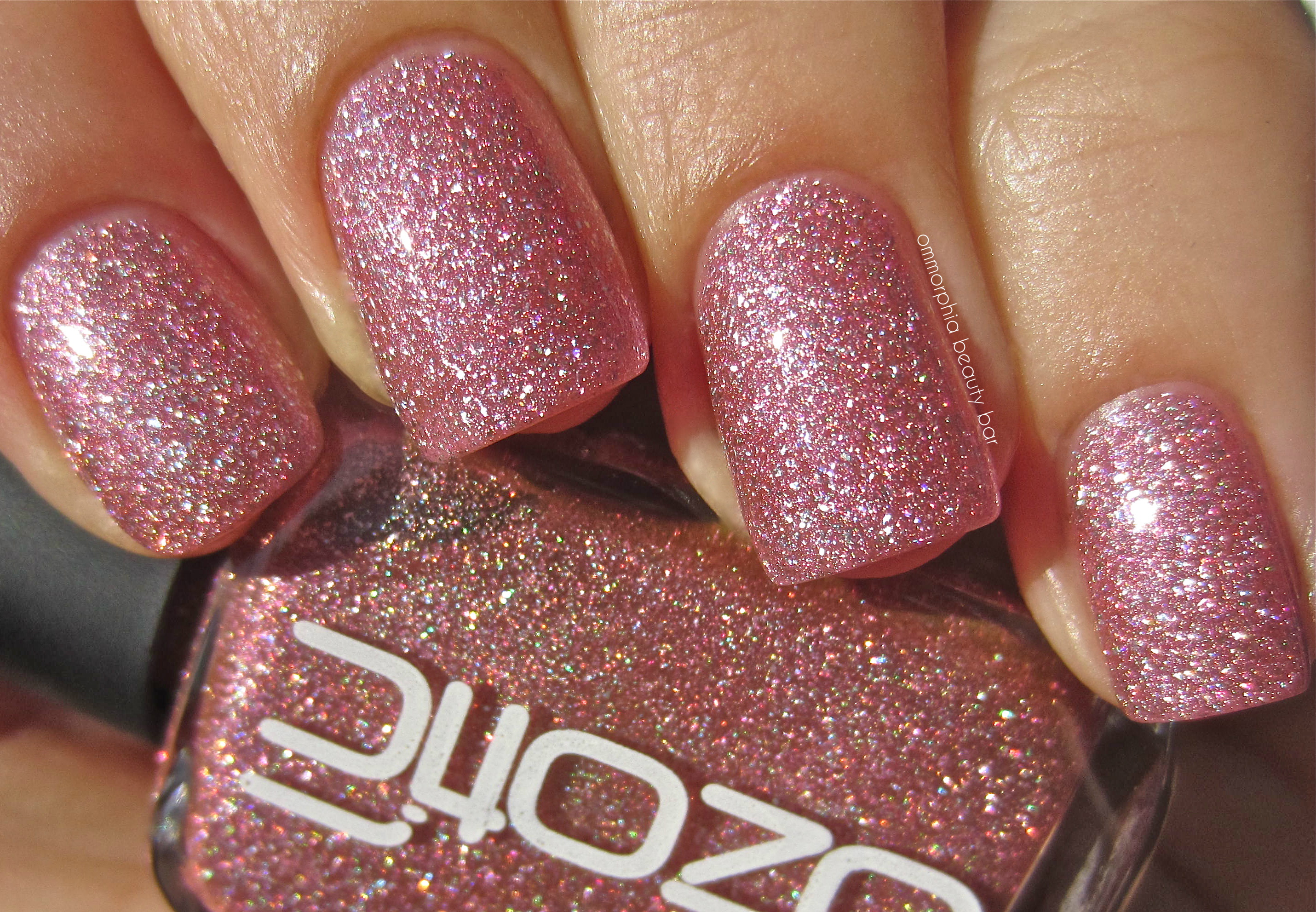 Ozotic by piCture pOlish #601 (CAD $14.50) – densely packed with finely ground pink and prismatic glitter, you’d be forgiven in not realizing that the base of this shade is actually clear. Worn alone, the look is one of dainty femininity, albeit the scattered holographic effect gives it a modern edge — layered over a dark solid hue, however, is the best way to bring out its multi-tonal refractions. Bearing an excellent formula that falls in a self-levelling and brush stroke-free manner, the finish is on the satin side and so benefits from the addition of top coat. Coats applied: 2, plus top coat (applied alone) and 1, plus top coat (layered over a black crème)
