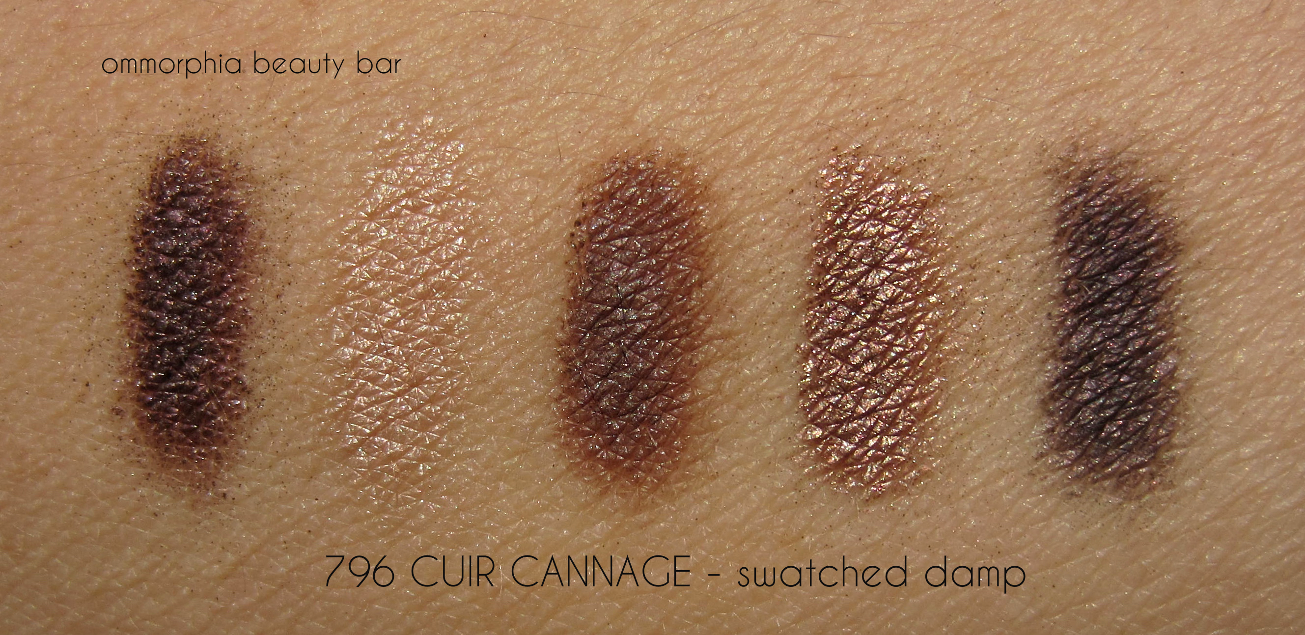 I opted to compare 796 Cuir Cannage to other smaller similarly toned palettes in my collection (I didn’t bother with palettes that had more than 5 shades – that would have taken me weeks to go through it all), with 4 CHANEL quads showing the most promise. Apart from the difference in number of shades (5 vs 4), here are the breakdowns (click to enlarge):