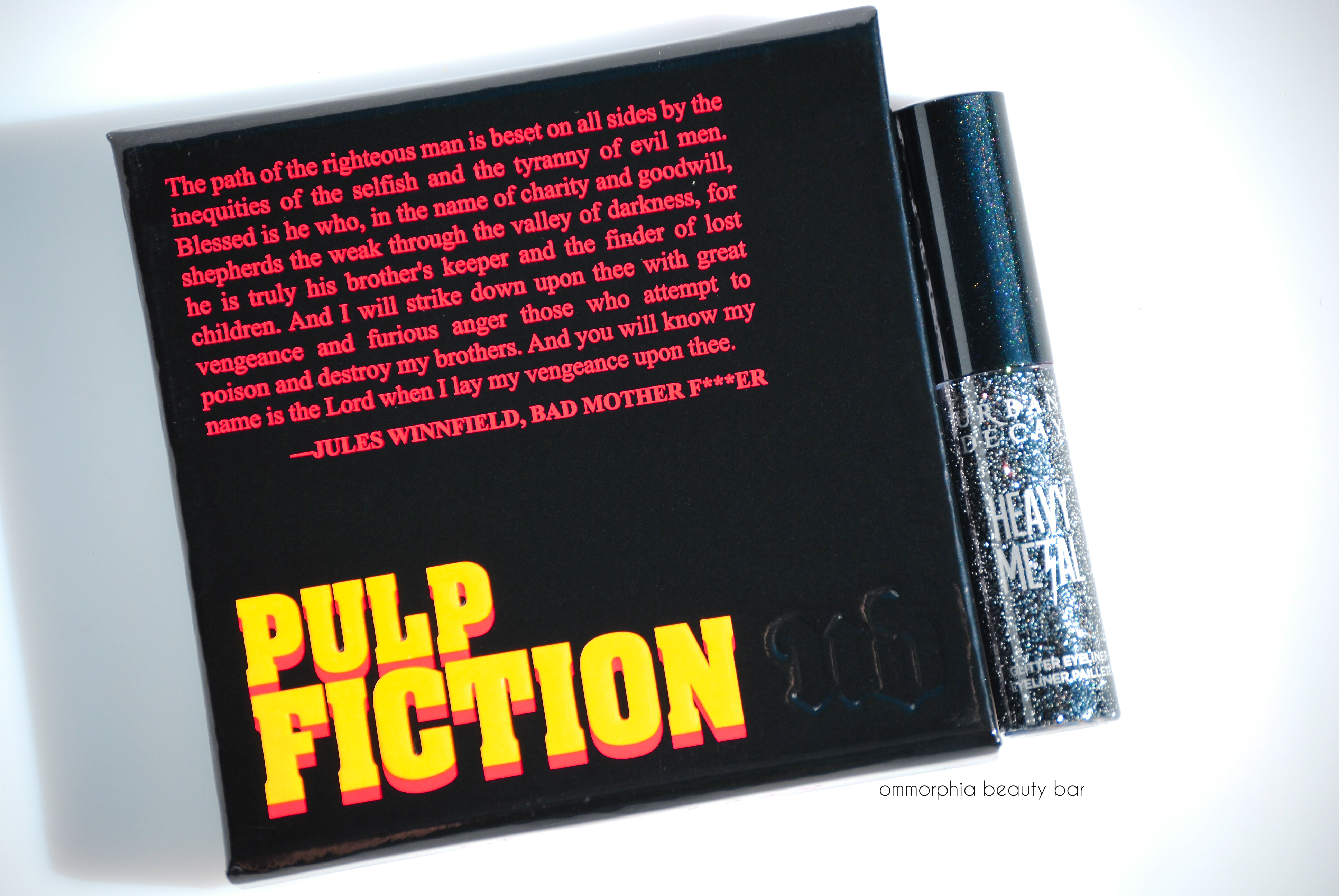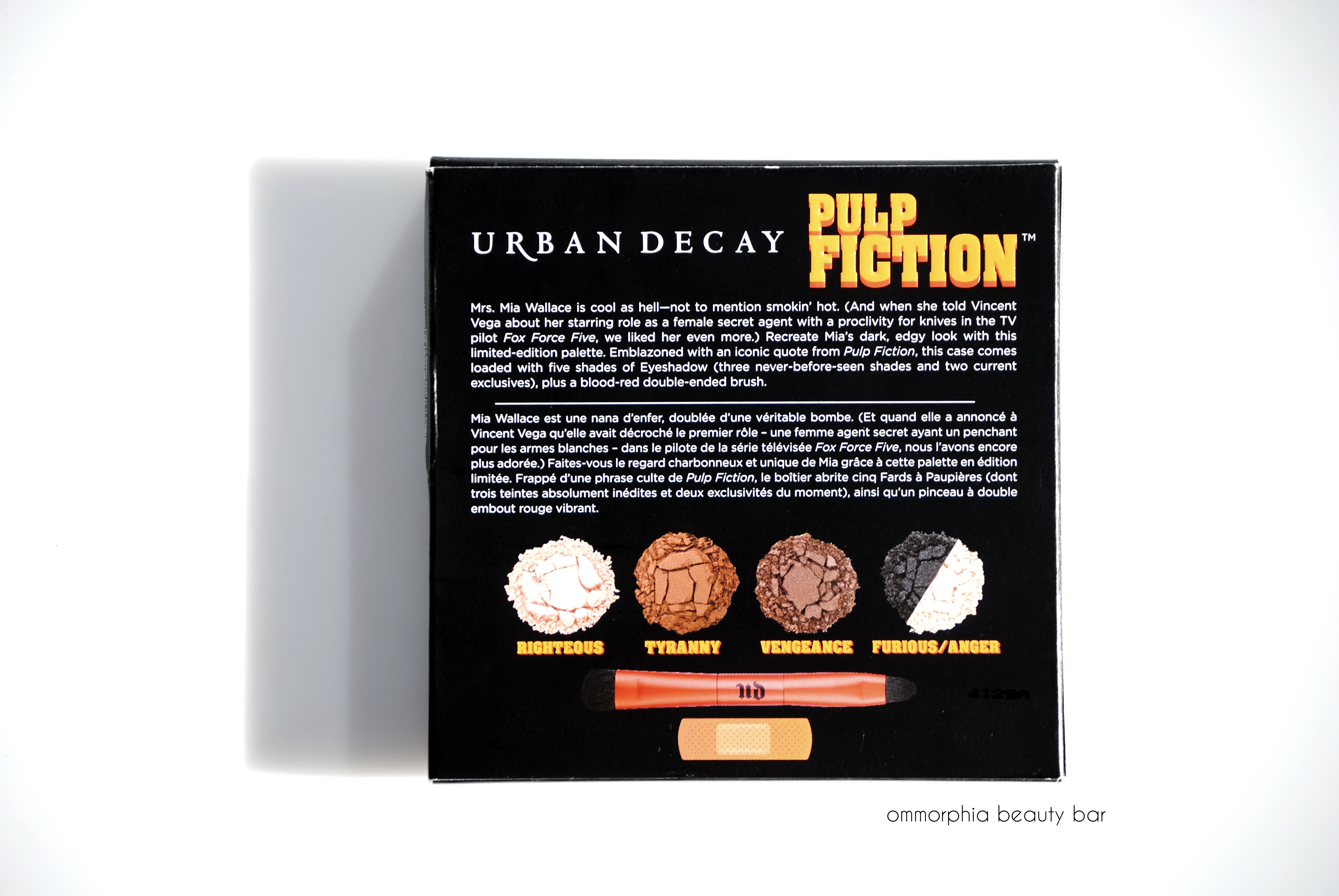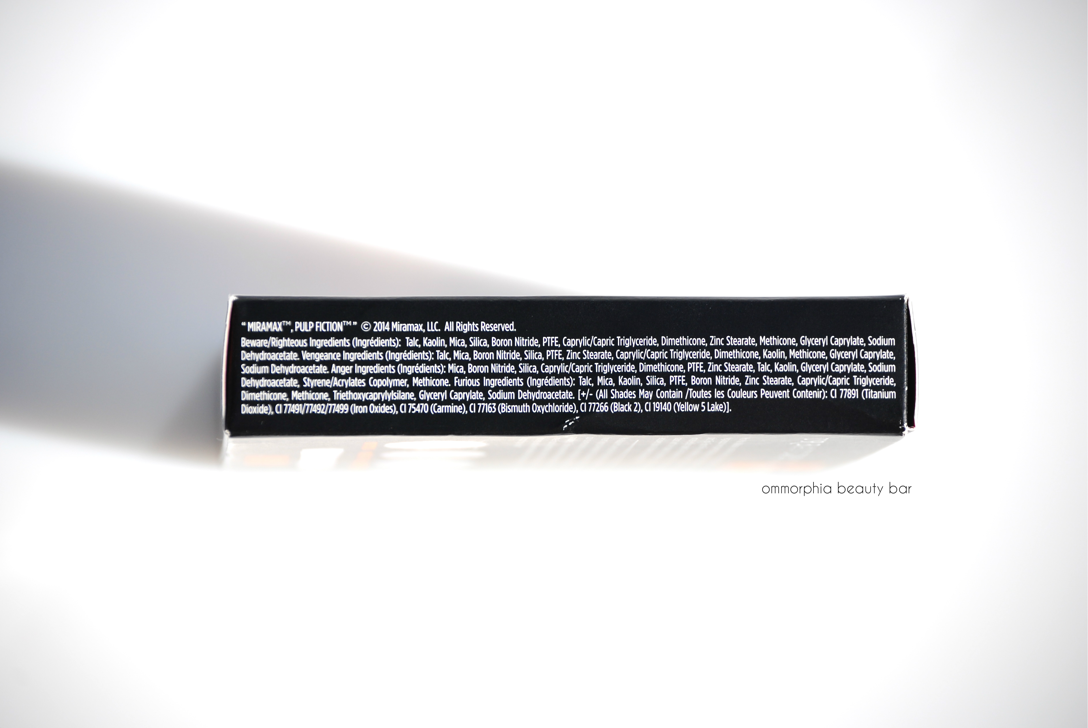 Worth noting with this collection, is the packaging; the exteriors all bear the iconic Pulp Fiction logo and even the interiors have not been neglected, printed with a bullet-riddled/blood-splattered design, along with excerpts from the film. The lipstick case for Mrs. Mia Wallace has also been given a new look, now in a shimmery gunmetal finish instead of the usual pewter. It’s the little details like this, that always just get me.