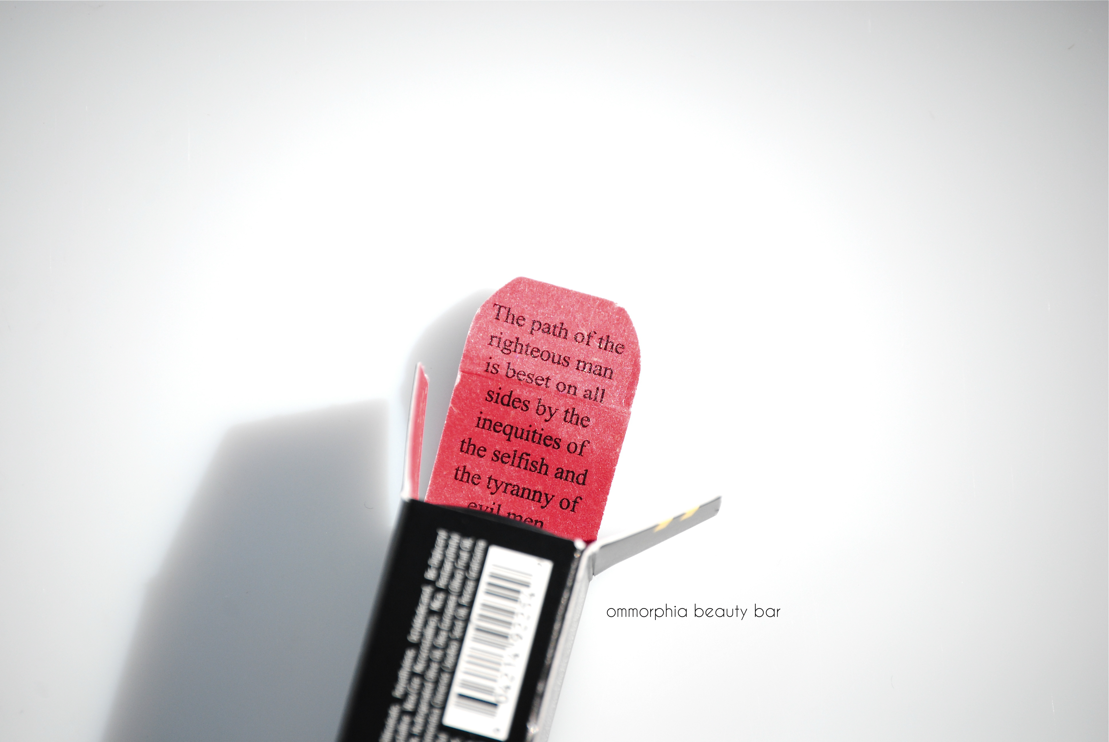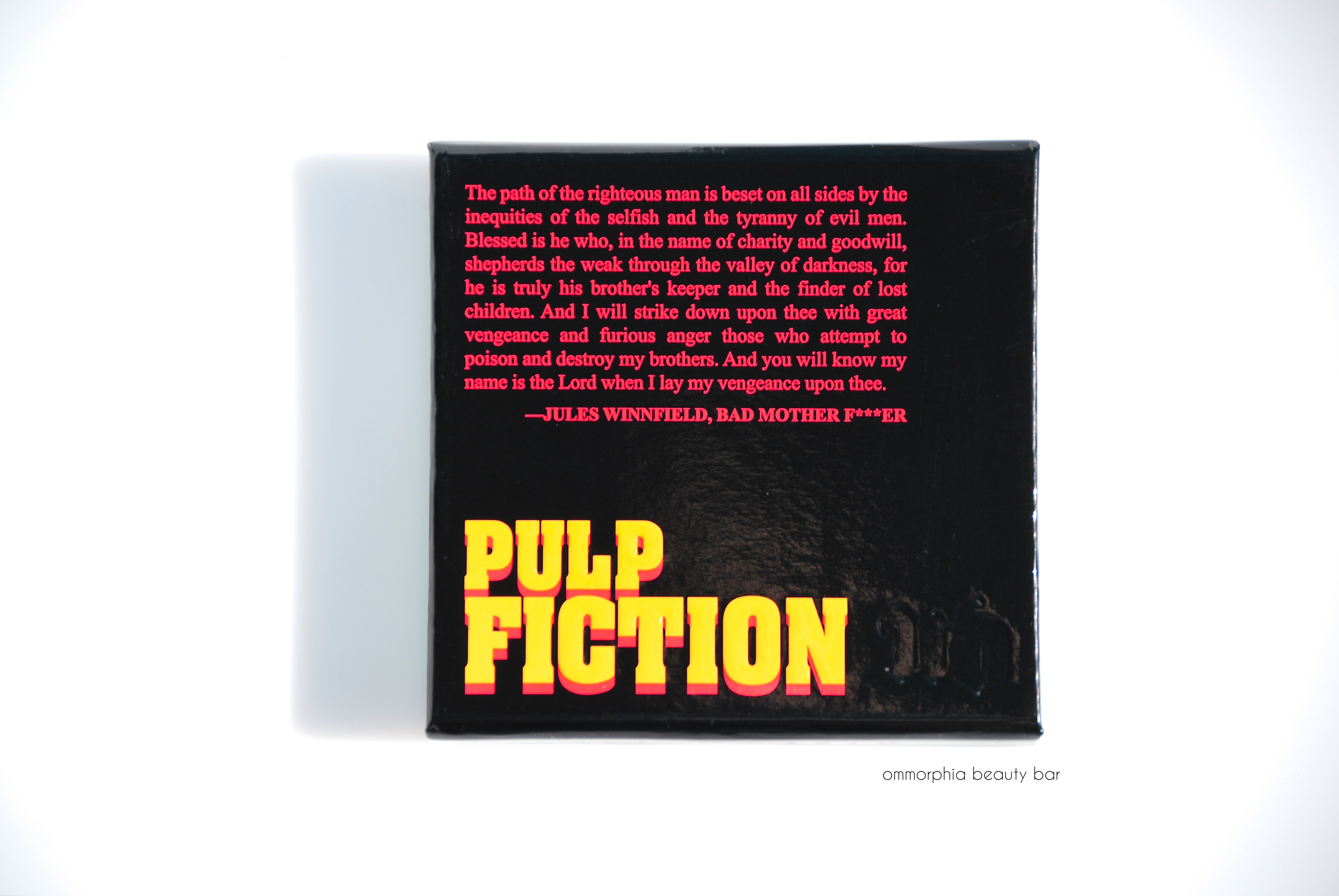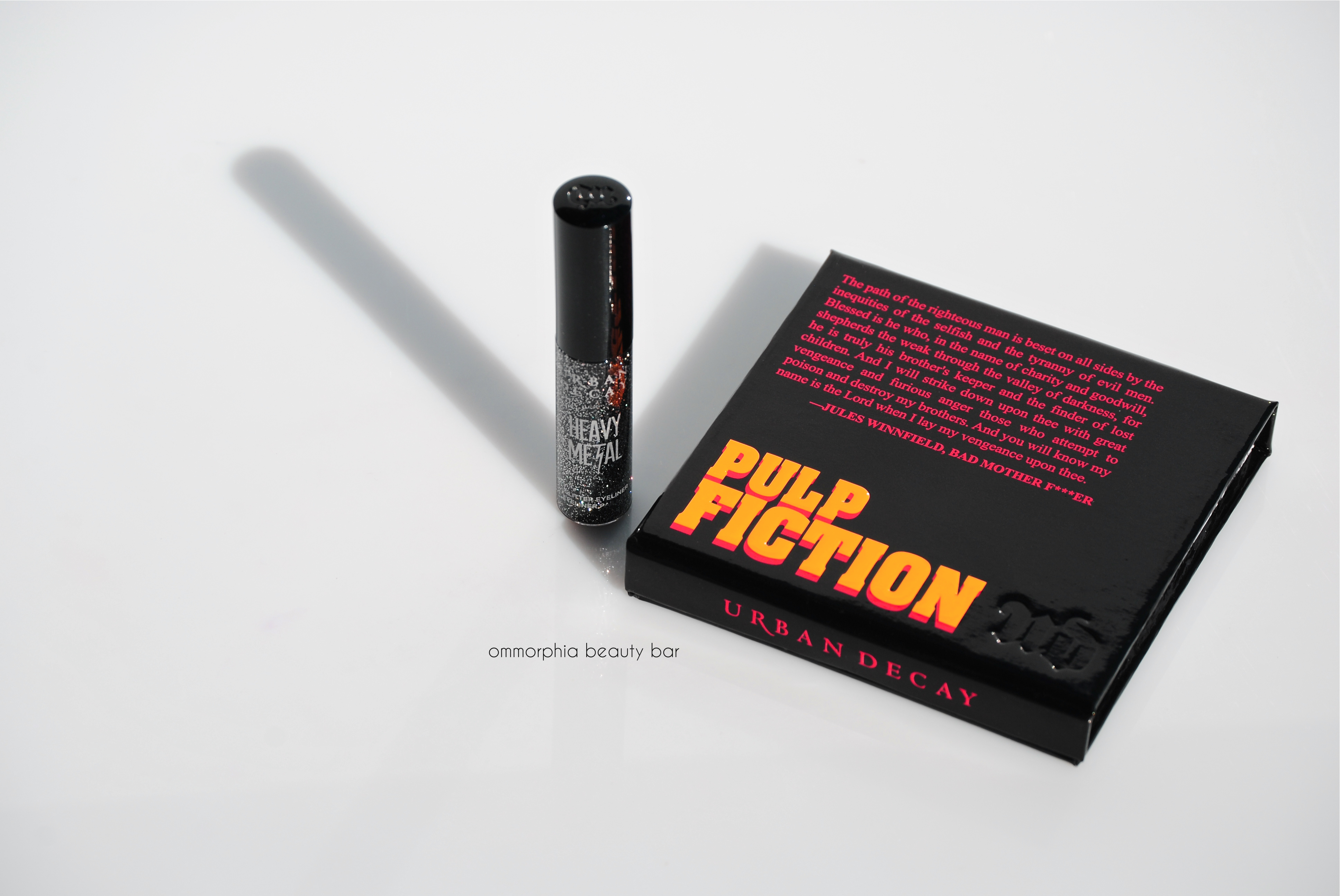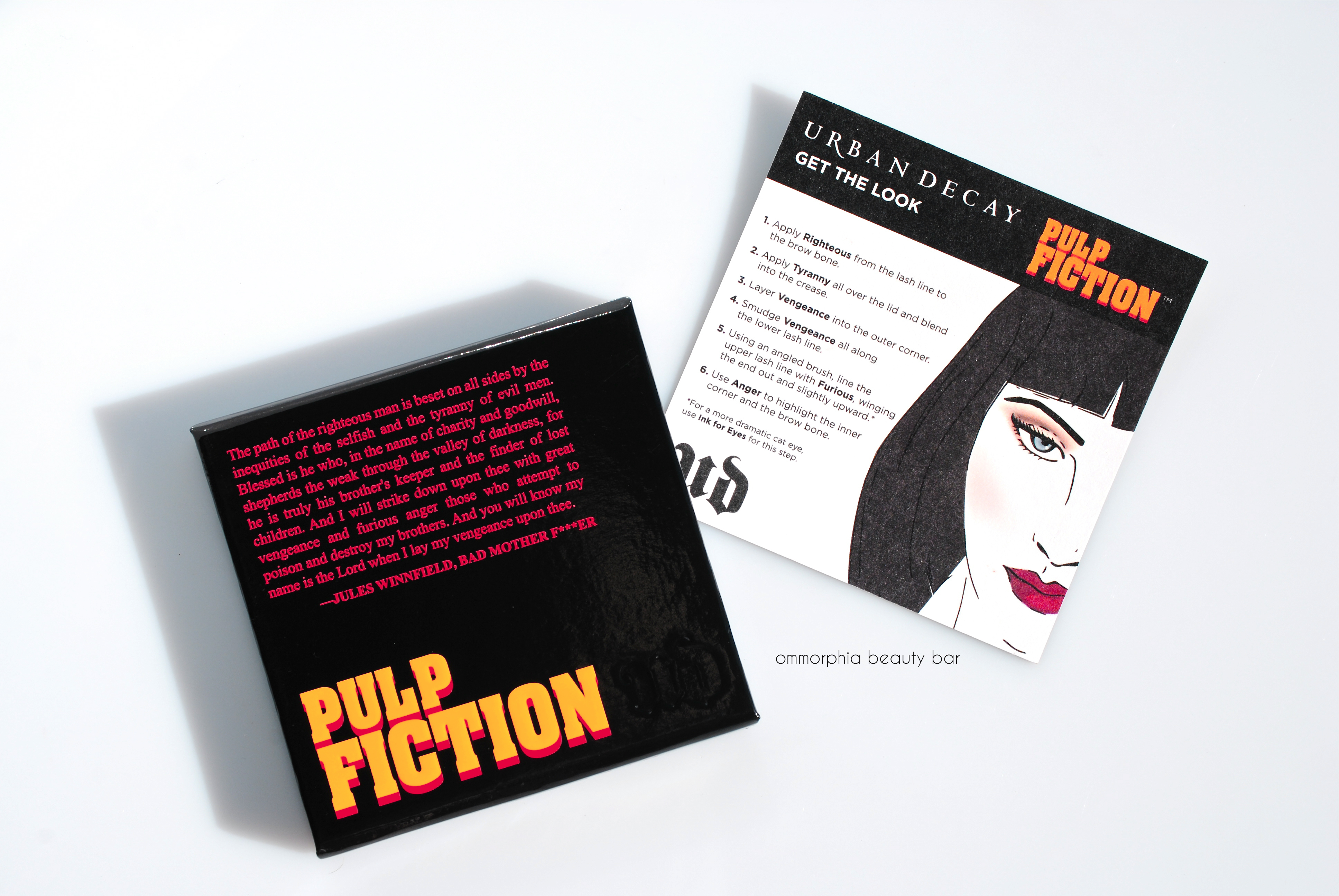Worth noting with this collection, is the packaging; the exteriors all bear the iconic Pulp Fiction logo and even the interiors have not been neglected, printed with a bullet-riddled/blood-splattered design, along with excerpts from the film. The lipstick case for Mrs. Mia Wallace has also been given a new look, now in a shimmery gunmetal finish instead of the usual pewter. It’s the little details like this, that always just get me.