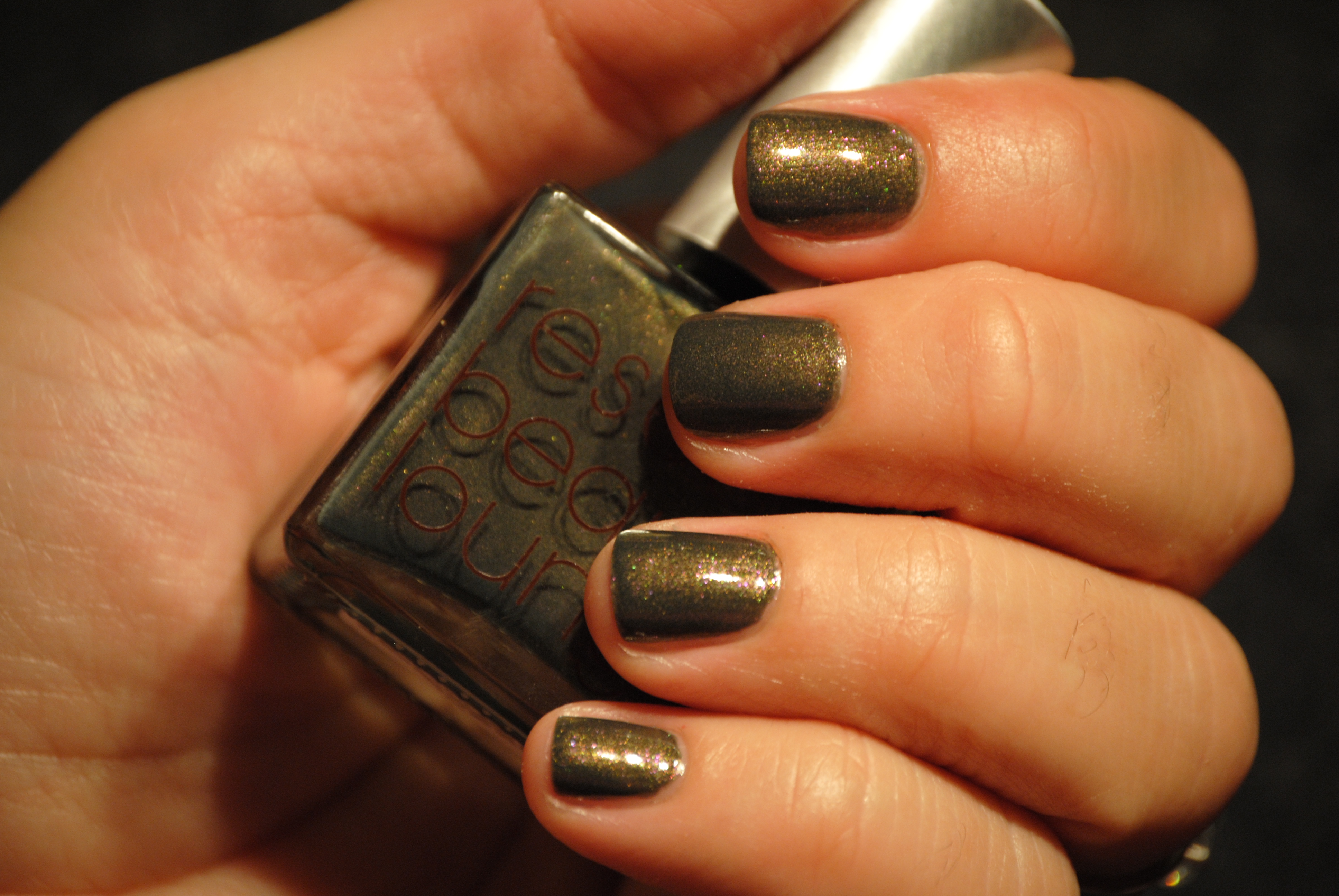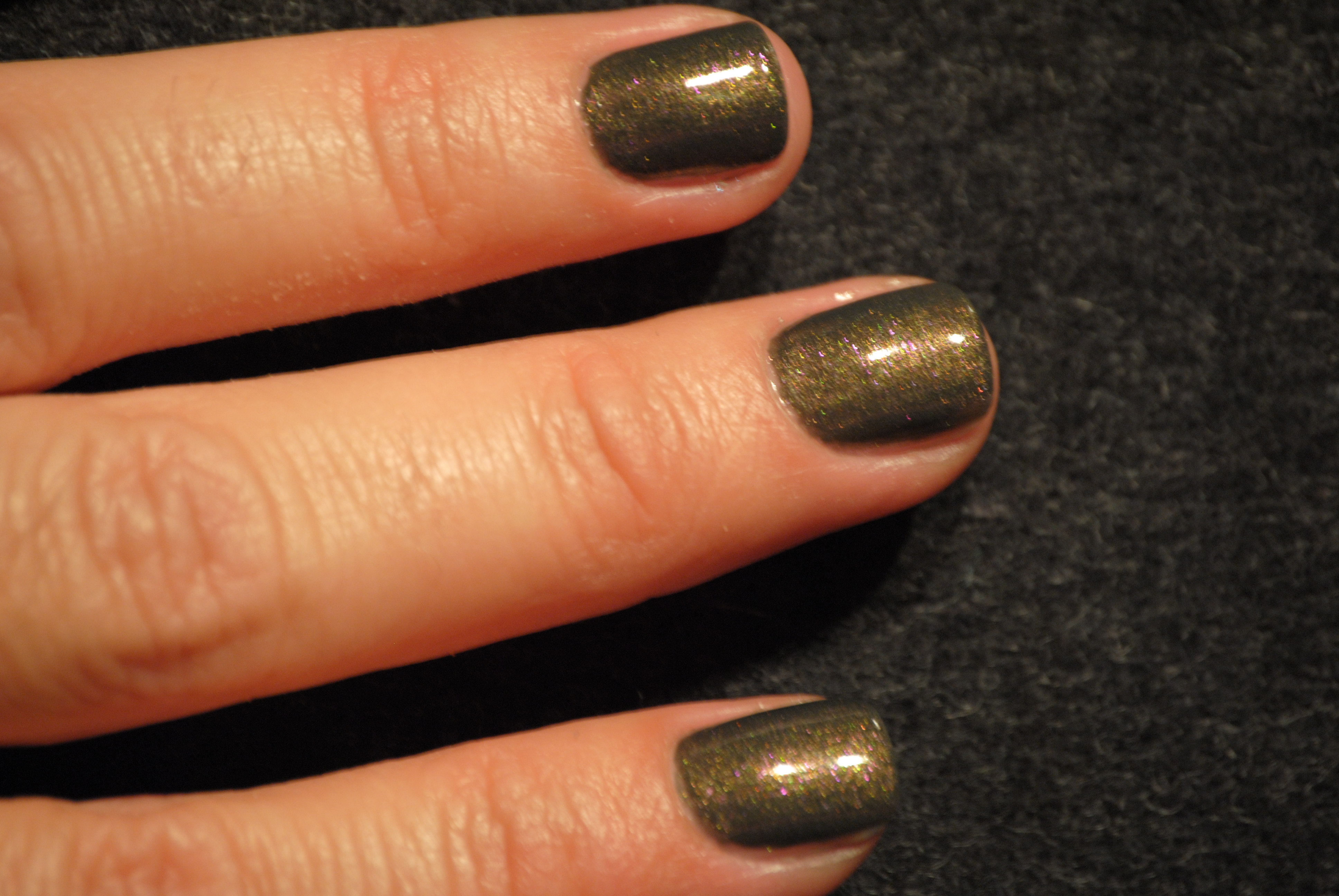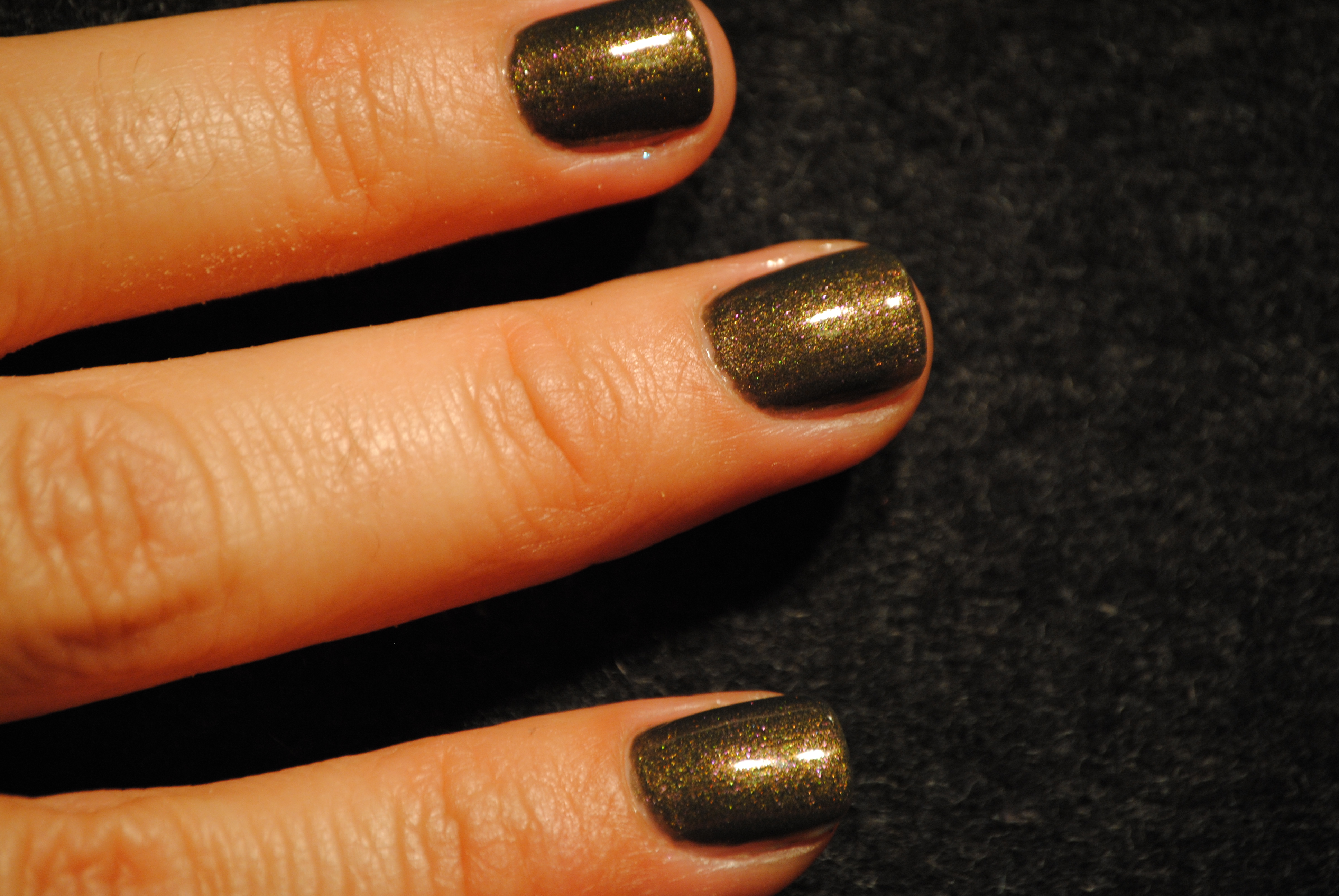 Seen in natural lighting, the shade is not only seemingly brighter but has an almost greenish cast to it. It is an excellent alternative to all the dark polishes we’ve been seeing lately, without having a heavy ‘bling’ factor. Under artificial lighting, there is a deeper bronze hue that comes out, lending it a richness which is perfectly in keeping with the ‘Tudor’ theme of the collection….bring on the brocade & velvets!