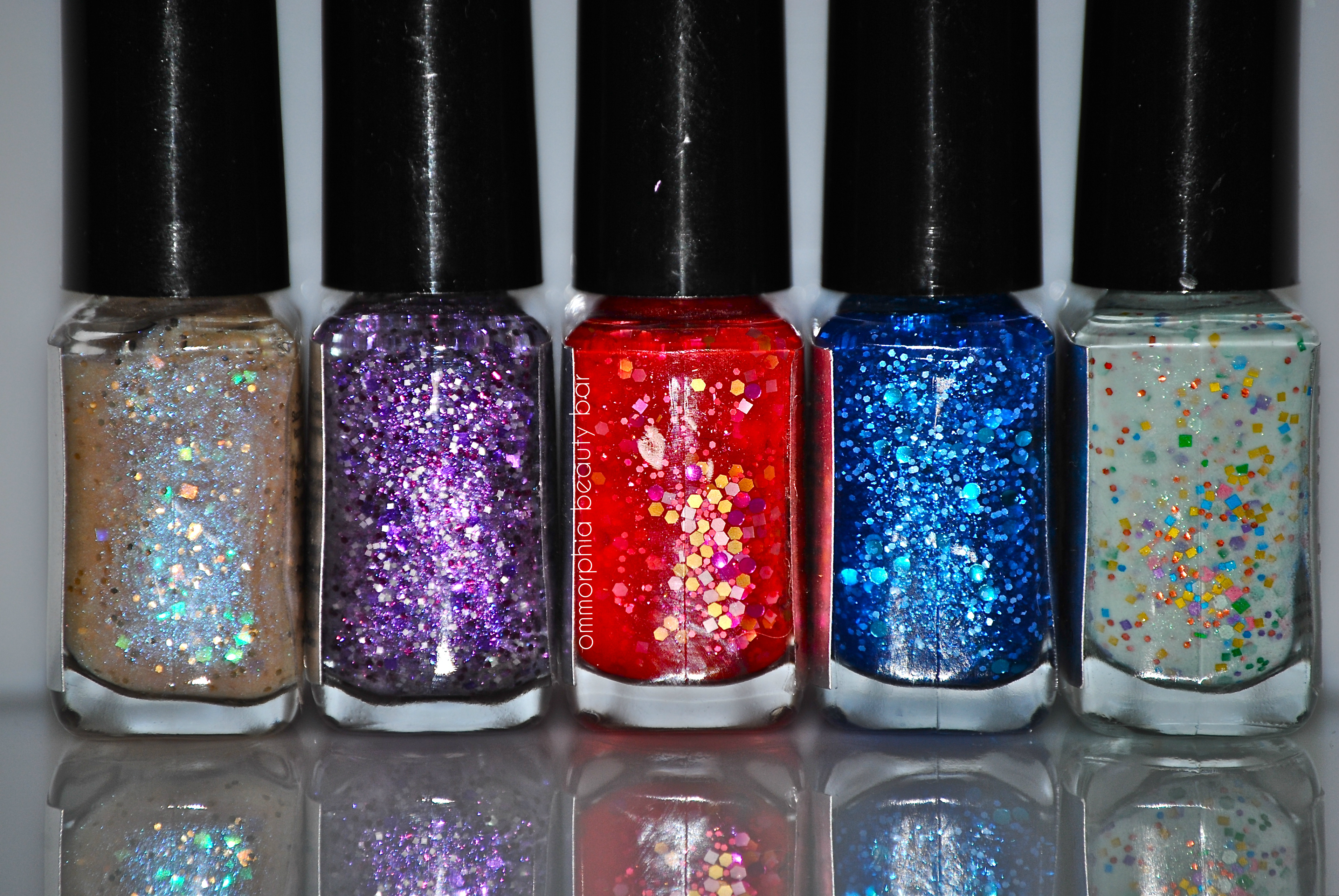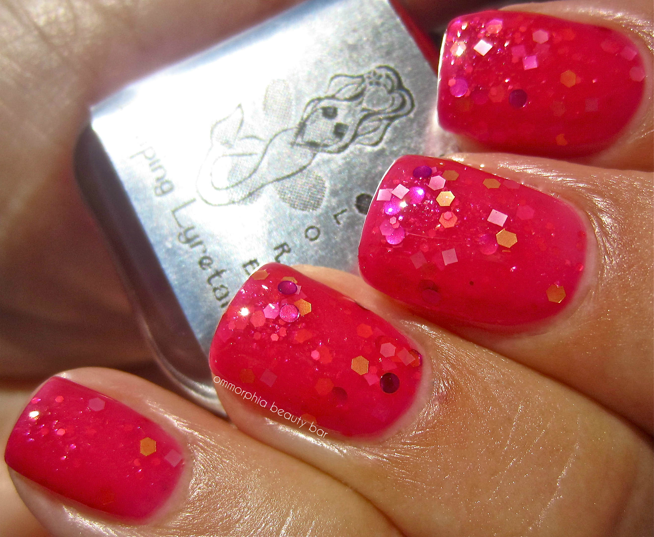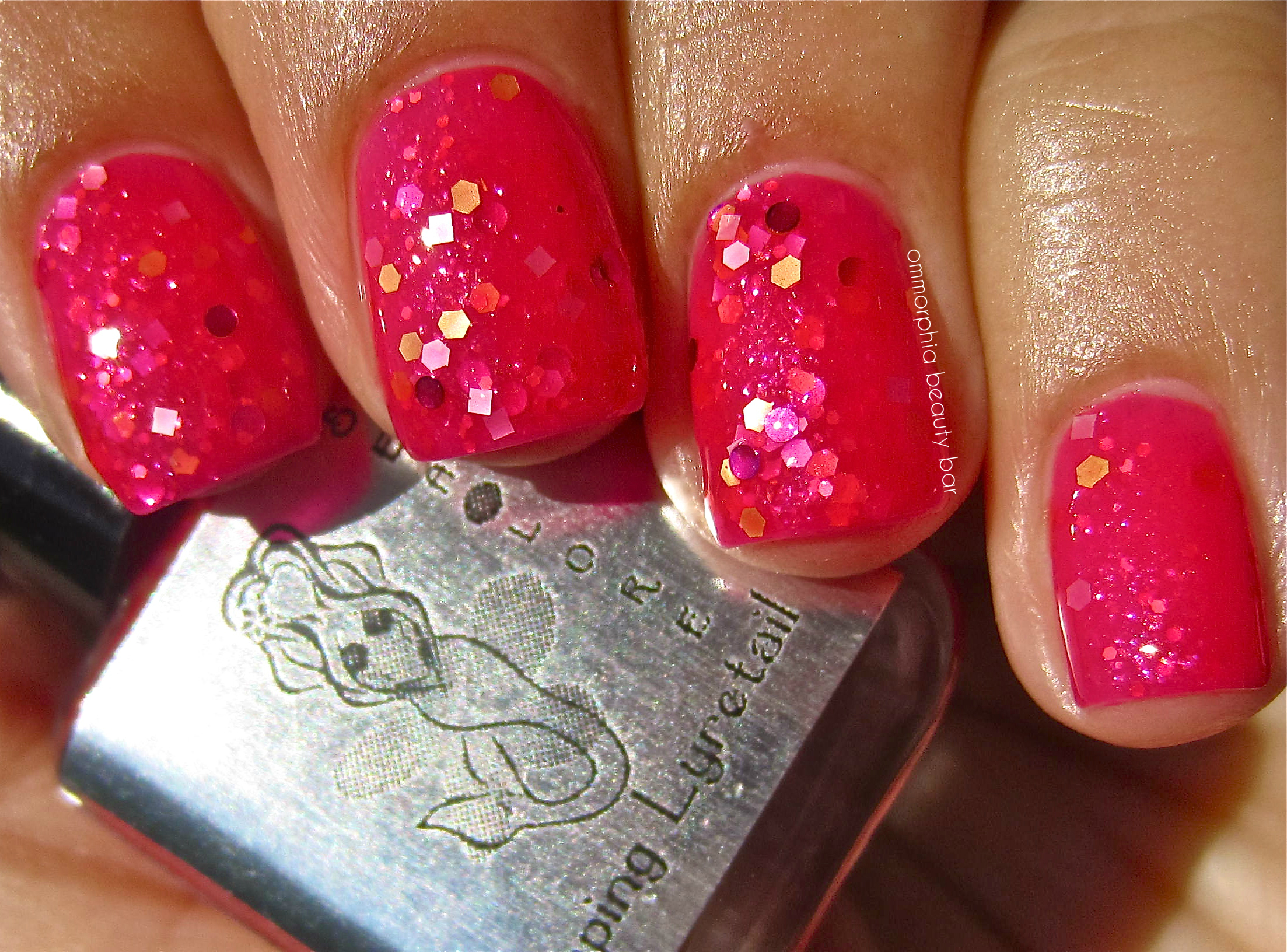 Leaping Lyretail – a sheer-esque strawberry red base hue with darker pink undertones, loaded with matte gold hexagonal glitter, matte silver square glitter, metallic magenta round glitter as well as more the same varieties in micro glitter form scattered throughout. Jelly-like in tone (and appearance), this shade can definitely be layered for more depth and to bring out each individual form, but I prefer it undiluted and with this slightly diffused look. Note: barest hint of staining may be possible – apply a base coat prior. Coats applied: 3 thin, plus top coat